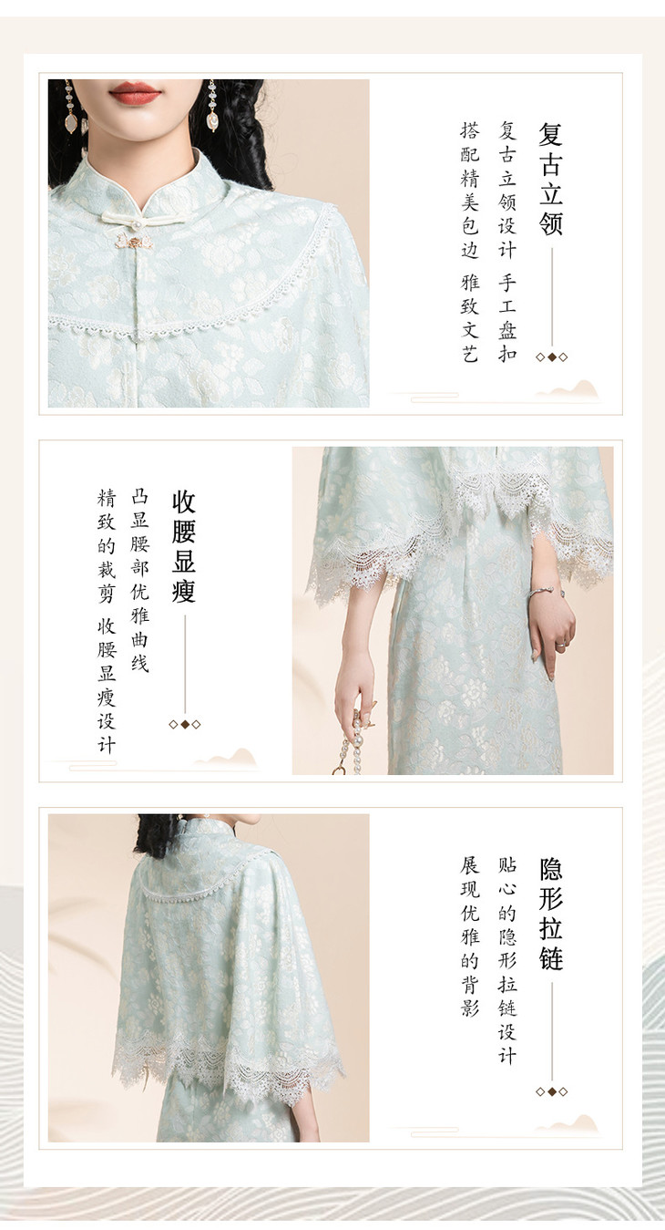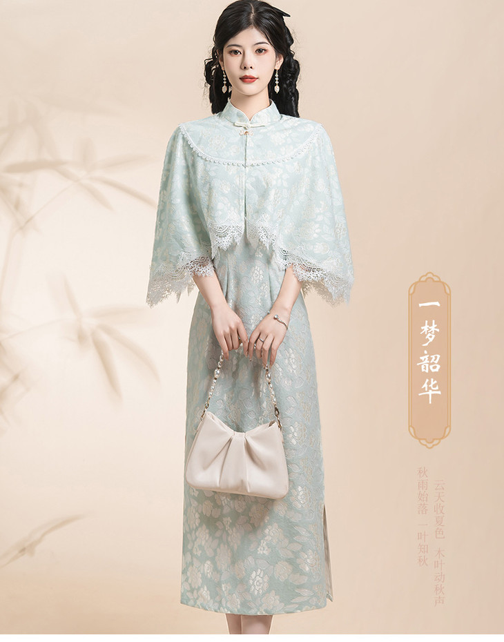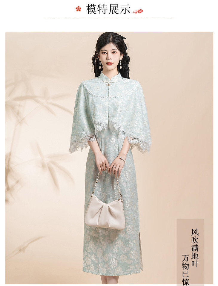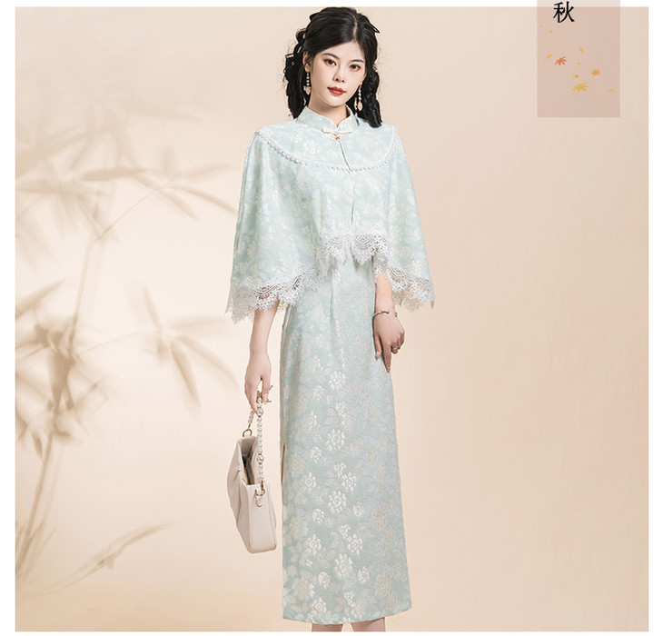 蓝色小清新旗袍,气质少女披肩套装改良KK0801