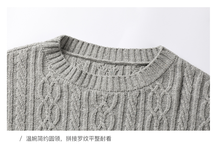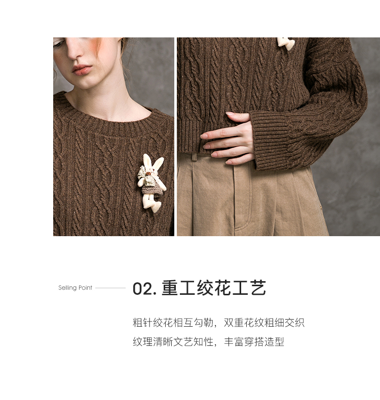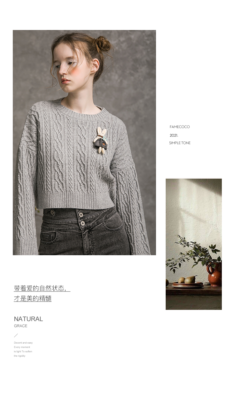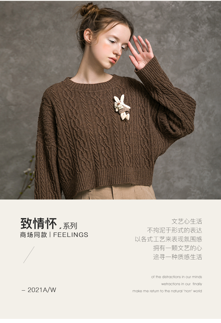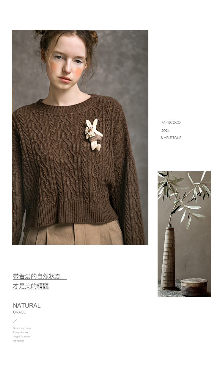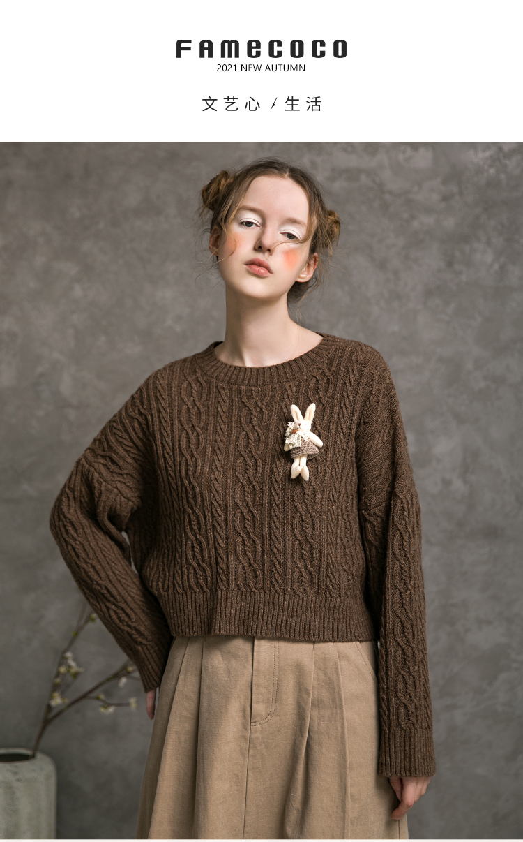 famecoco范可儿圆领毛衣女士绞花肌理短款宽松羊毛上衣F216DB011