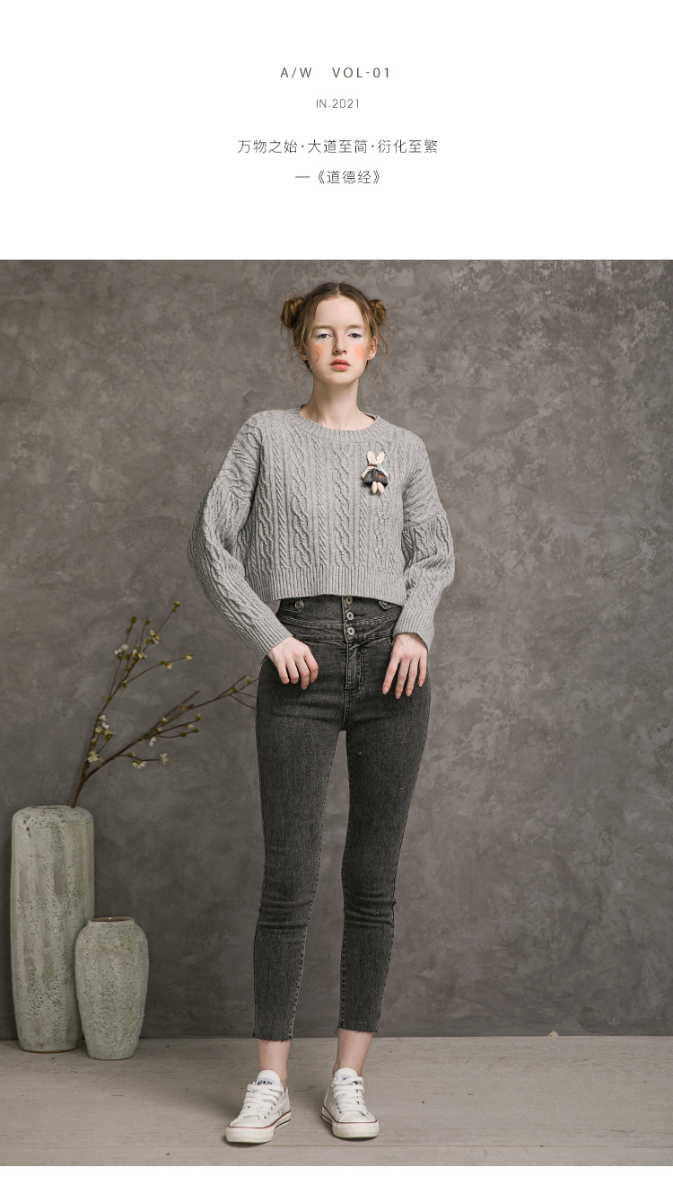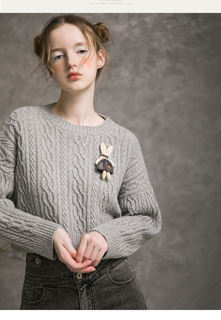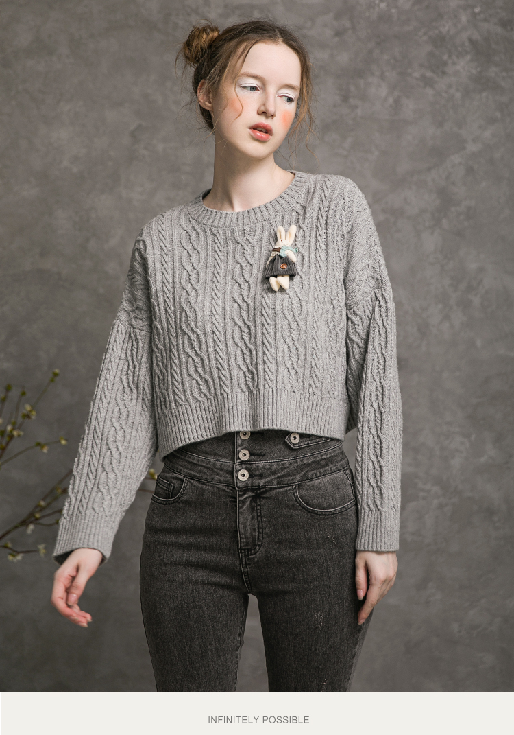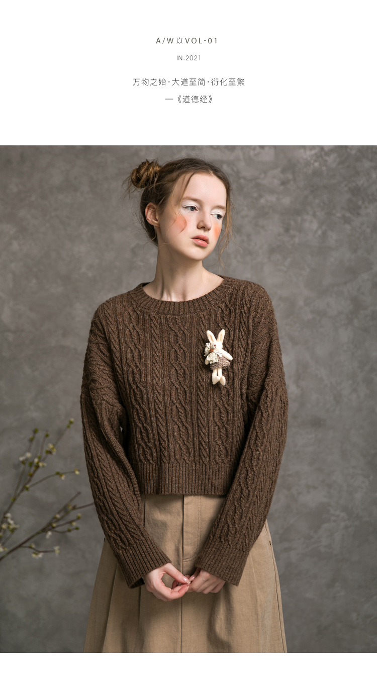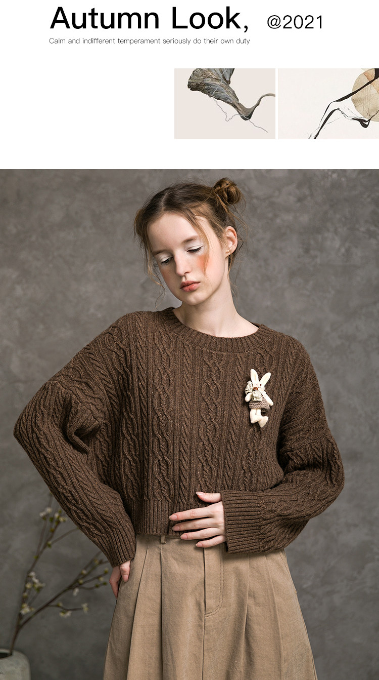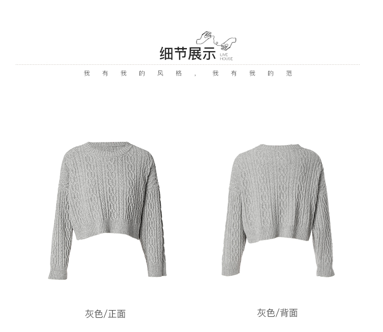 famecoco范可儿圆领毛衣女士绞花肌理短款宽松羊毛上衣F216DB011