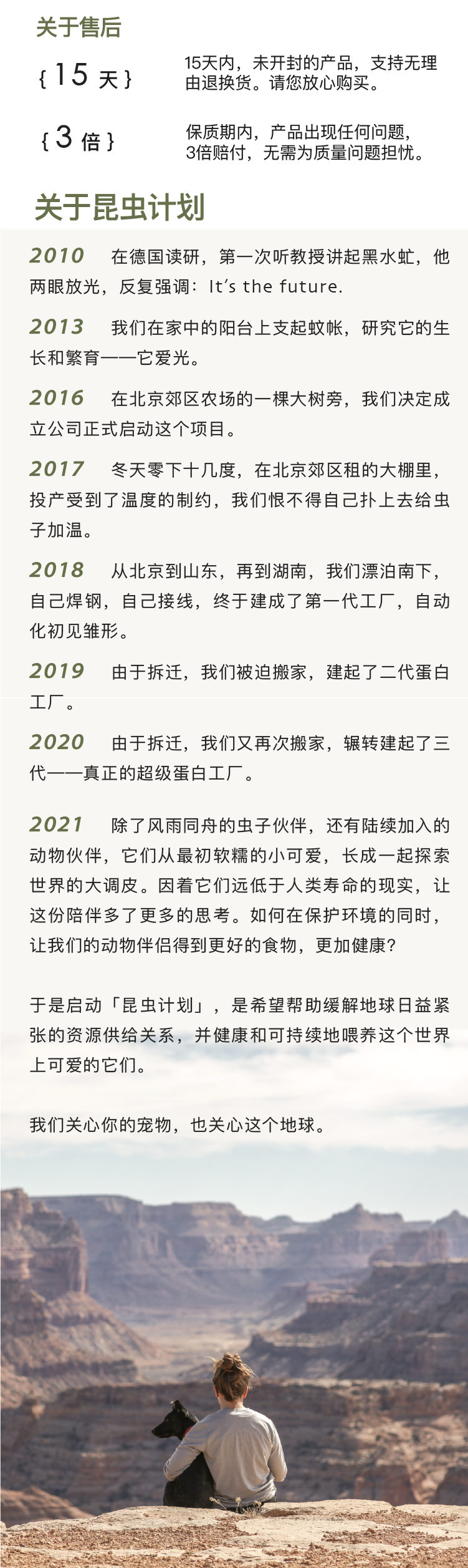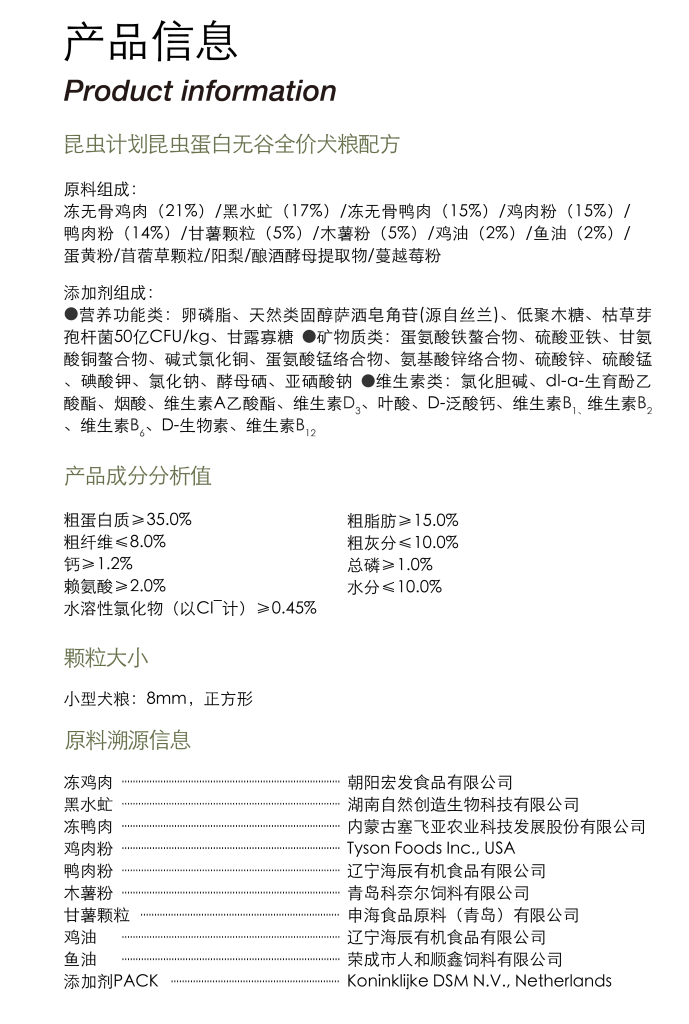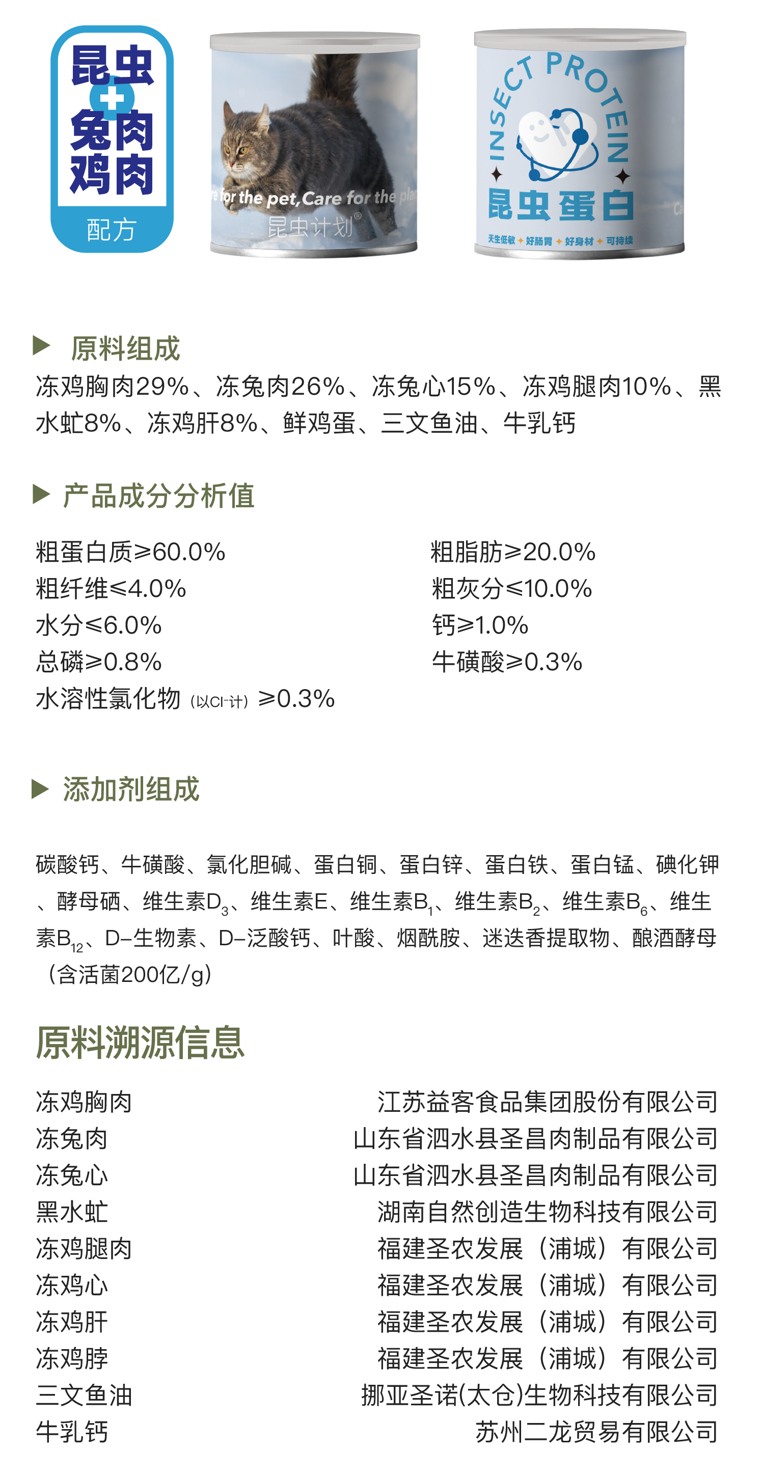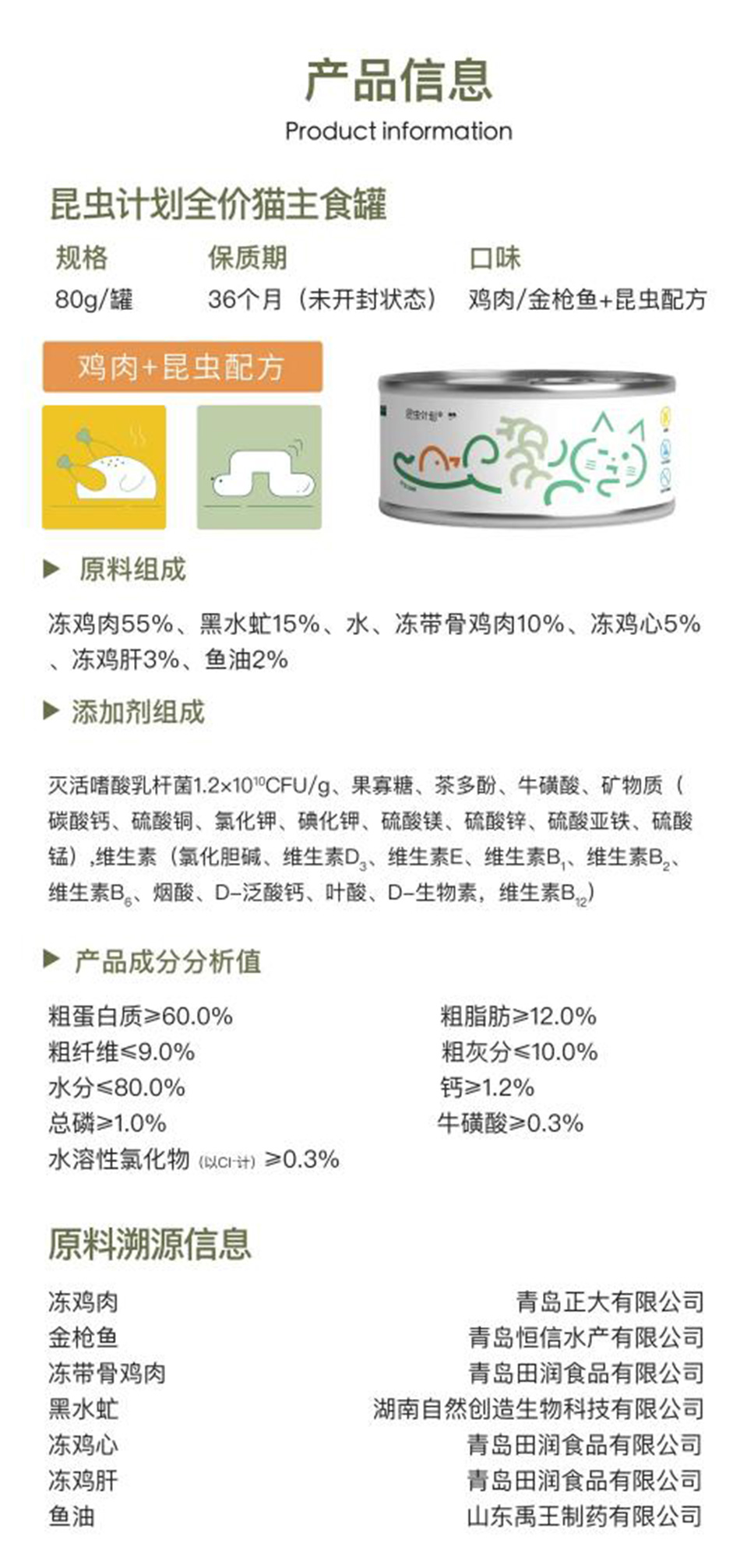 【配方】: 猫粮:80%动物原料,40%蛋白含量;22%黑水虻昆虫蛋白 犬粮:86%动物原料,35%蛋白含量;17%黑水虻昆虫蛋白 【保质期】:18个月