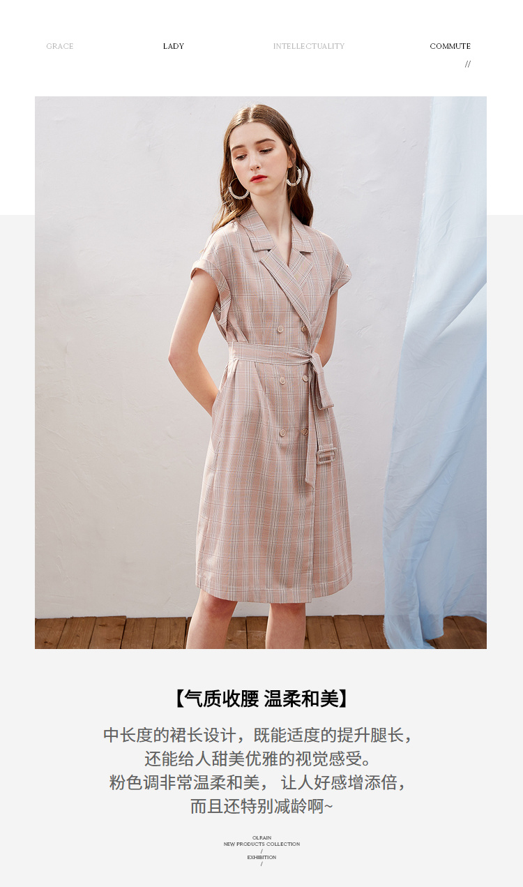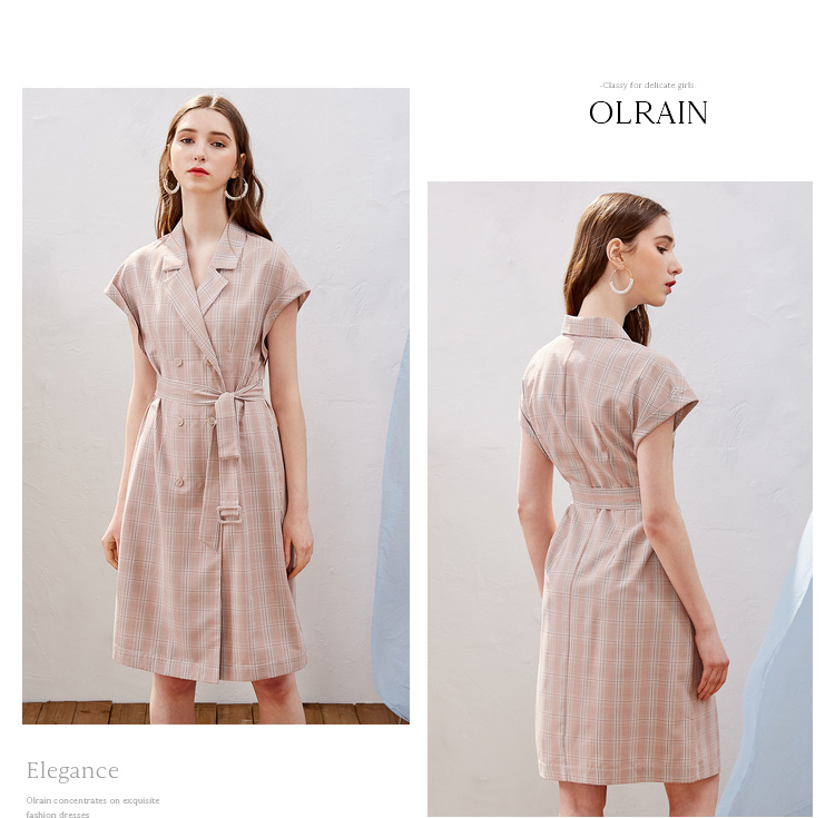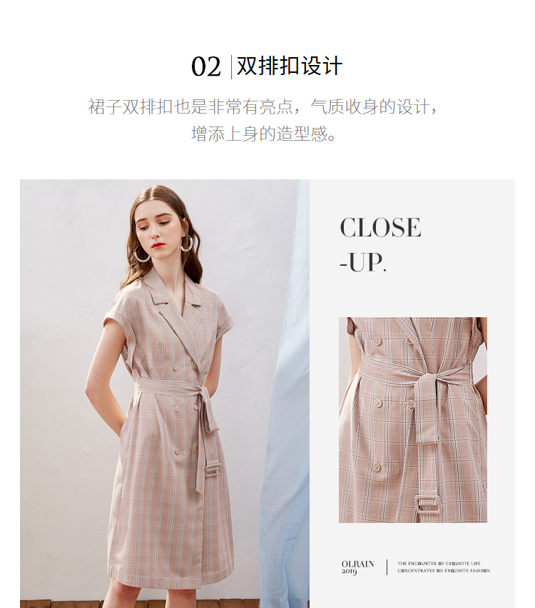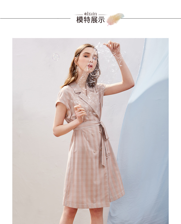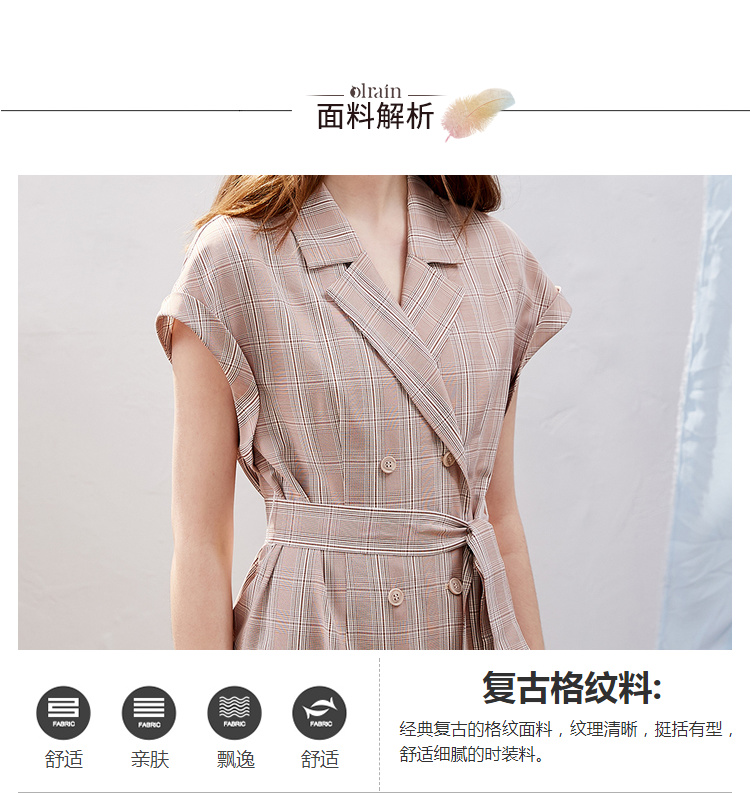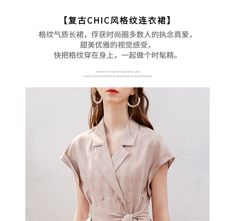欧芮儿2019新款女装夏装插肩袖格子连衣裙女中长款西装领女裙子