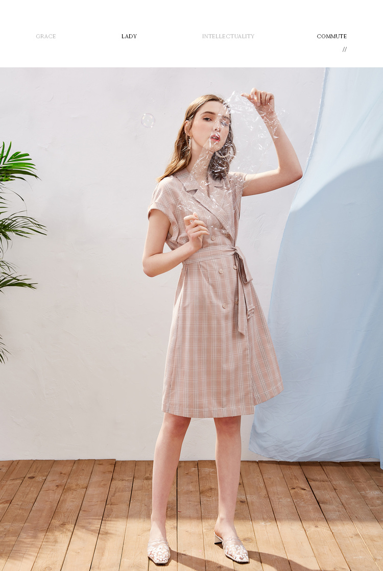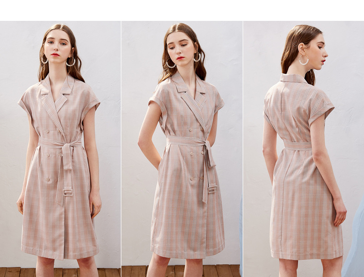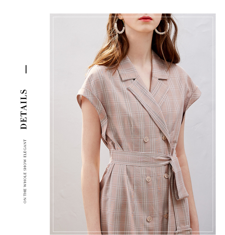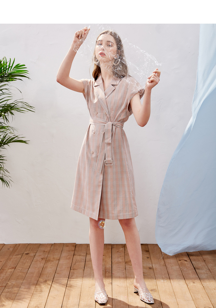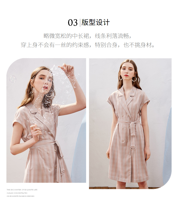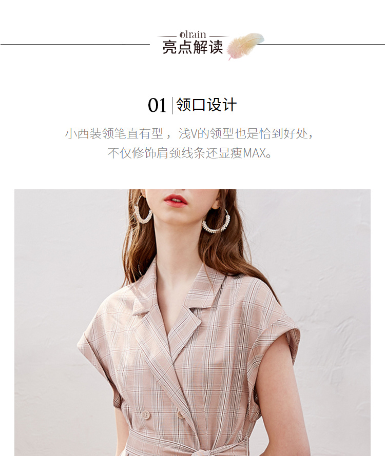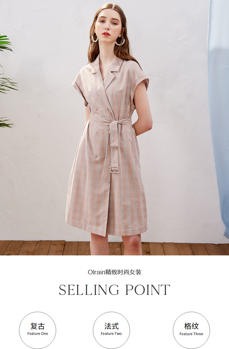 欧芮儿2019新款女装夏装插肩袖格子连衣裙女中长款西装领女裙子