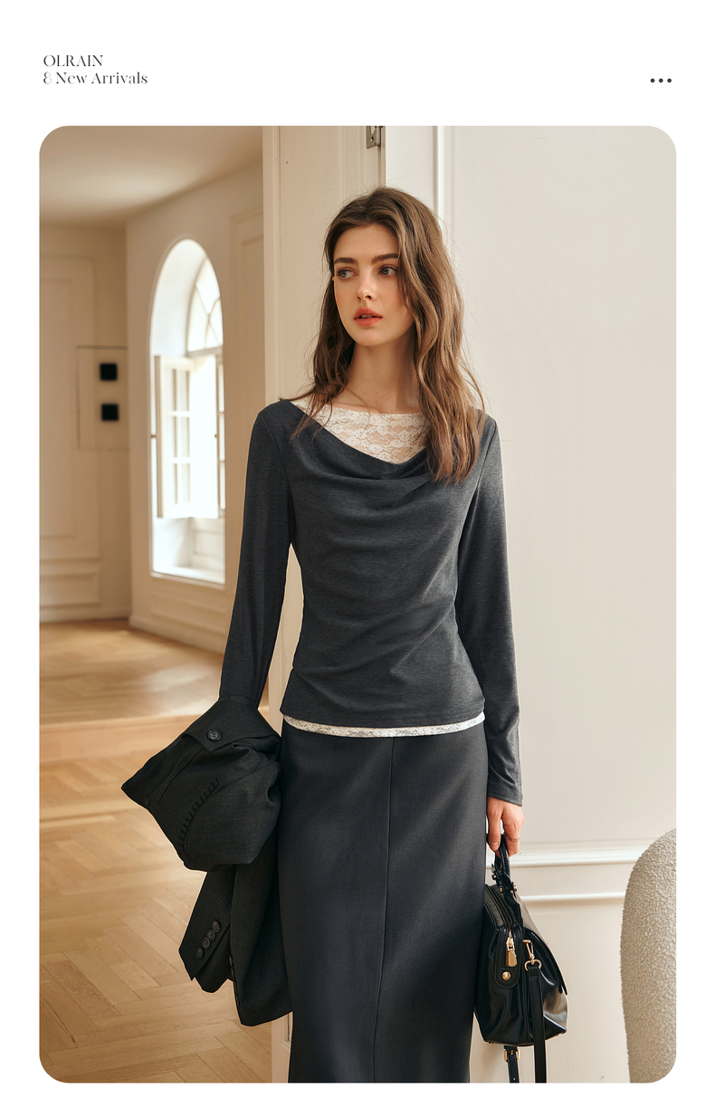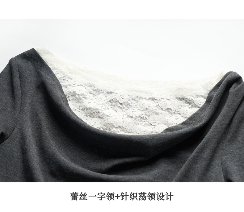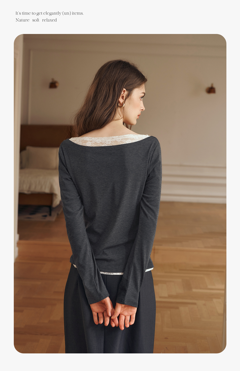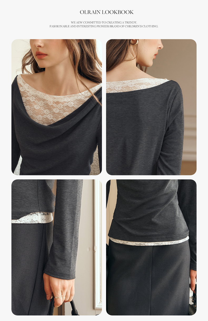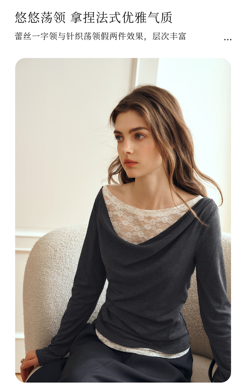 OLrain欧芮儿灰色长袖T恤女冬季2024新款蕾丝一字肩荡领双层上衣