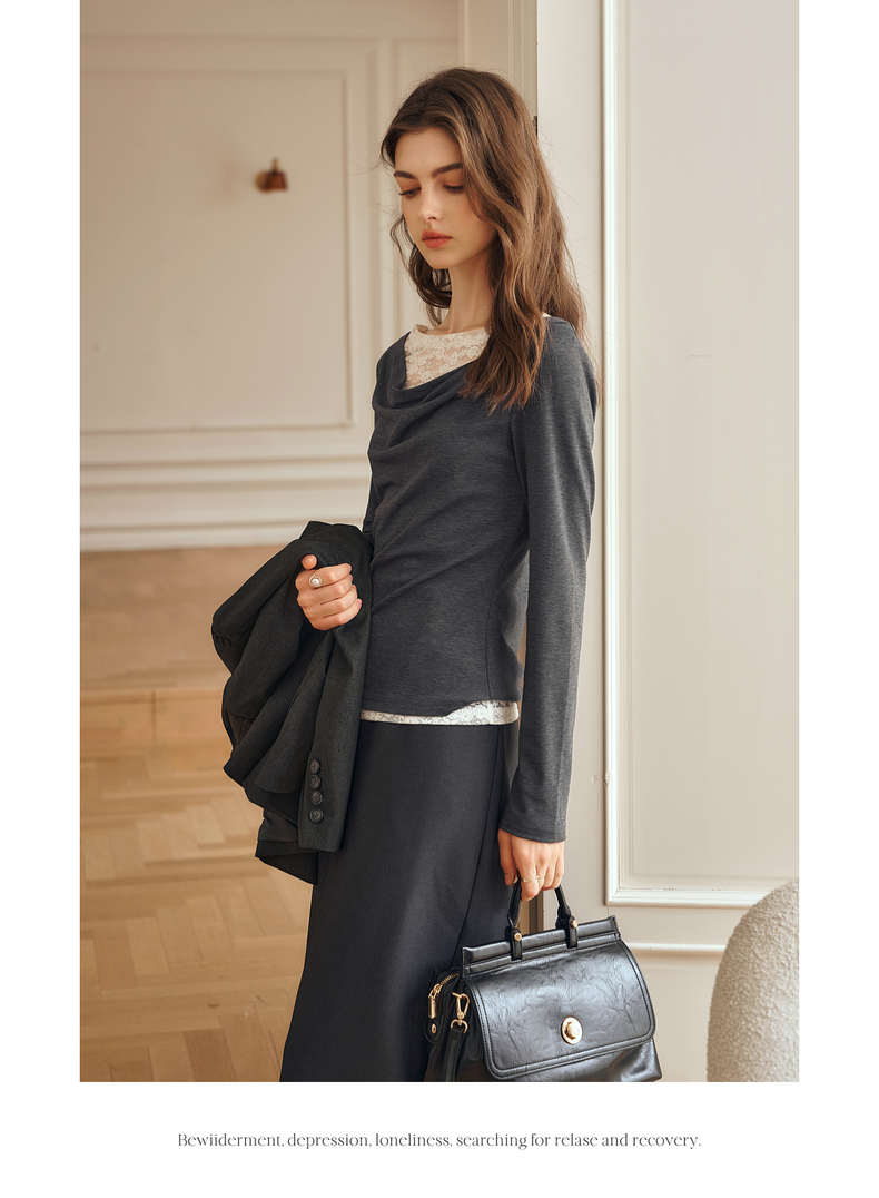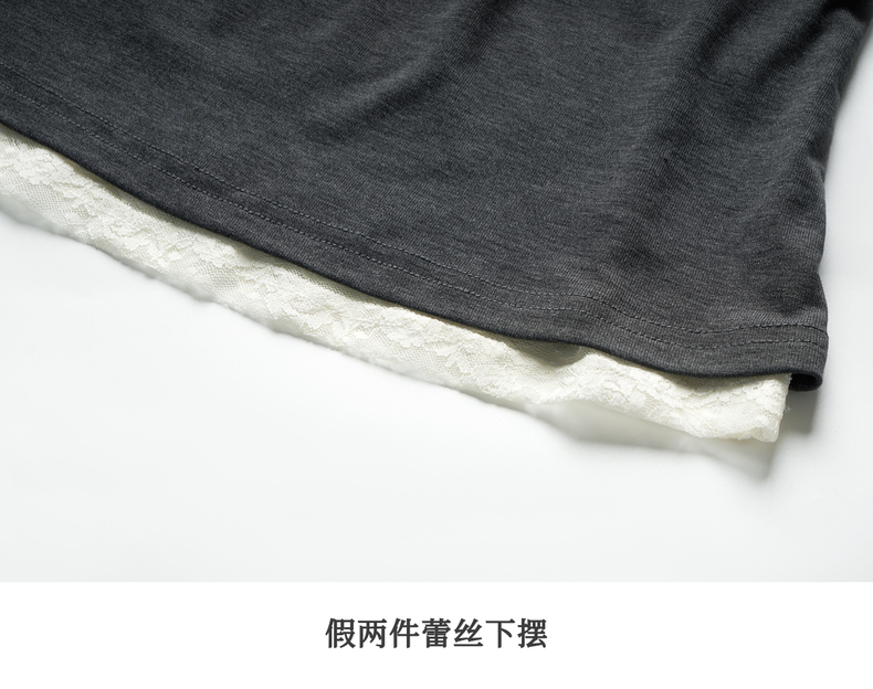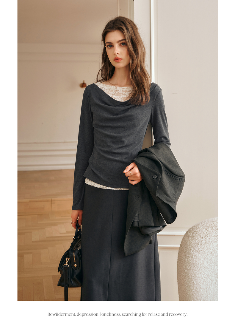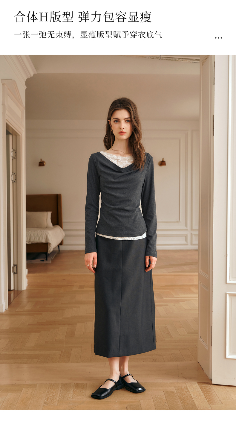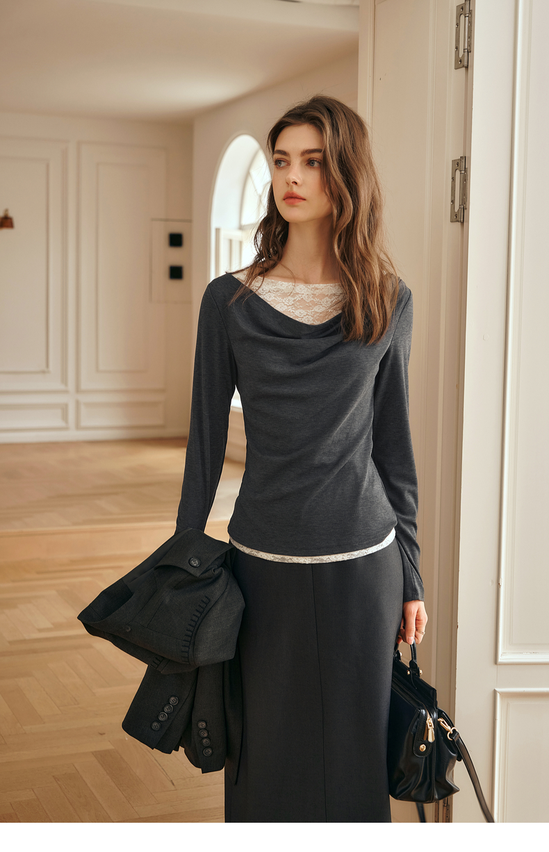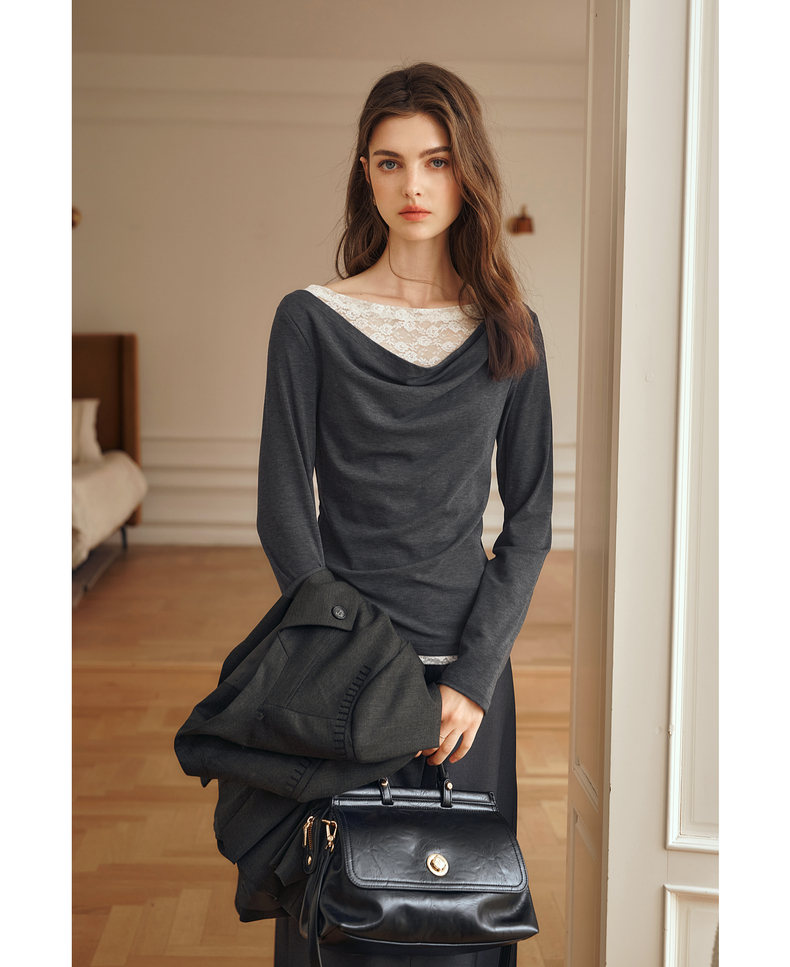 OLrain欧芮儿灰色长袖T恤女冬季2024新款蕾丝一字肩荡领双层上衣
