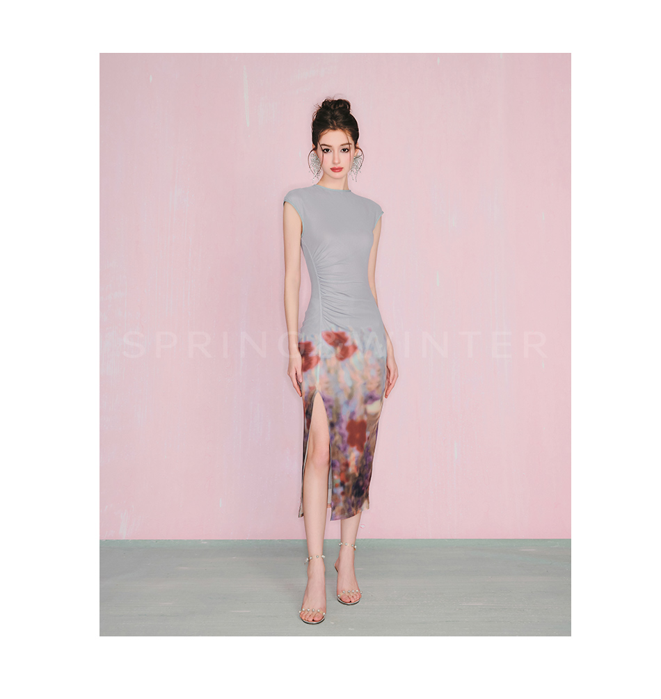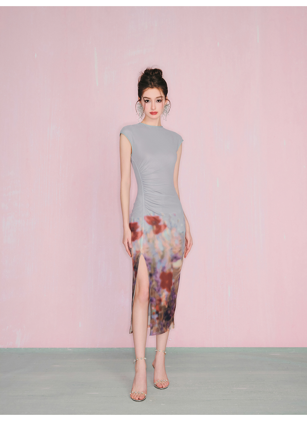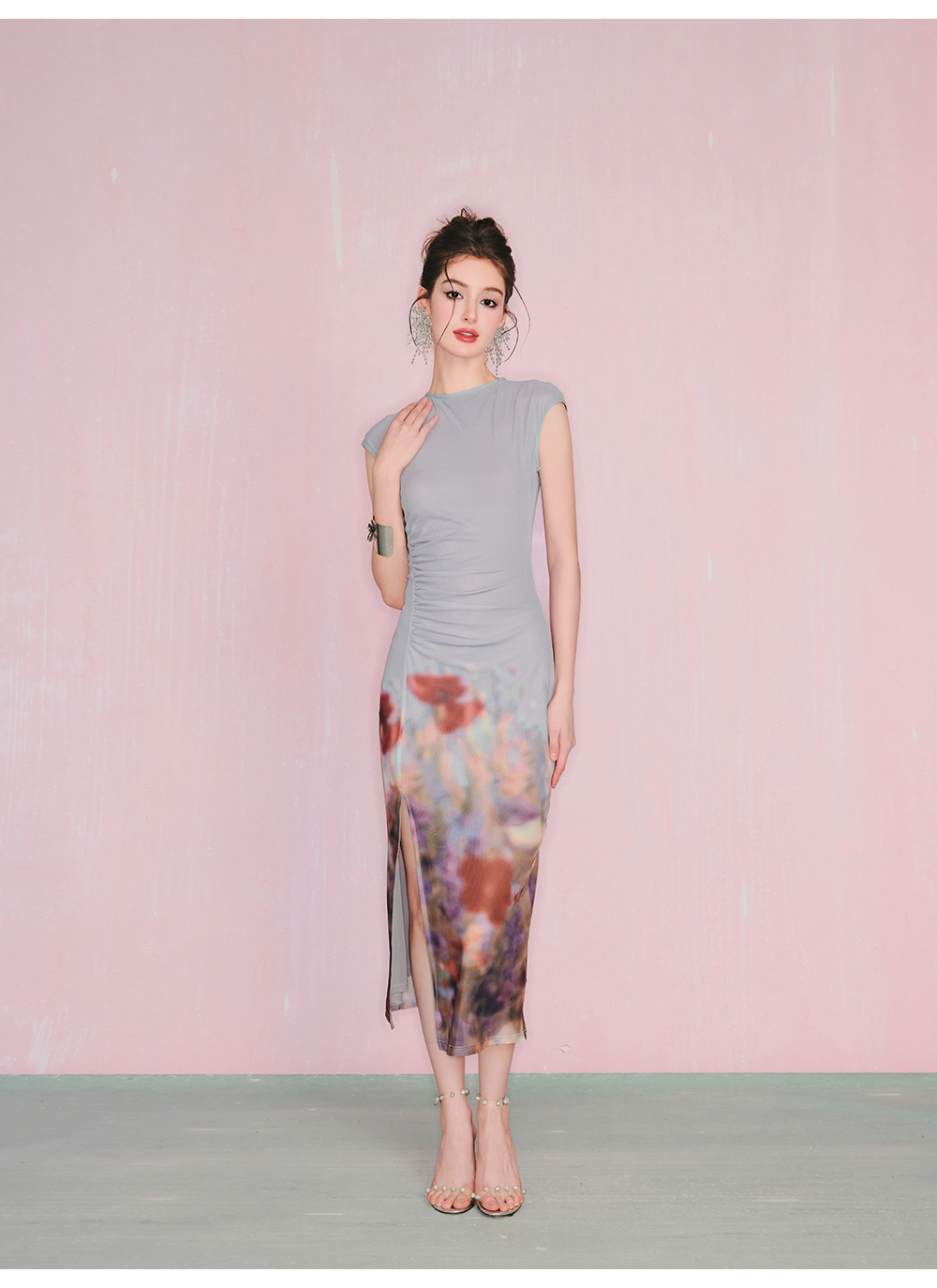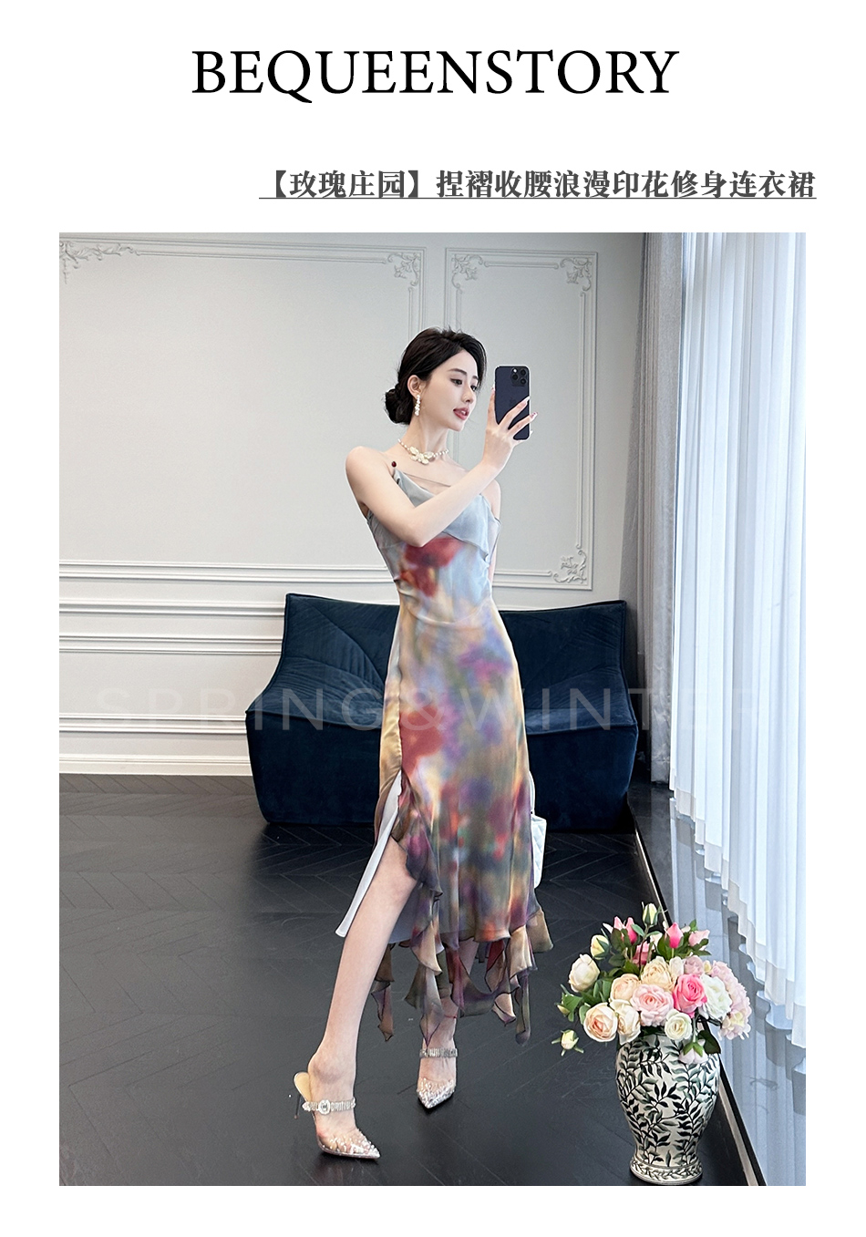 余潇潇【玫瑰庄园】舒适时尚捏褶收腰浪漫印花修身连衣裙
