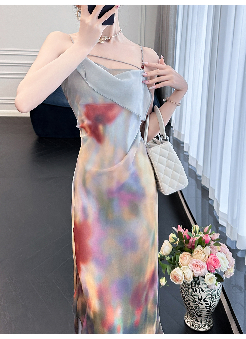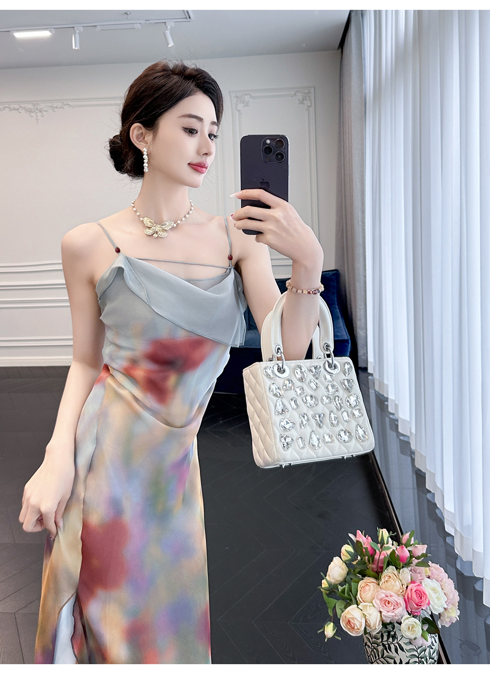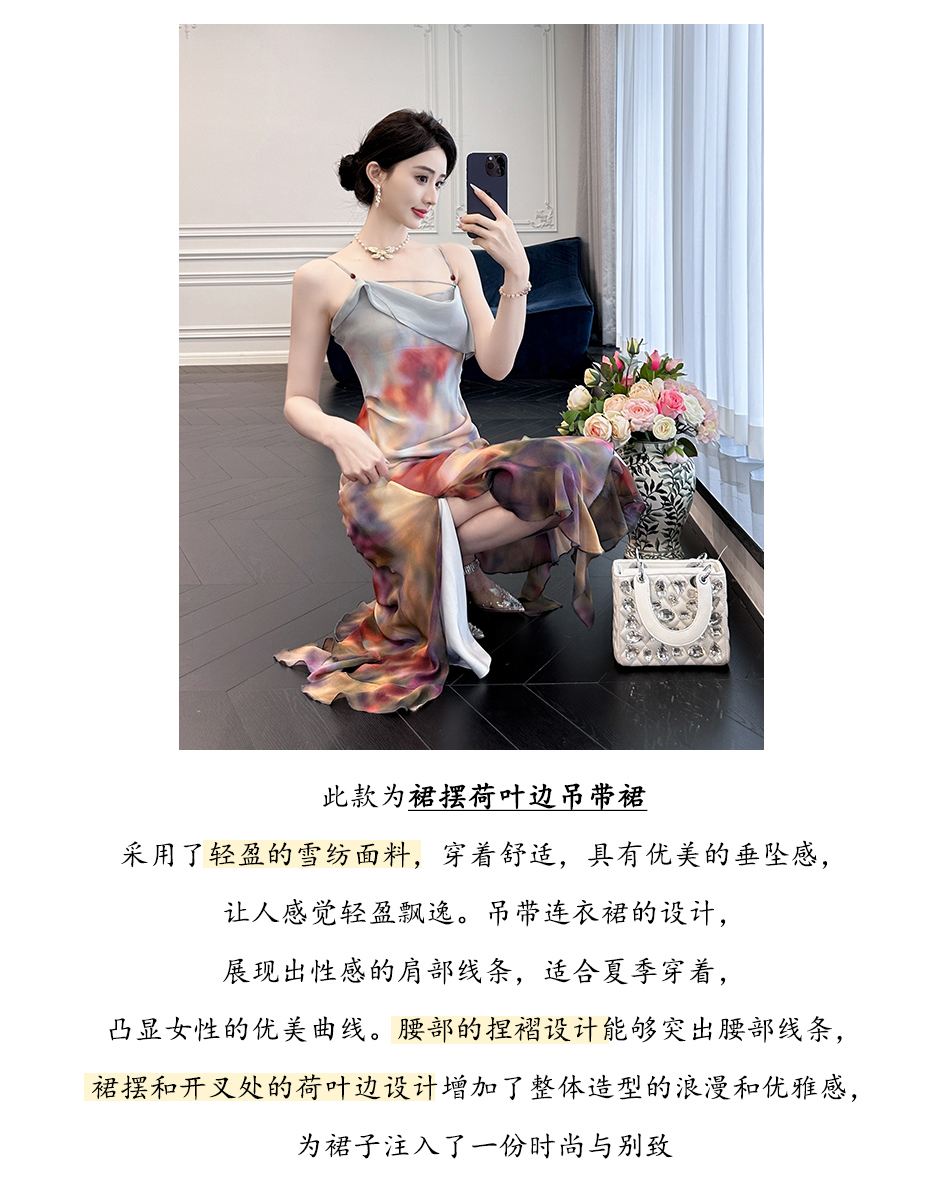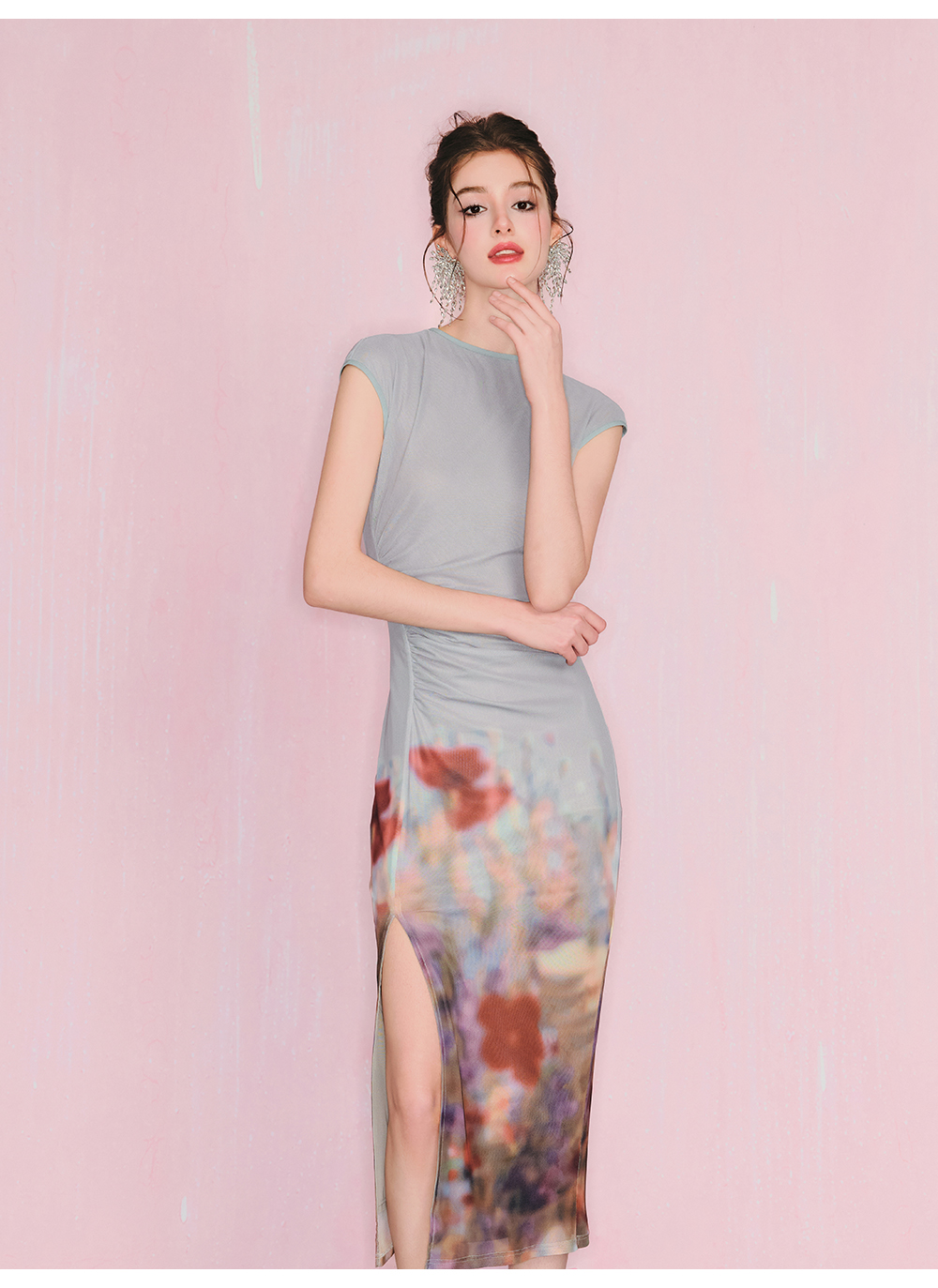 余潇潇【玫瑰庄园】舒适时尚捏褶收腰浪漫印花修身连衣裙