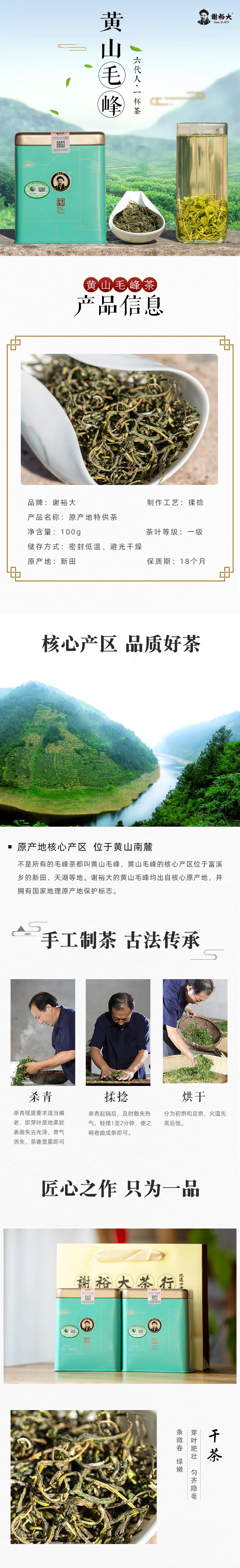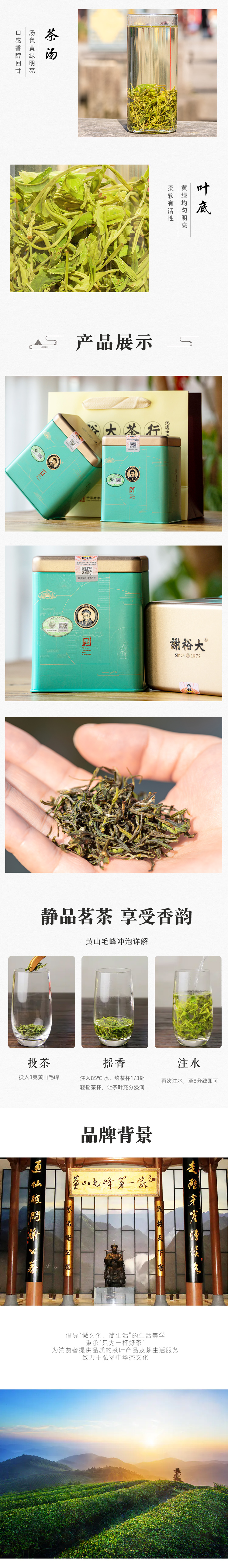- 中华老字号谢裕大茶行,始创于清光绪元年。其创办者谢正安一生业茶,创制了名动天下的黄山毛峰。谢氏后人恪守祖业,传承发扬茶叶技艺将安徽名茶悉数纳入产品系列。潜心制茶,敬奉香茗。