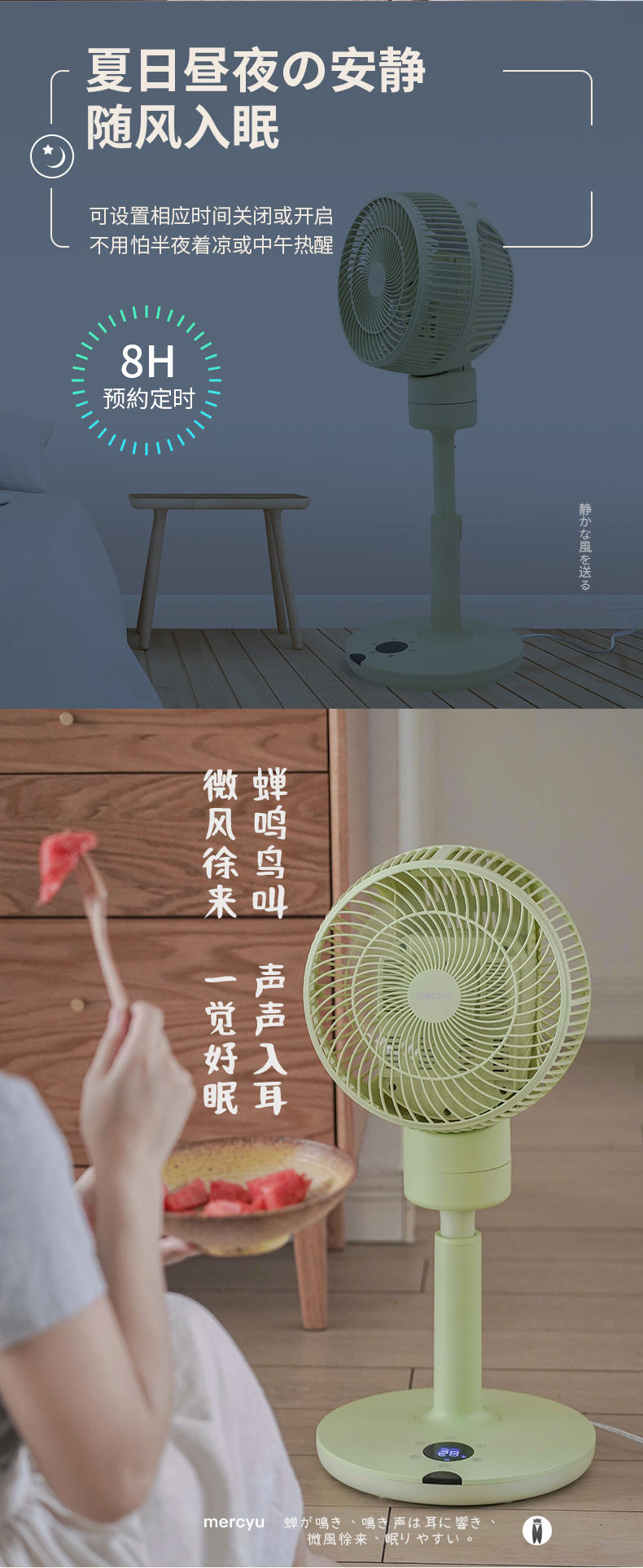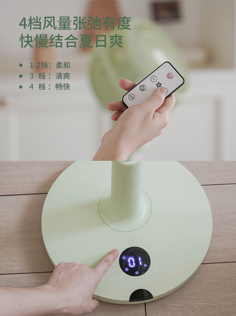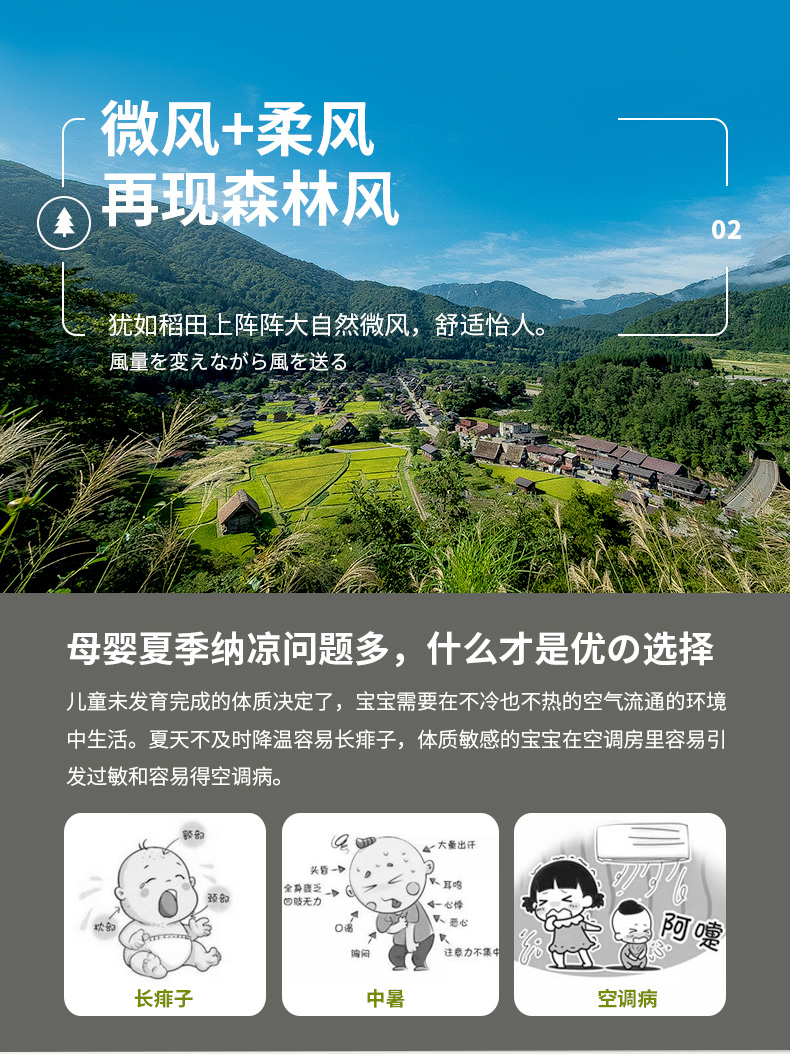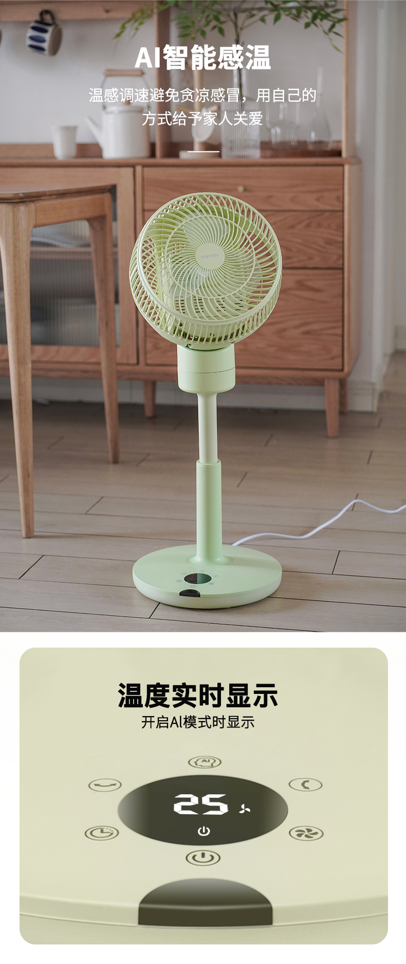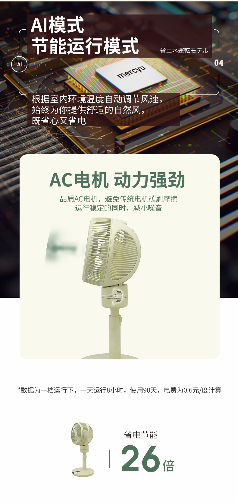 4:高精度轴承变频电机,随风入眠安静到天明;内置智能感温芯片,可感应到环境温度的变化自动调整风速,不用担心昼夜温差过大容易着凉,风随温变