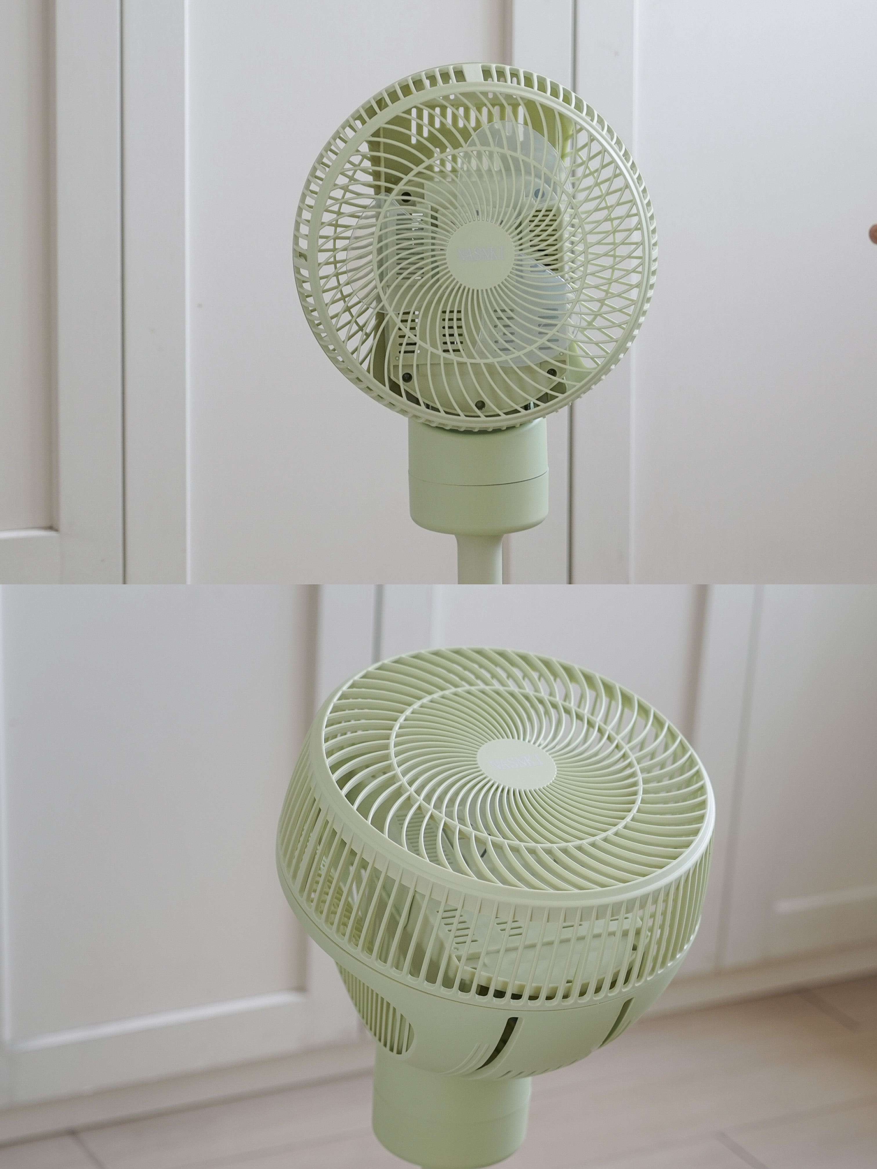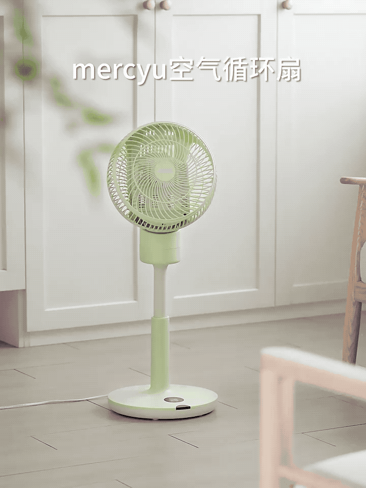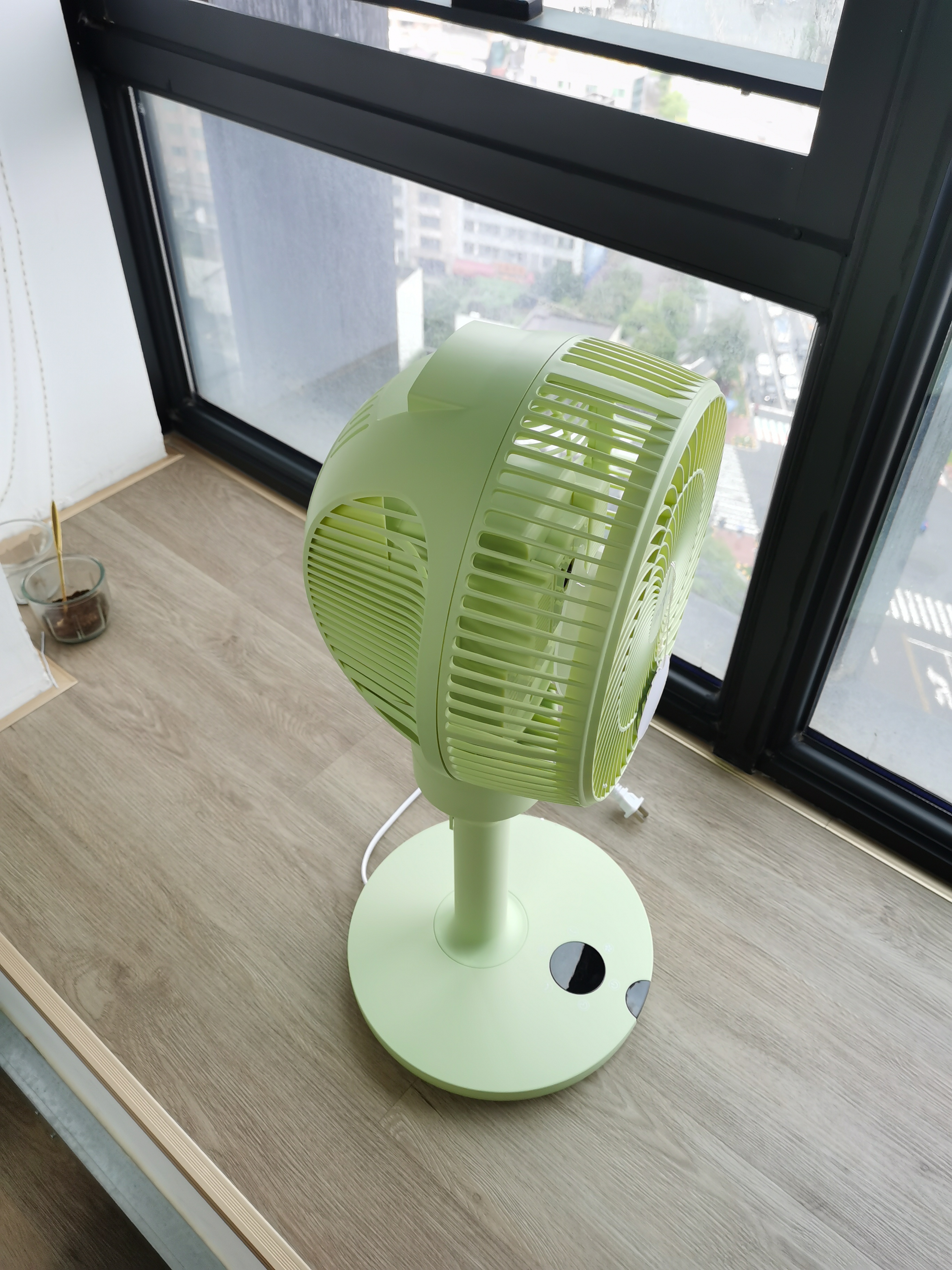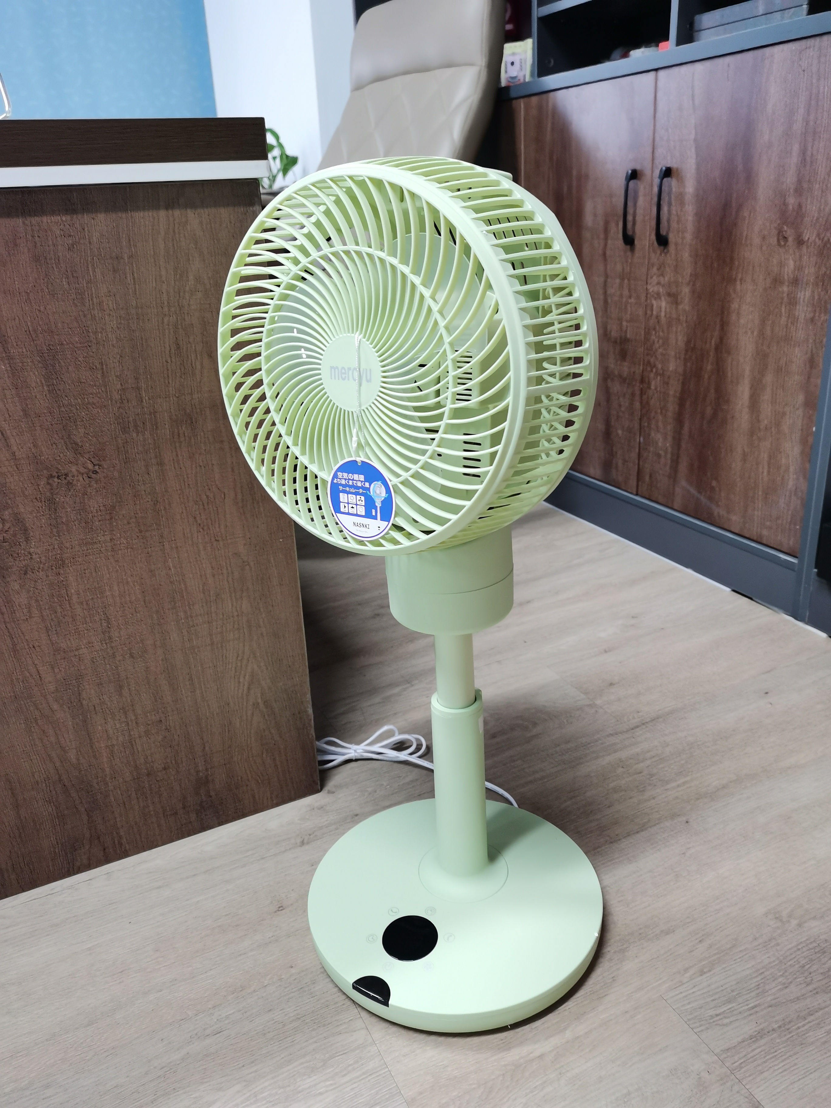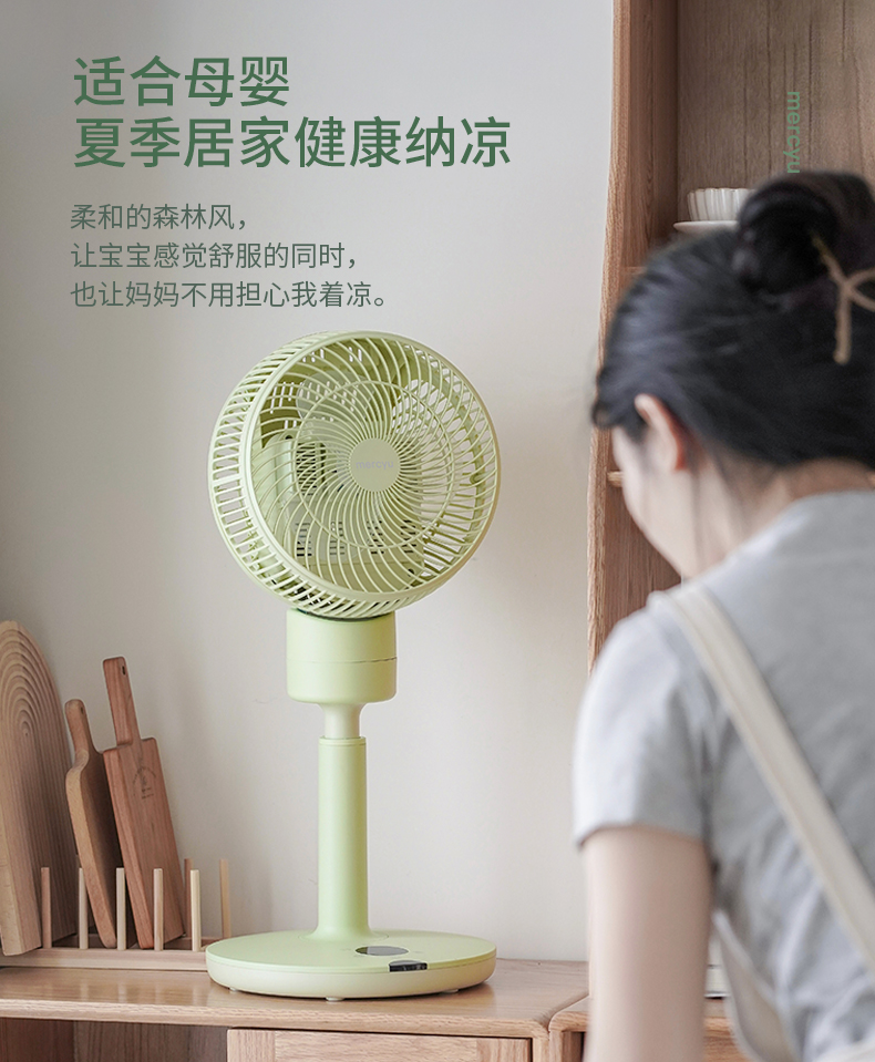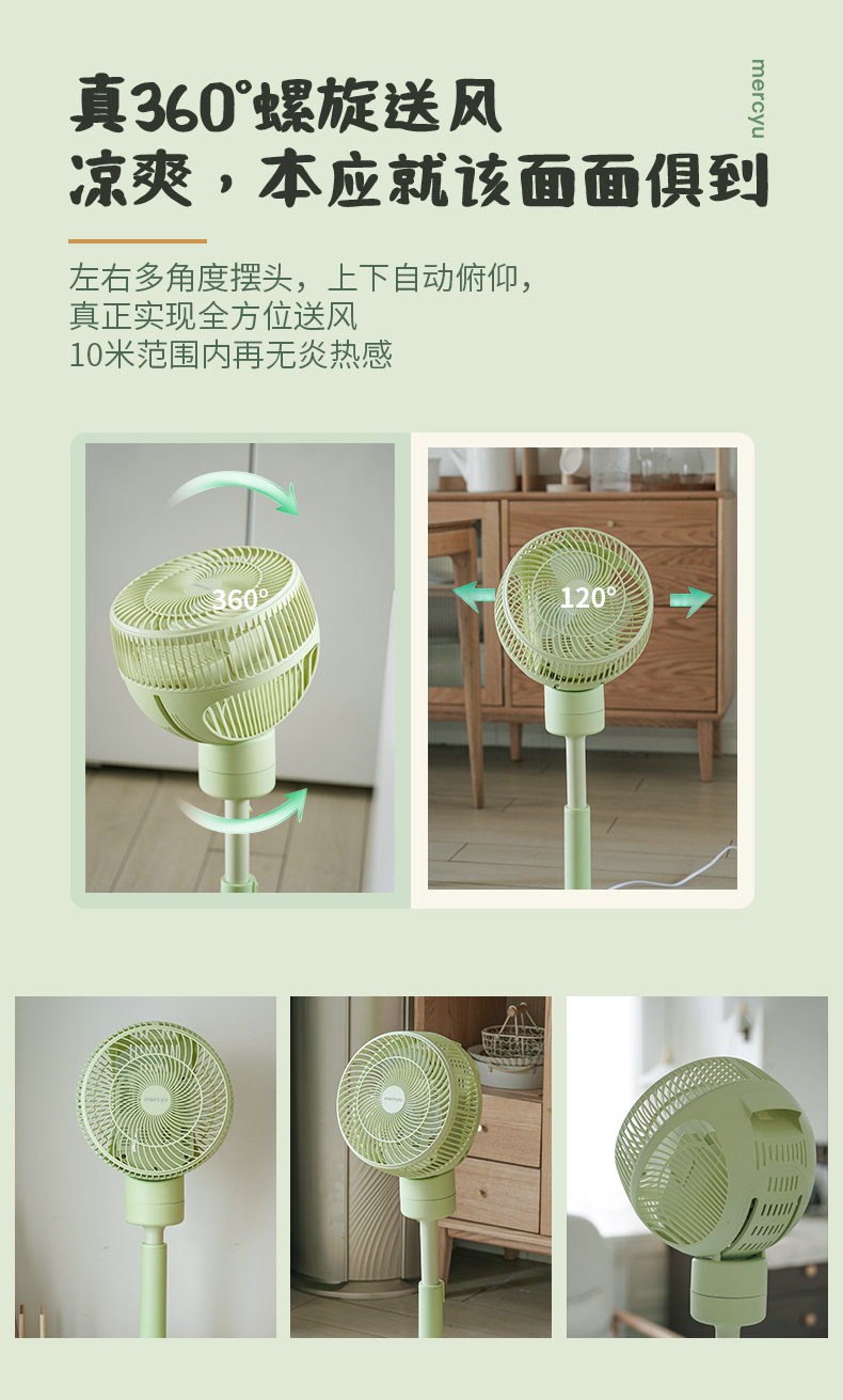 1:强风不硬吹,直吹不头疼;日常电风扇是扇叶驱动空气流动,直接送出硬风;摩秀循环扇设计为大倾角螺旋扇叶,变频电机风量足而不硬