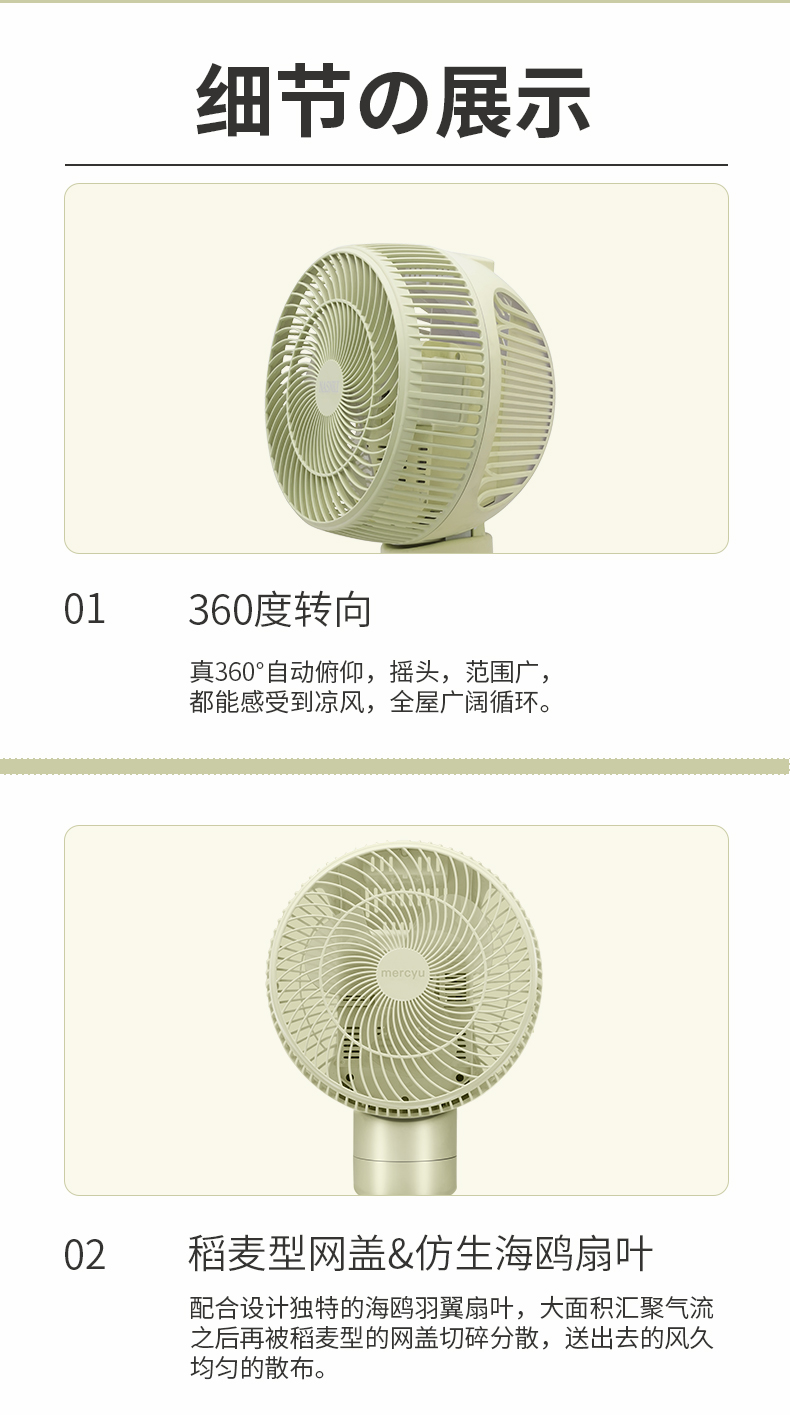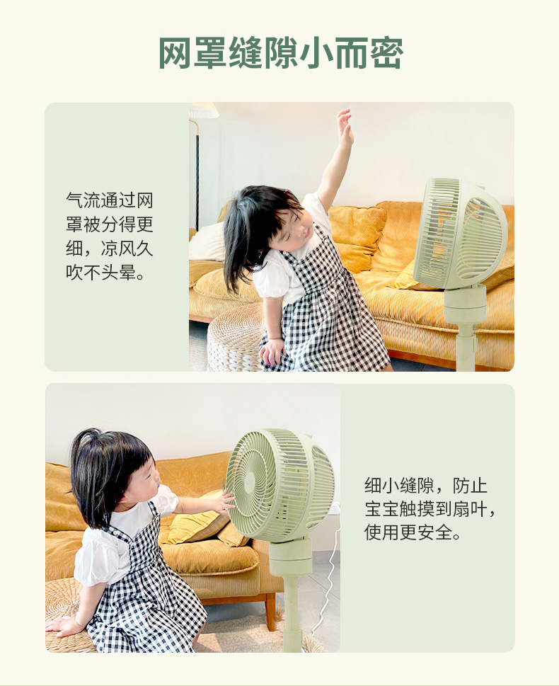 5:科学配比更细的网罩缝隙,气流切割再现森林风;网罩缝隙比例也运用到空气动力学的科技,气流细而不弱,有效带走皮肤热量而不会骤冷,避免头疼等不适;网格细密更提高了使用的安全系数,小朋友更安心