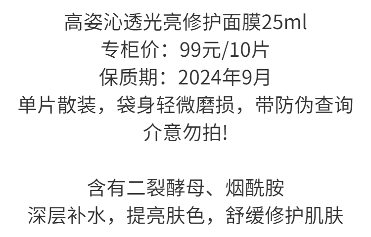 【爆款超低价预售 急单慎拍】高姿沁透光亮修护面膜贴二裂酵母烟酰胺补水保湿提亮肤色护肤品女