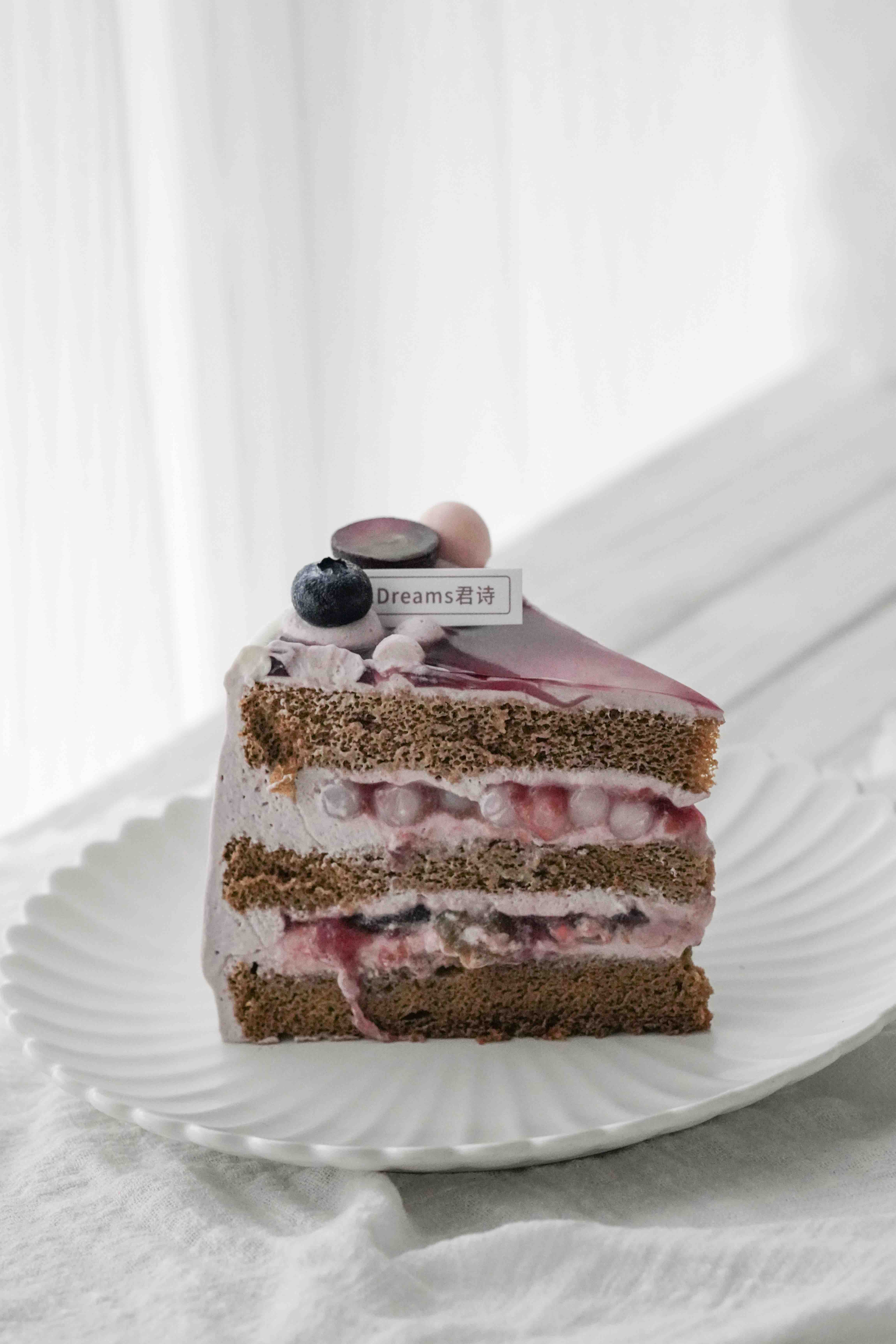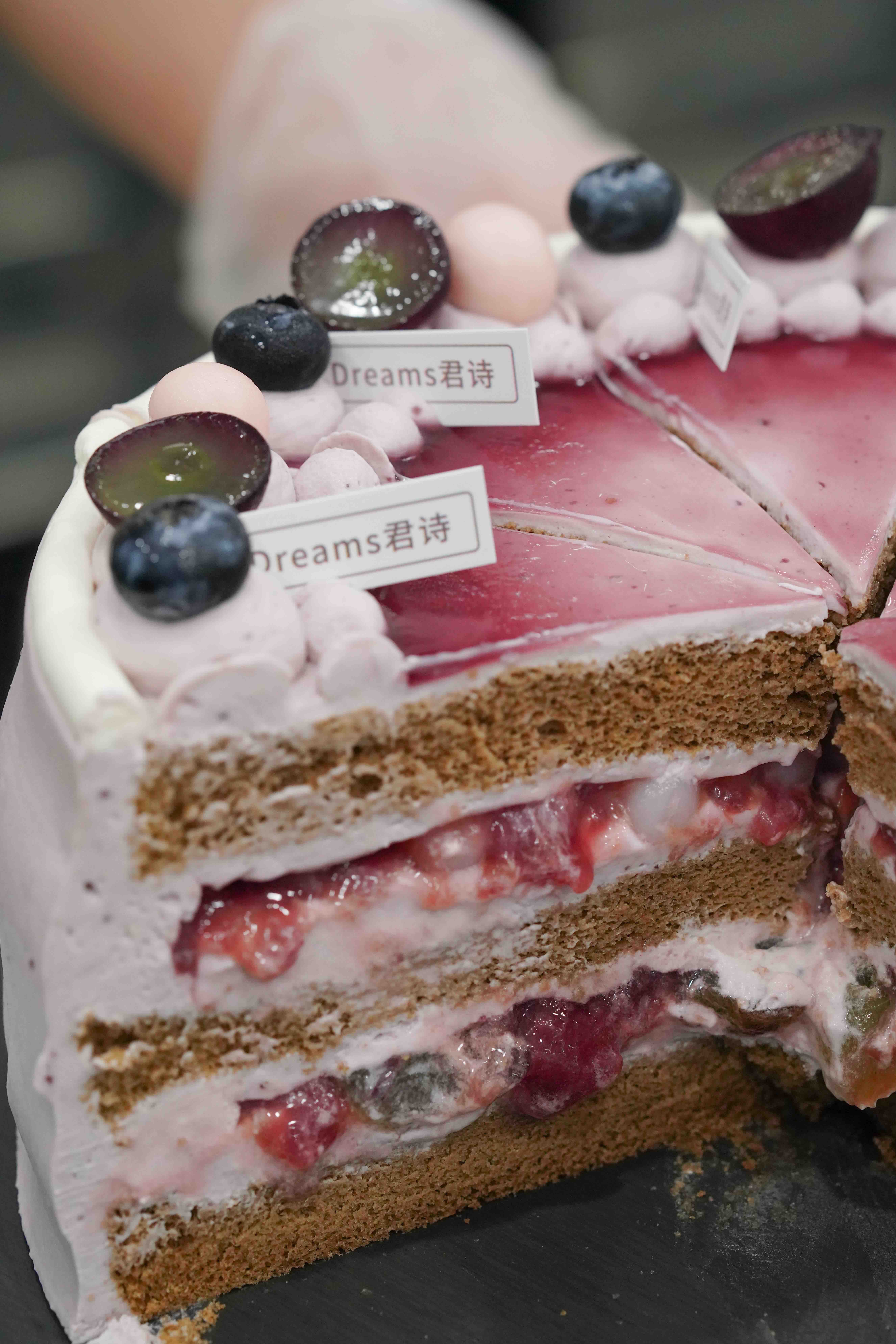 2层夹心分别是:葡萄鲜果酱+葡萄果肉和葡萄鲜果酱+酸奶爆珠,整体奶油是葡萄特调奶油,一整个葡萄风味足足儿的,夹心爆浆葡萄的流心感真是让人很难不爱呐!