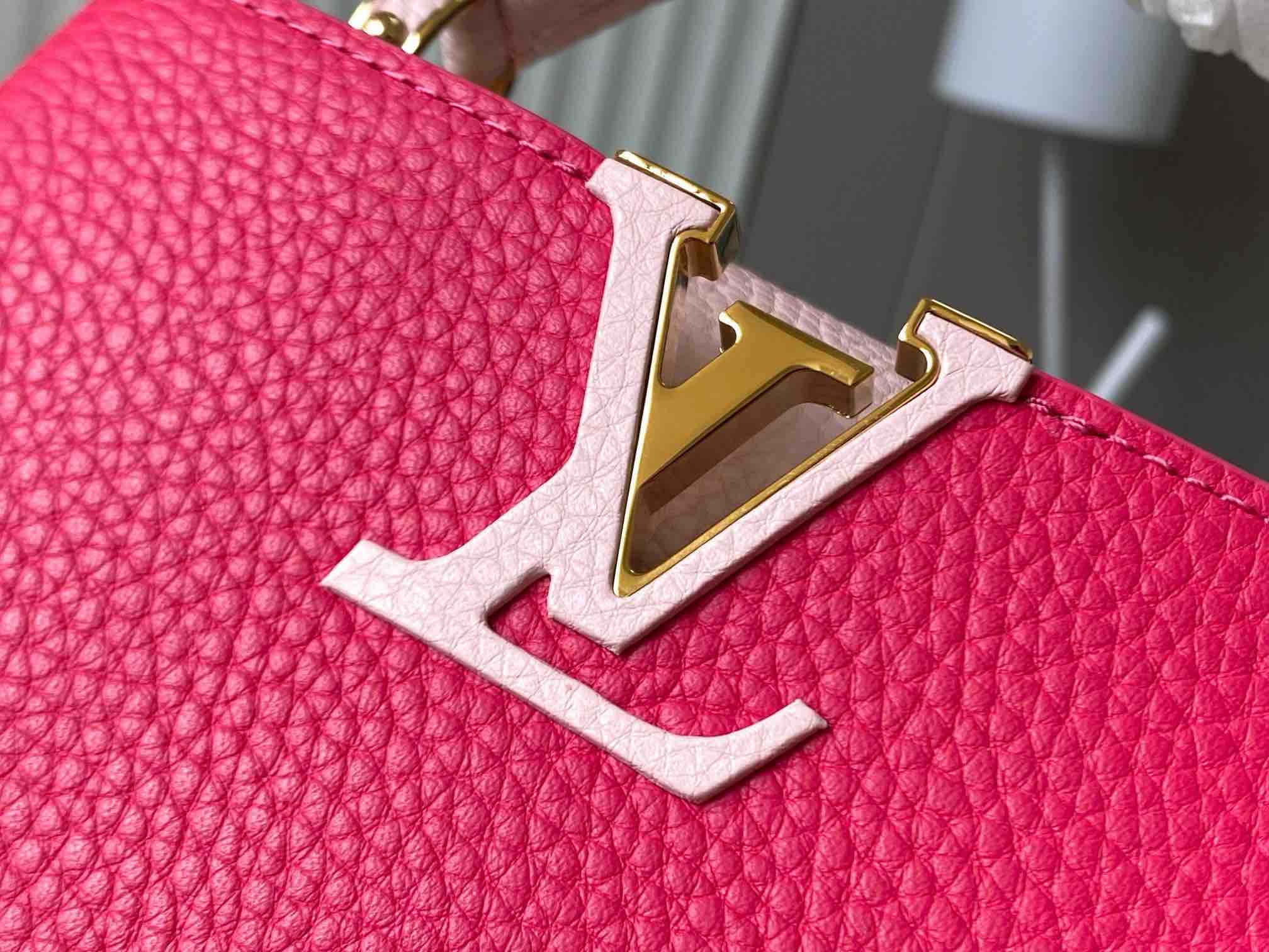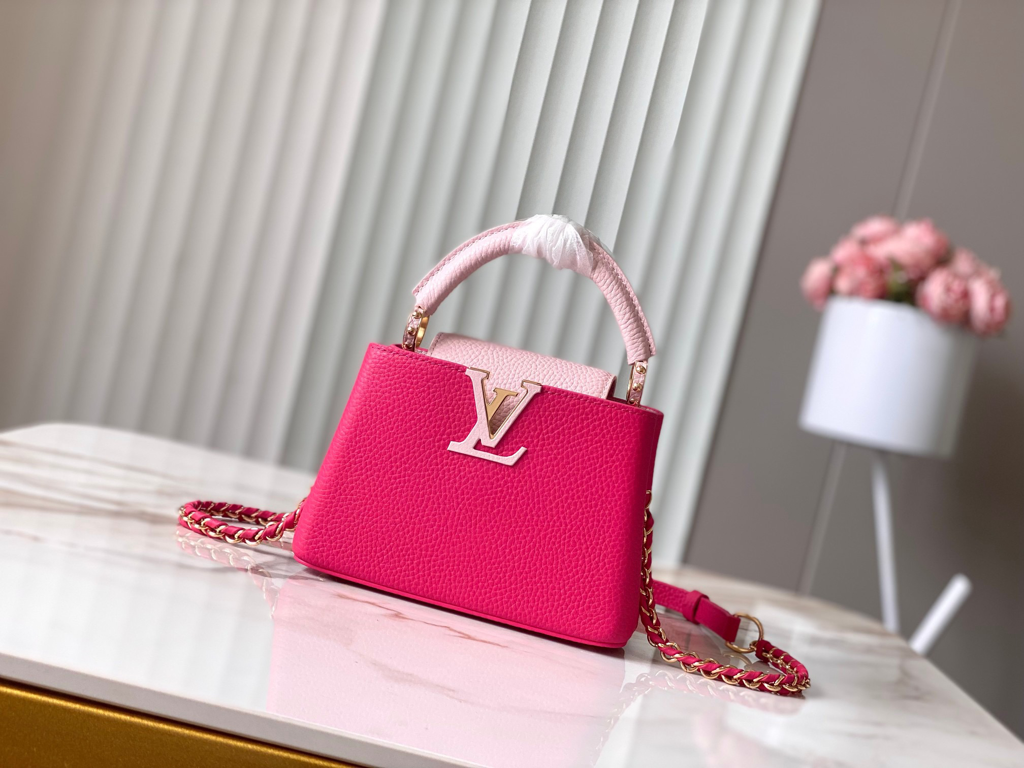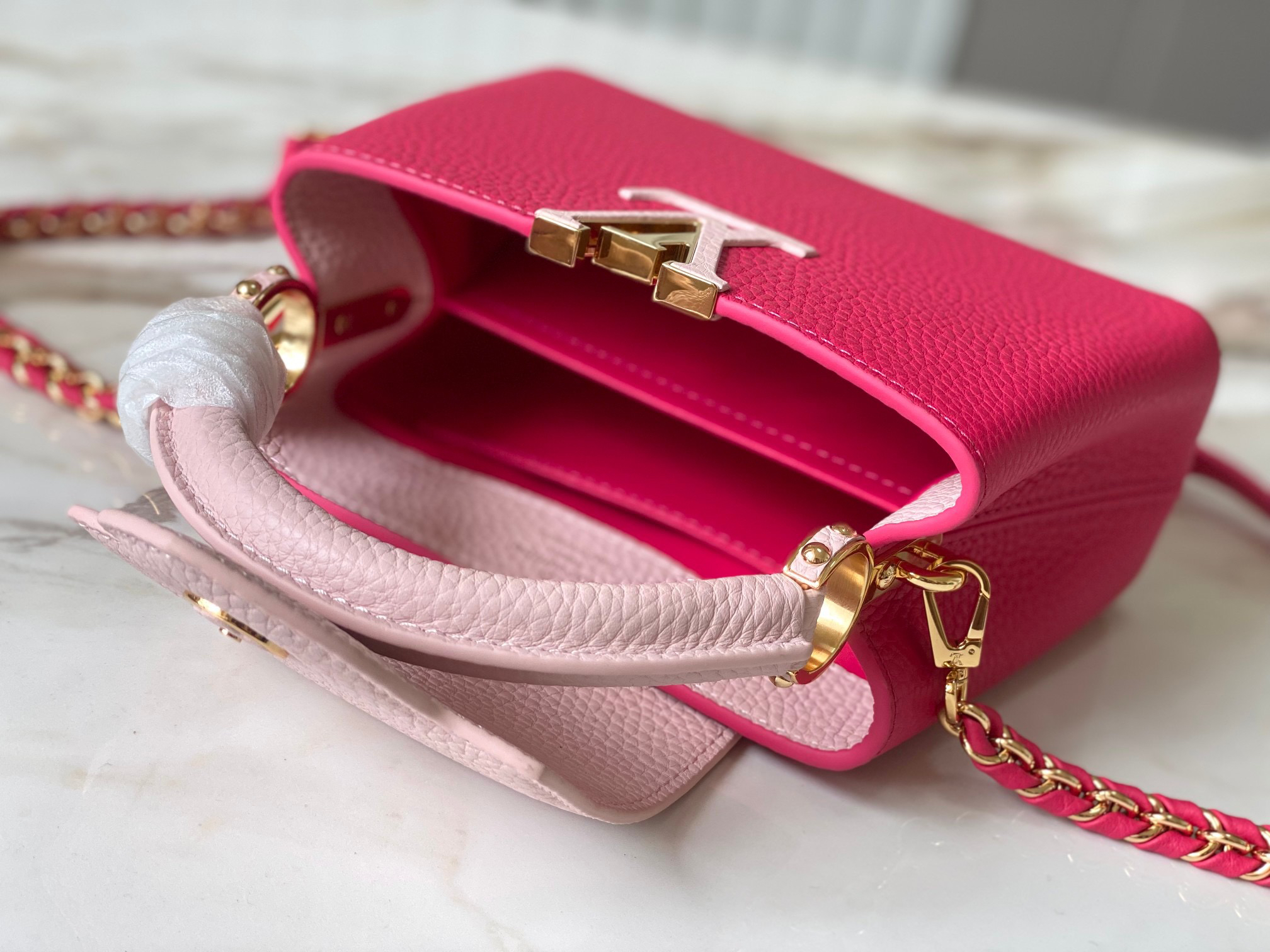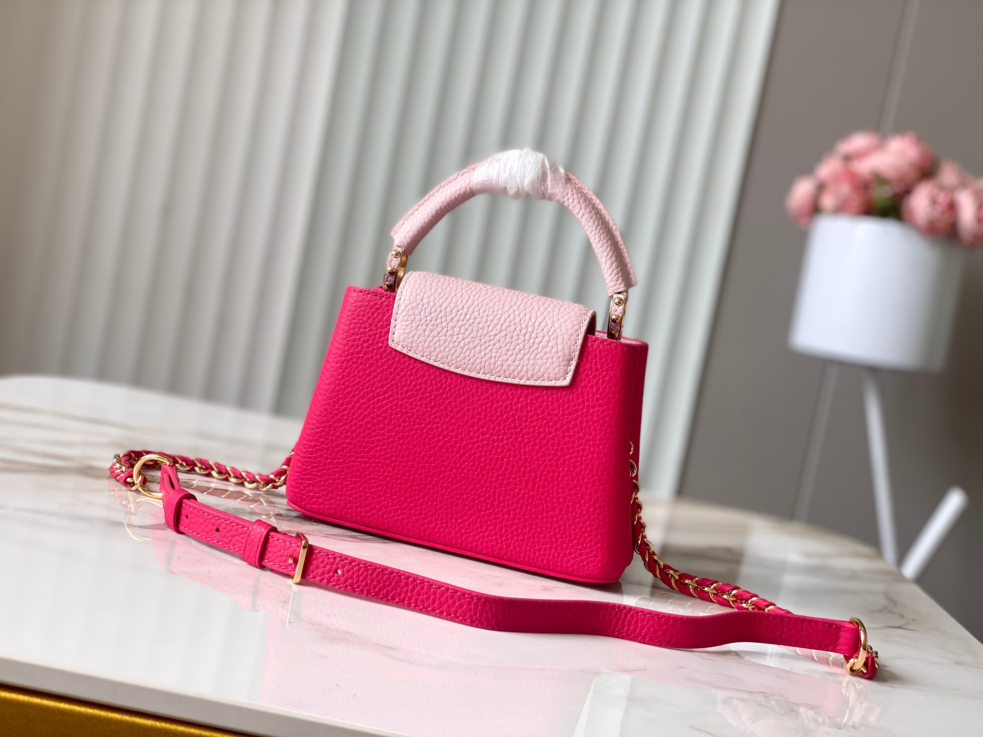 秋冬特惠💰1530 渠道级LV 新品 te级LV 全套包装 M21689/M48865玫红拼链条款 此款Taurilon皮革版Capucines 手袋呈现柔美清新的色调 令人眼前一亮 除了标志性的ding部皮革手柄 另配可脱卸、可调节编结皮革链式包带 便于肩背或斜挎 包内设有隔层和拉链口袋 可存放贵重物品 Size:21* 14 * 8 cm