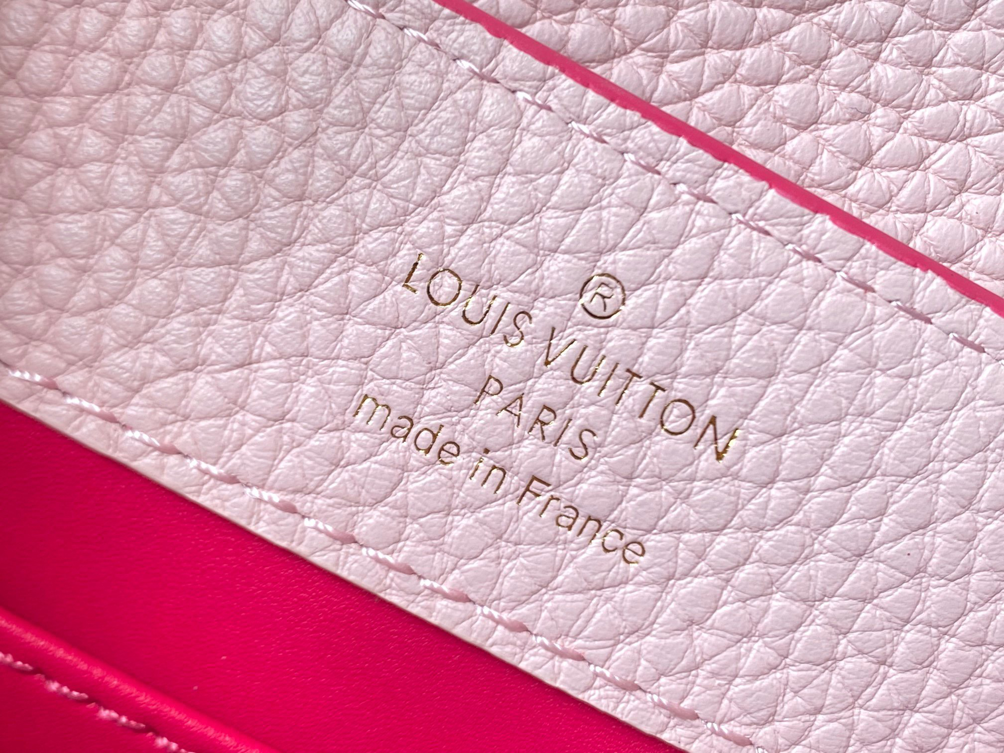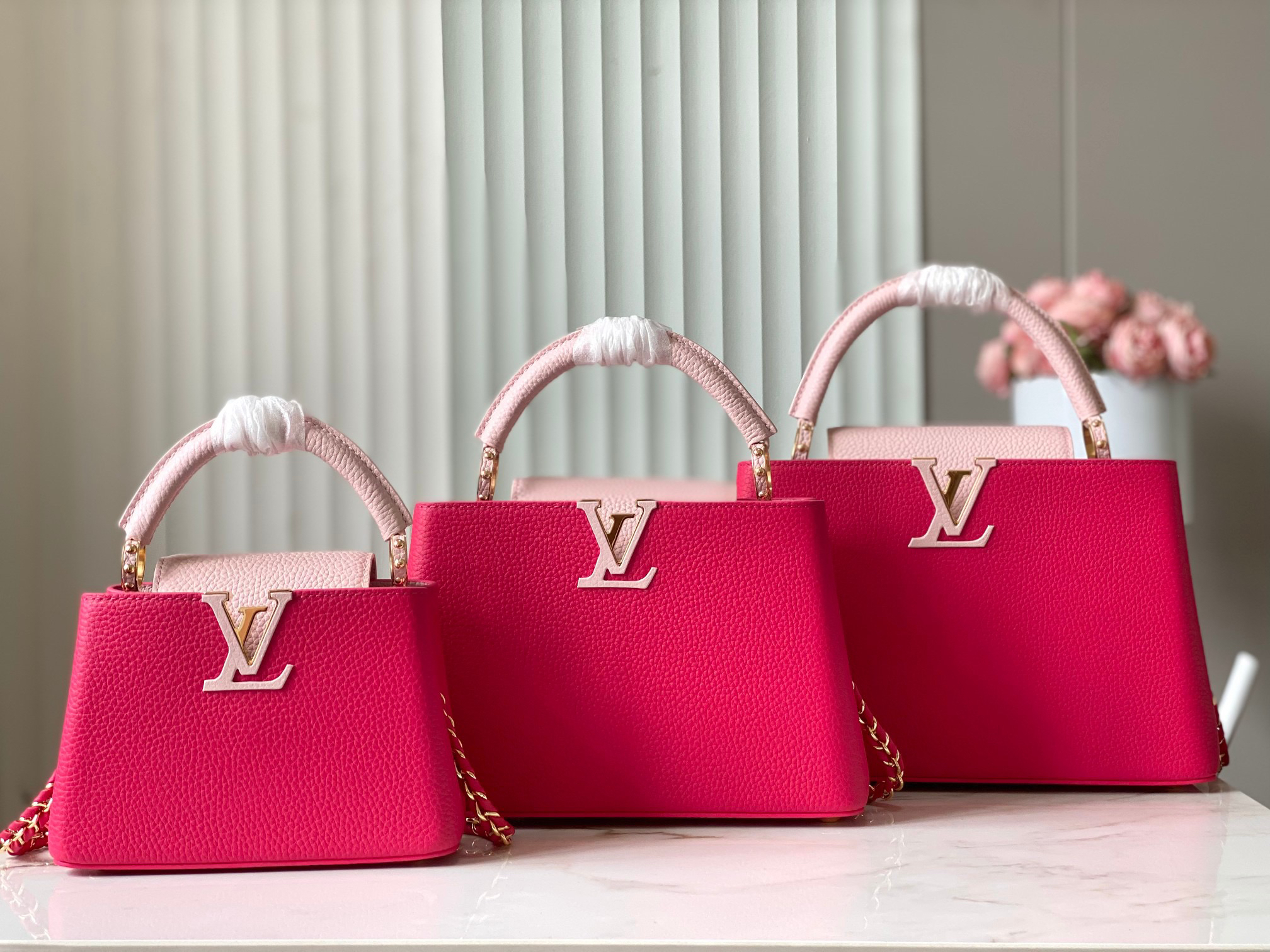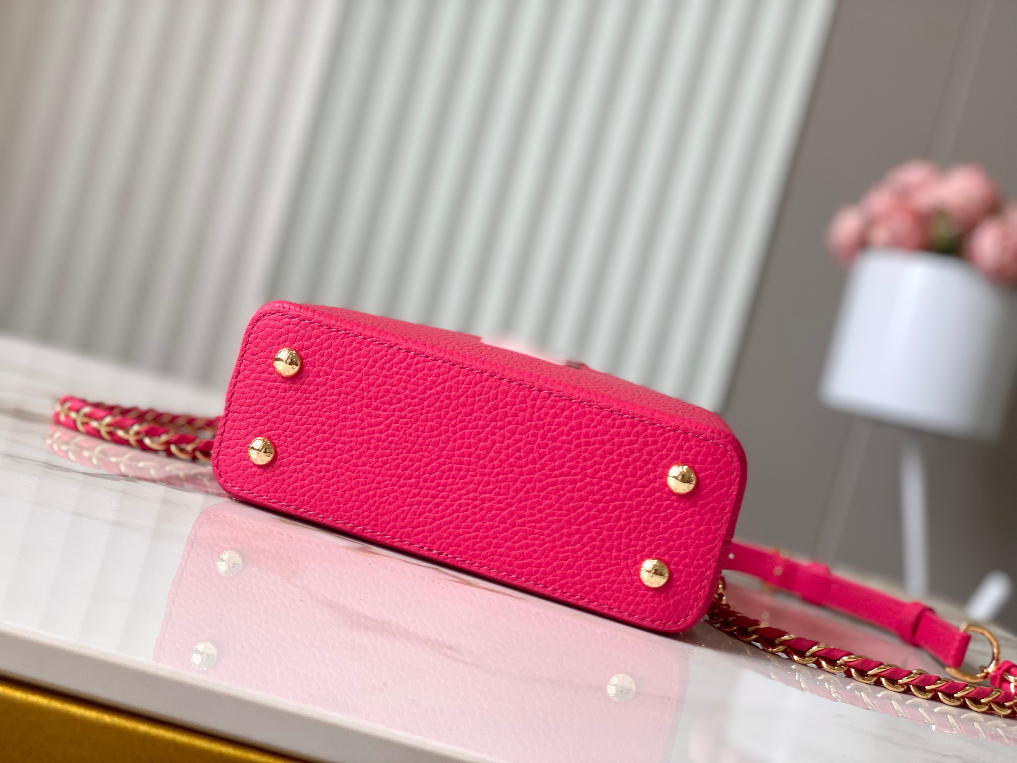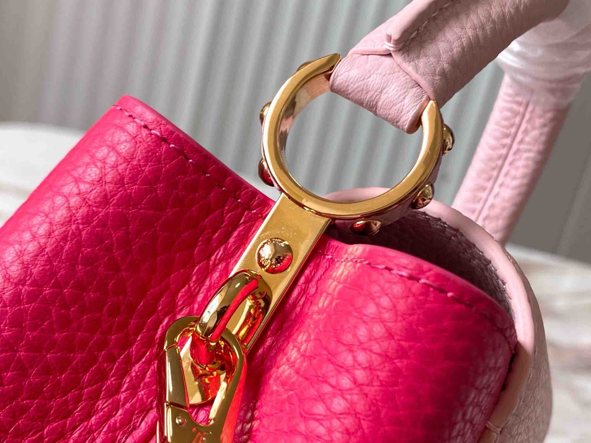 秋冬特惠💰1530 渠道级LV 新品 te级LV 全套包装 M21689/M48865玫红拼链条款 此款Taurilon皮革版Capucines 手袋呈现柔美清新的色调 令人眼前一亮 除了标志性的ding部皮革手柄 另配可脱卸、可调节编结皮革链式包带 便于肩背或斜挎 包内设有隔层和拉链口袋 可存放贵重物品 Size:21* 14 * 8 cm