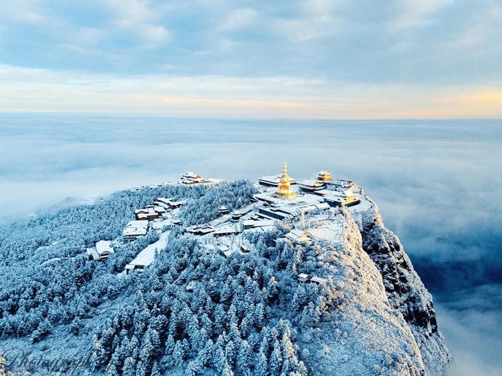 峨眉山的云海盛景,佛家叫做“银色世界”,山风乍起时,云海翻涌,远处群峰似海中小岛,雄伟景色让人如痴如醉。