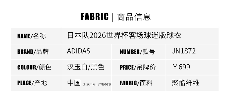 SFS阿迪达斯2026世界杯日本客场球迷版球衣短袖足球服男 JN1872