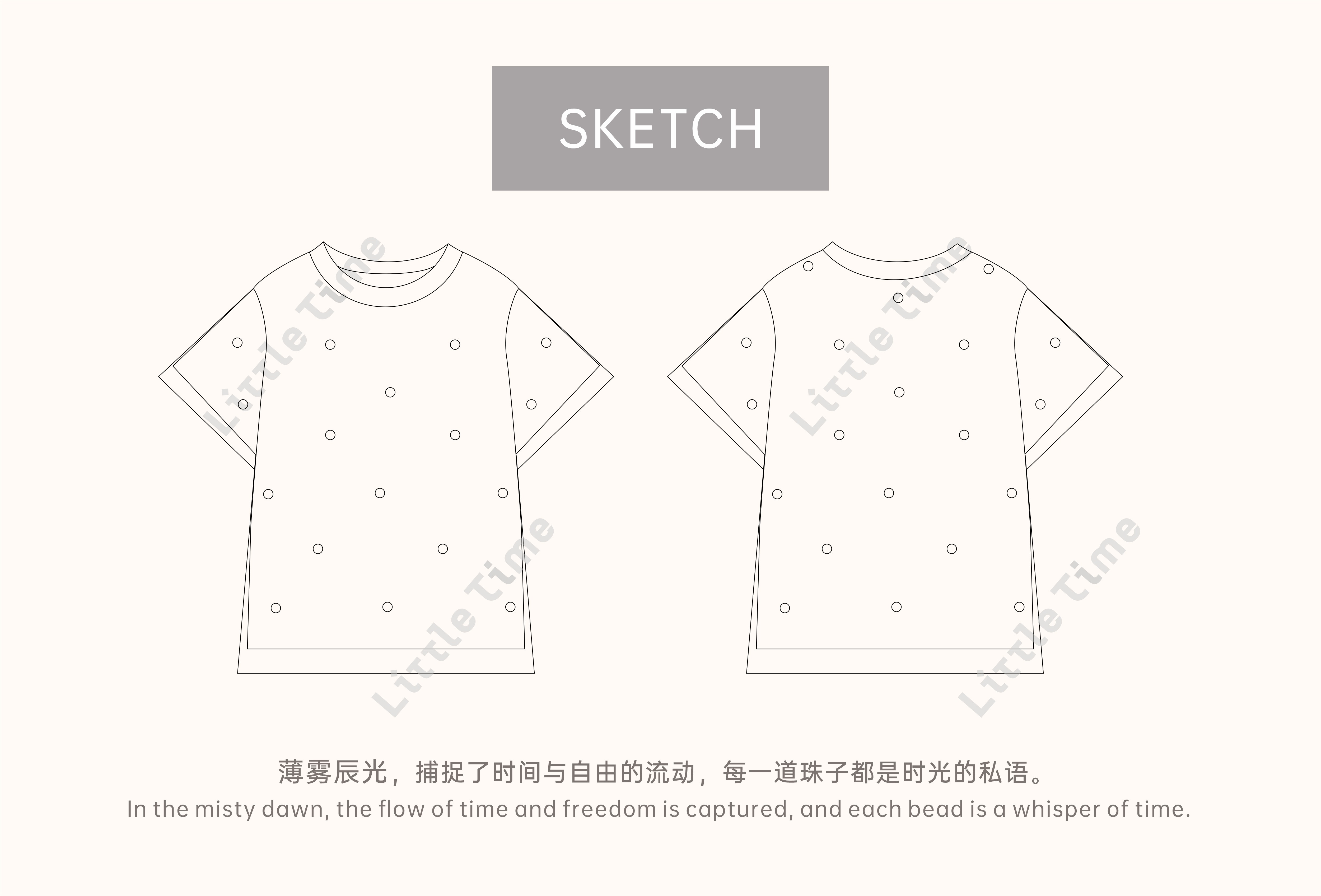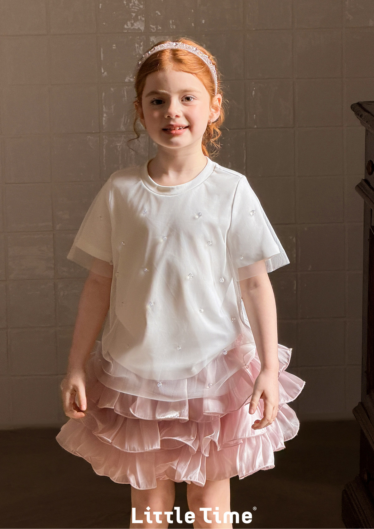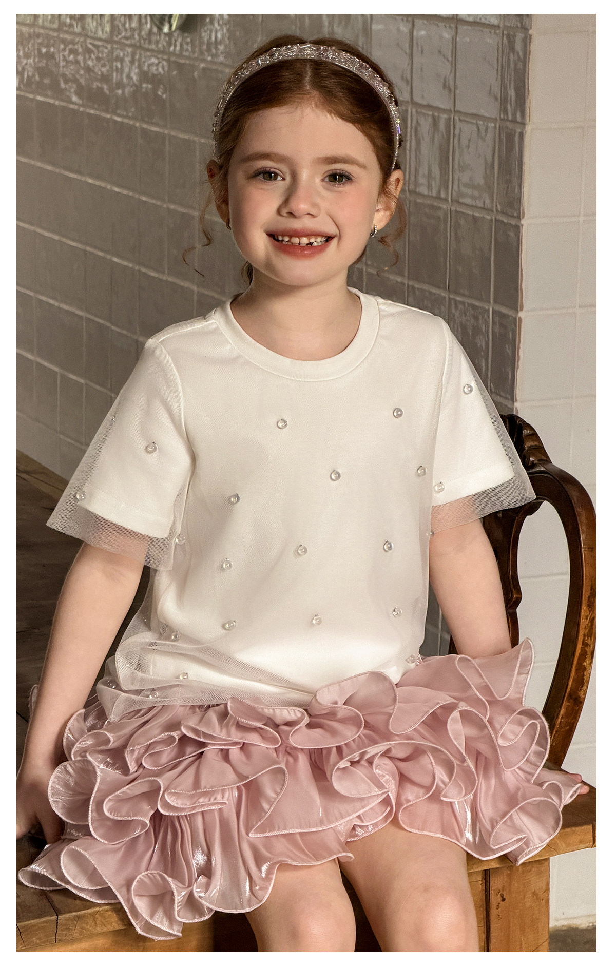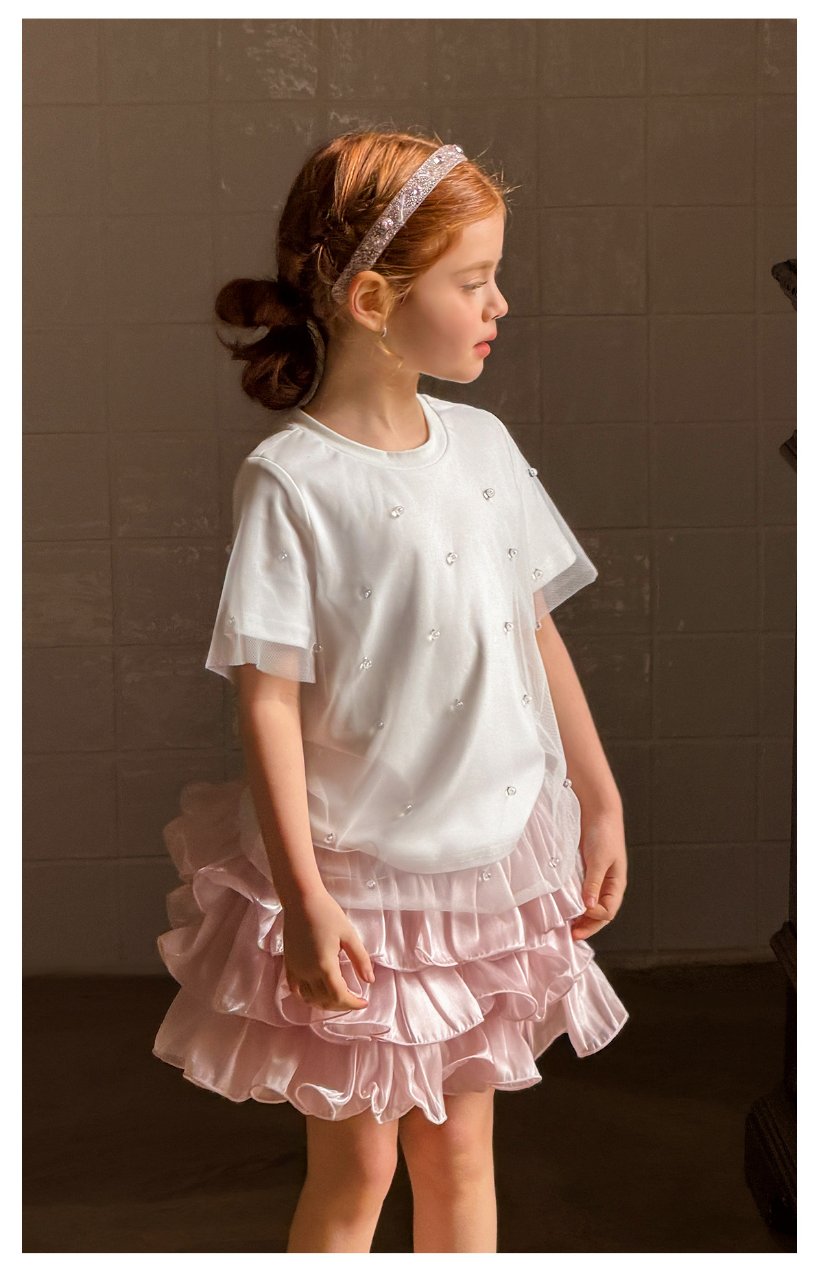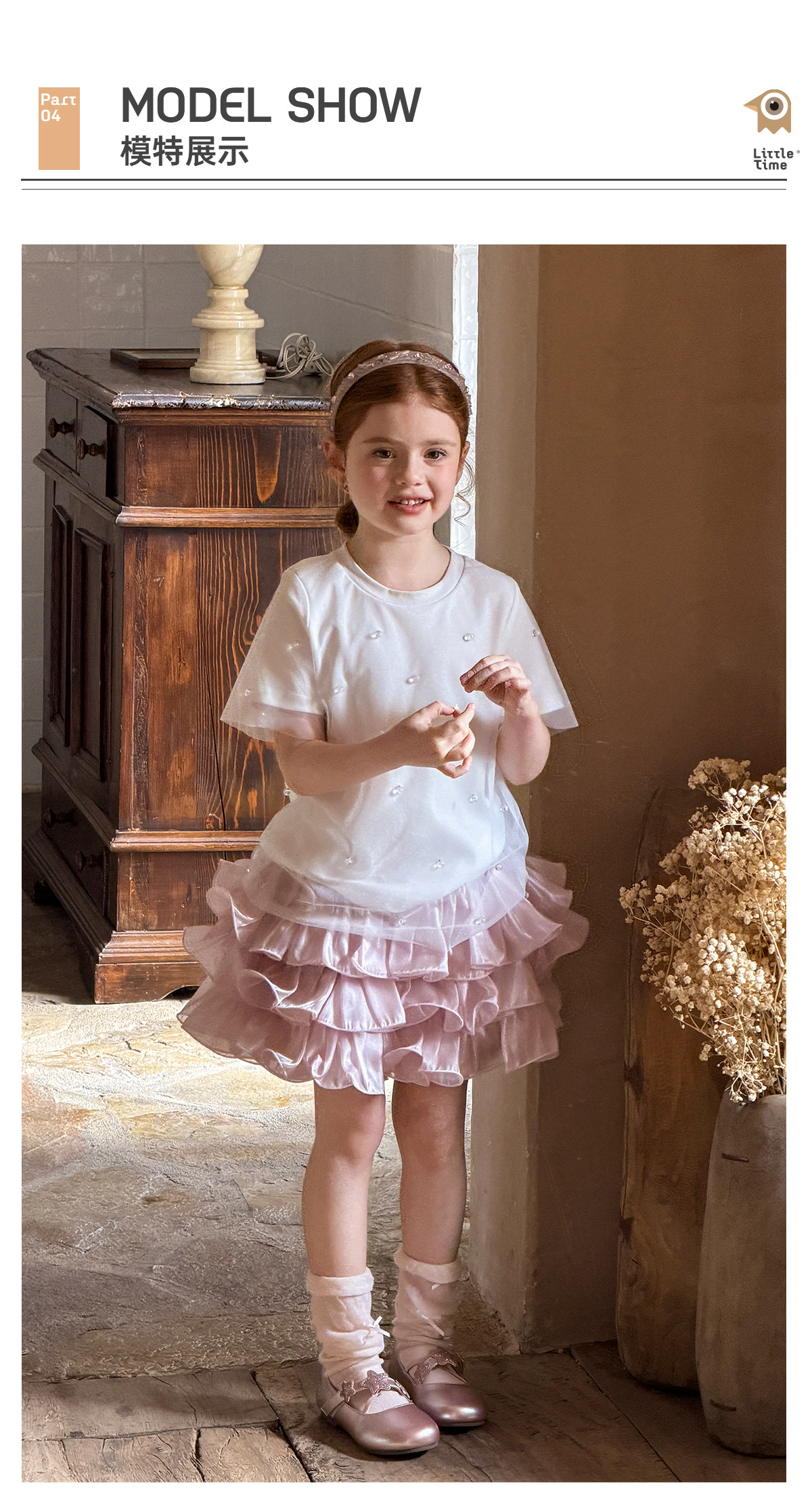 littletime法式甜美风白色圆领短袖T恤女童水晶珠子装饰上衣