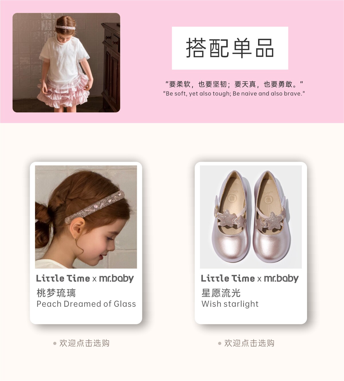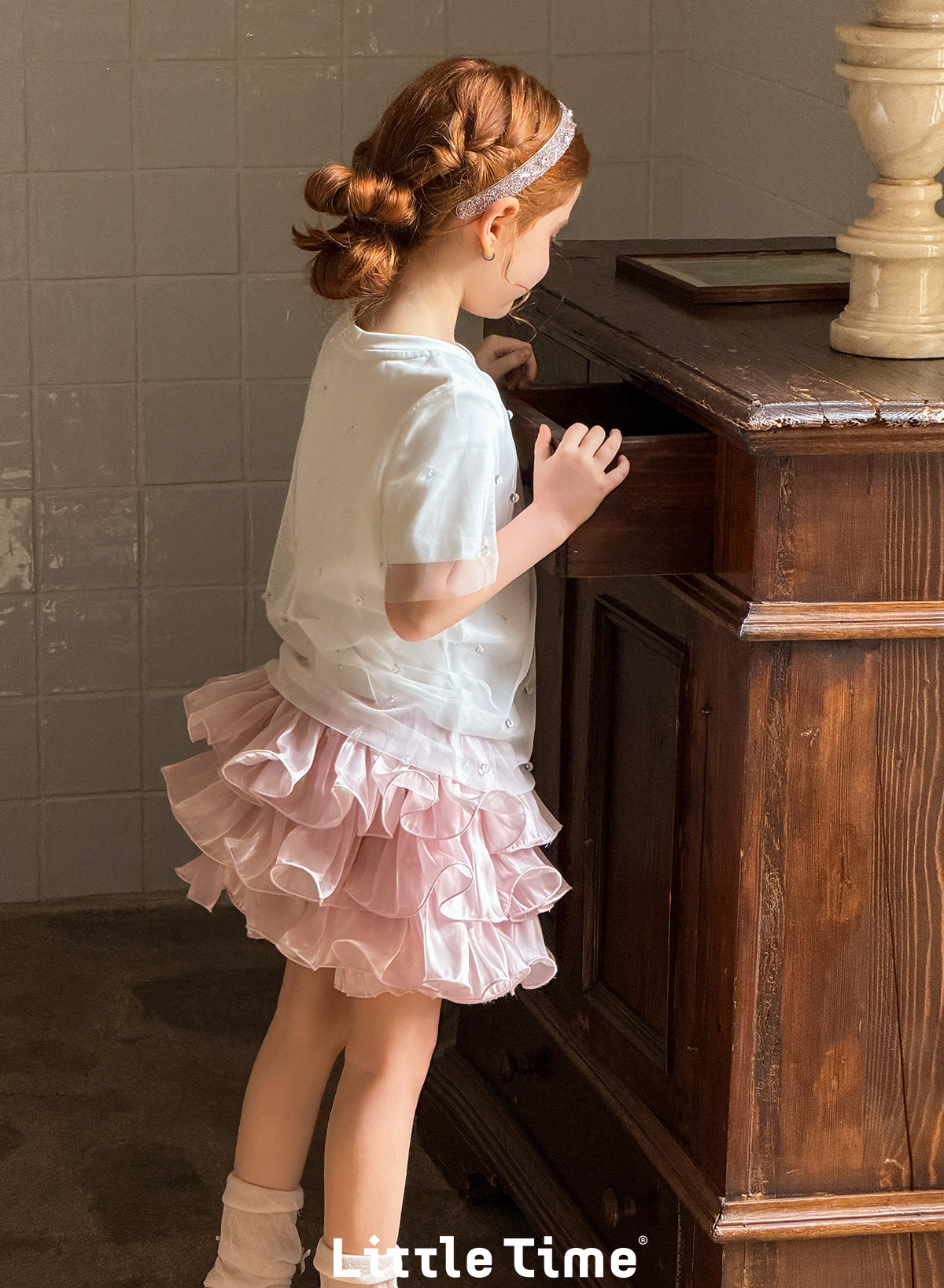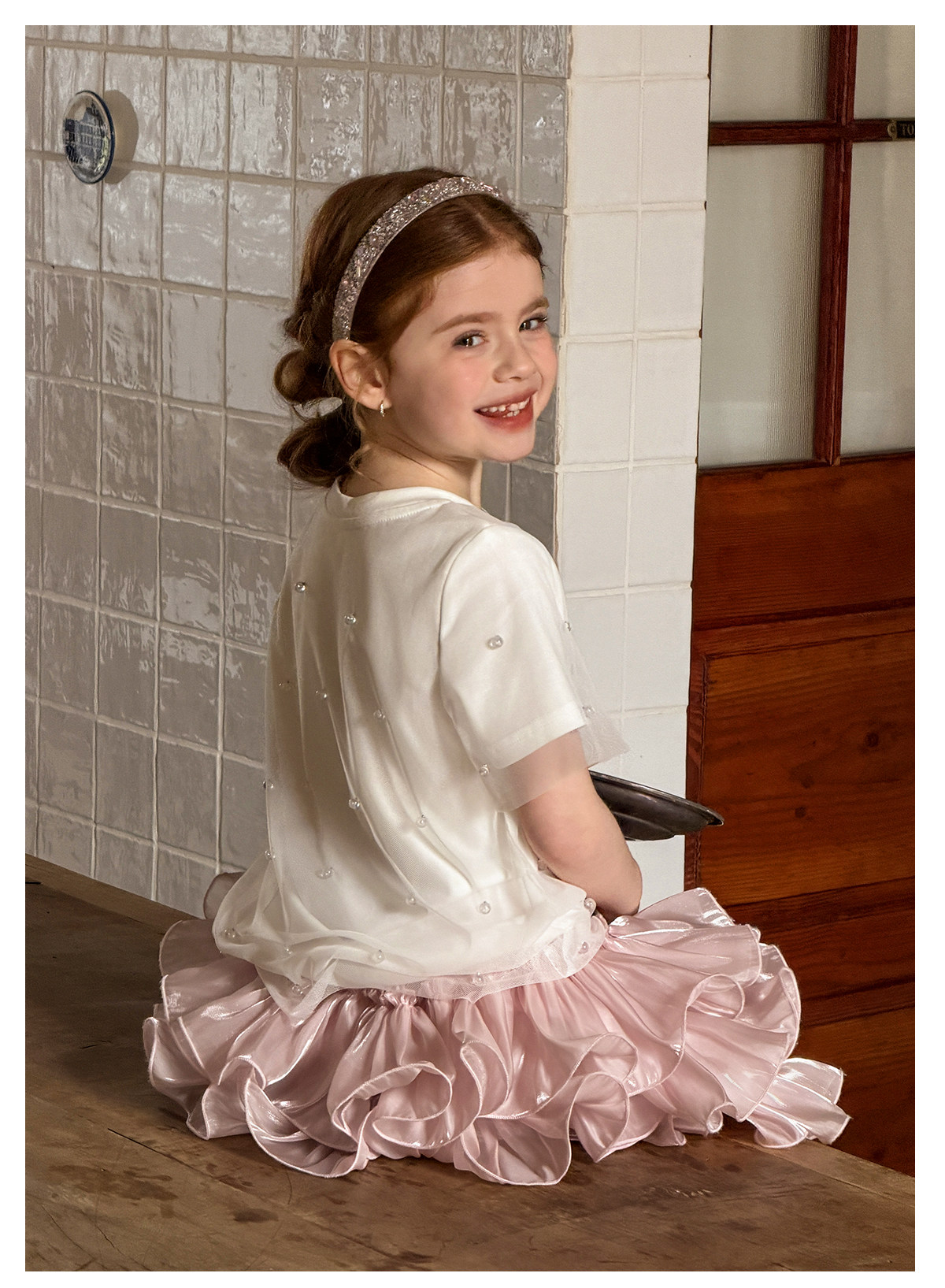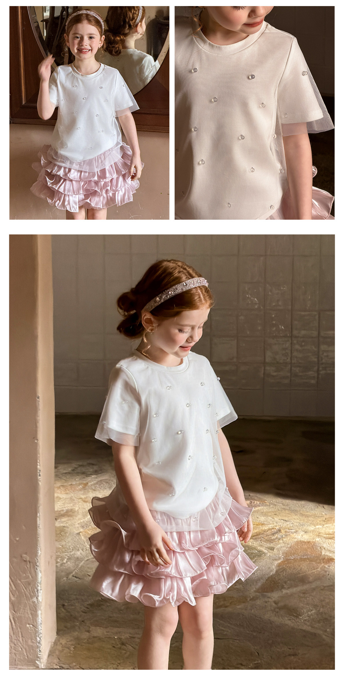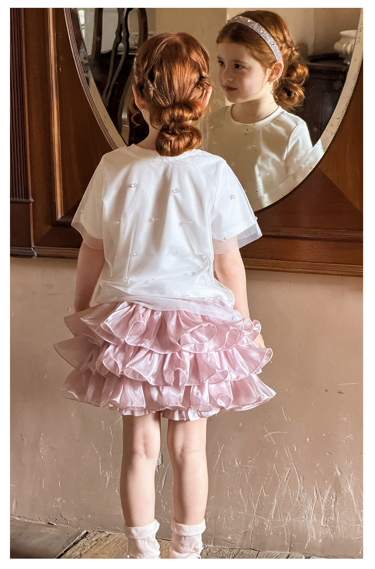 littletime法式甜美风白色圆领短袖T恤女童水晶珠子装饰上衣