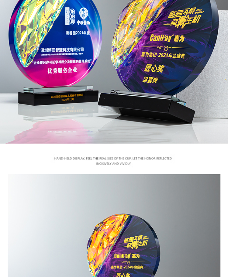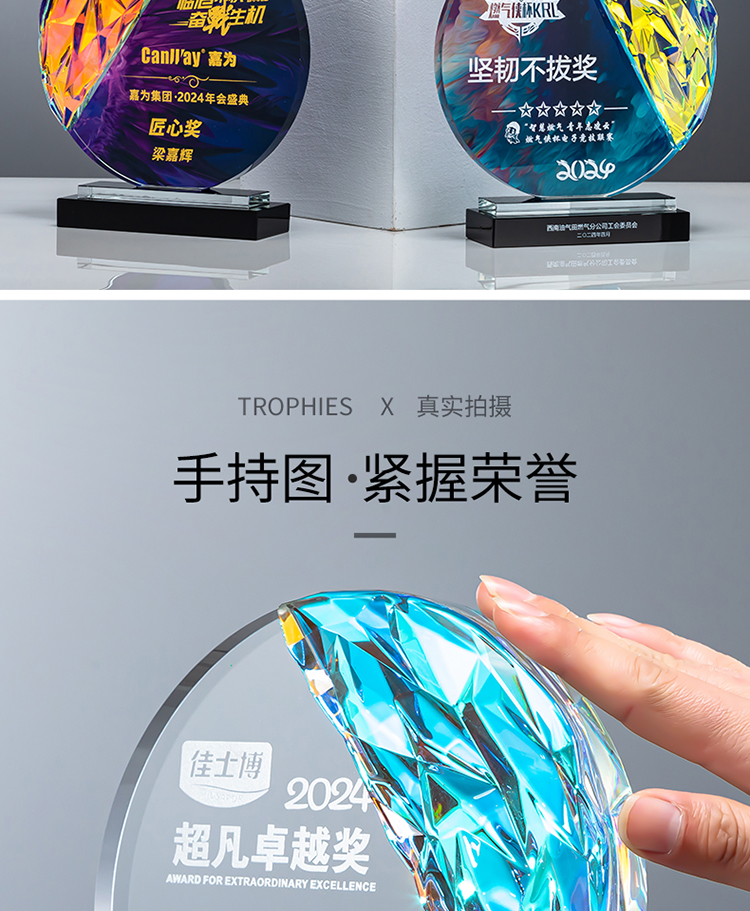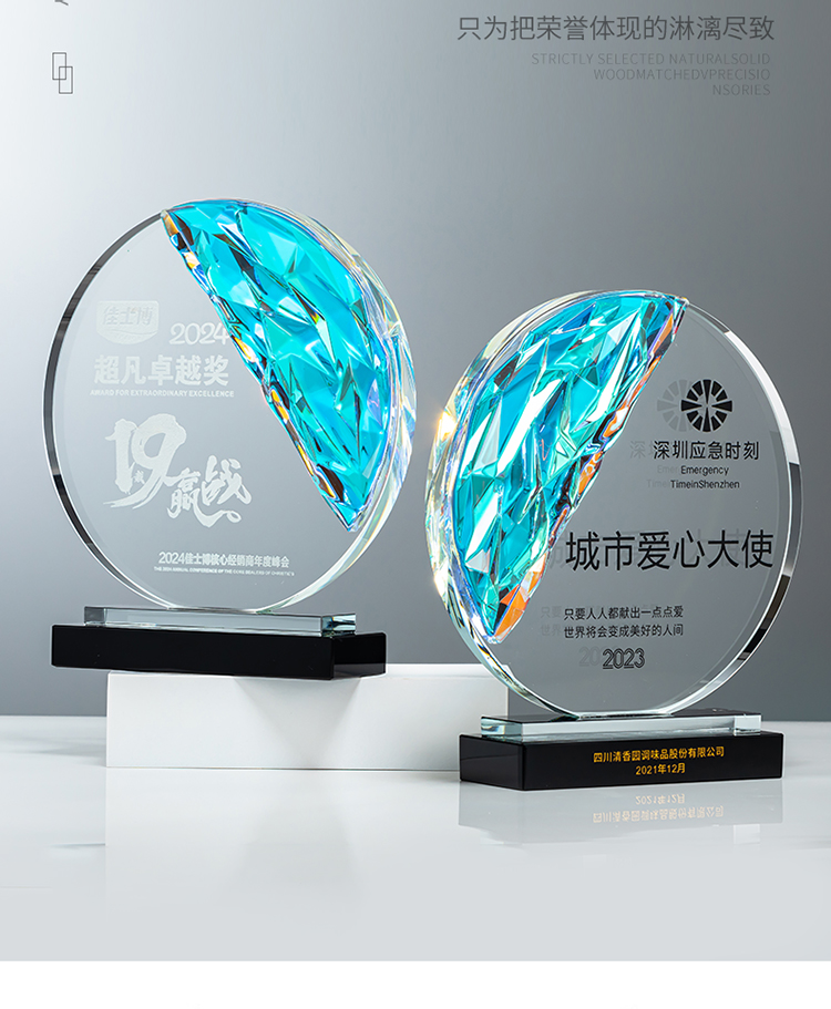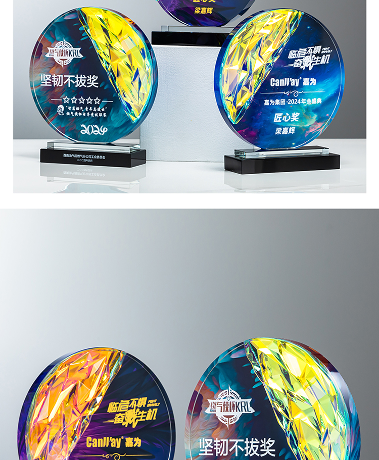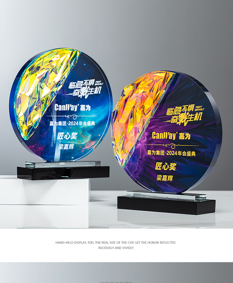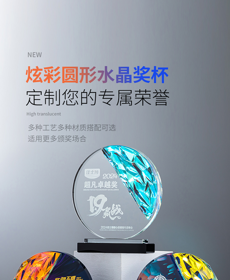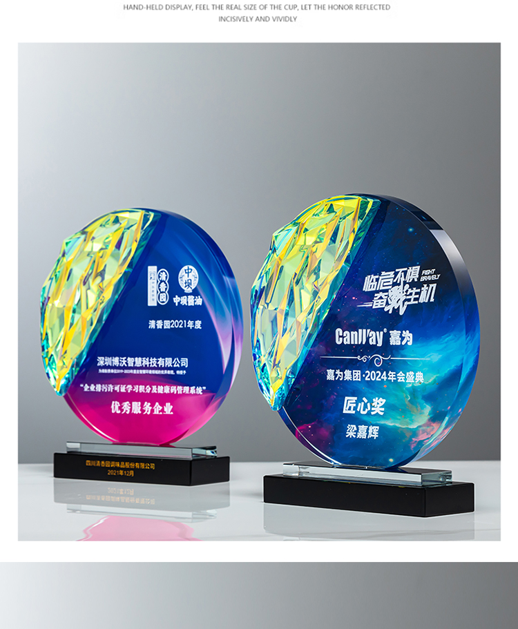 定制水晶奖杯圆形配琉璃奖牌炫彩七彩比赛运动会表彰高档年会奖品