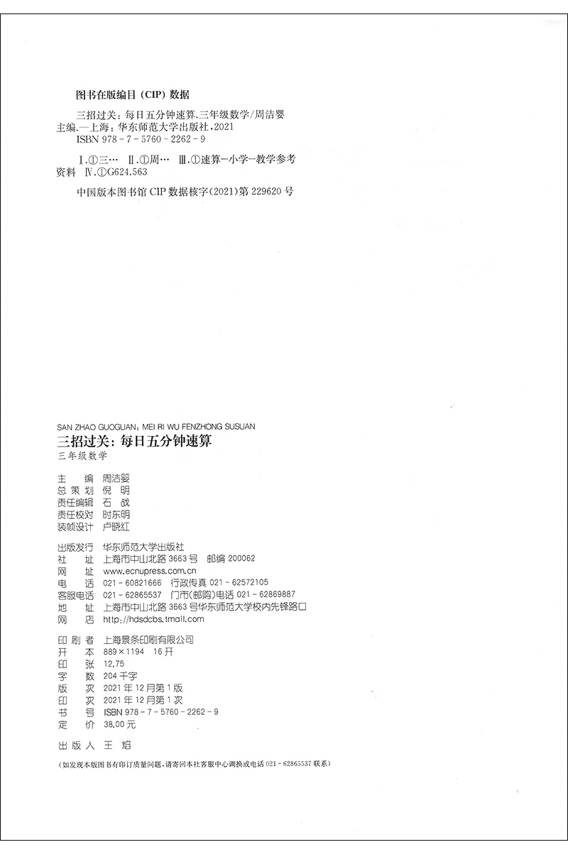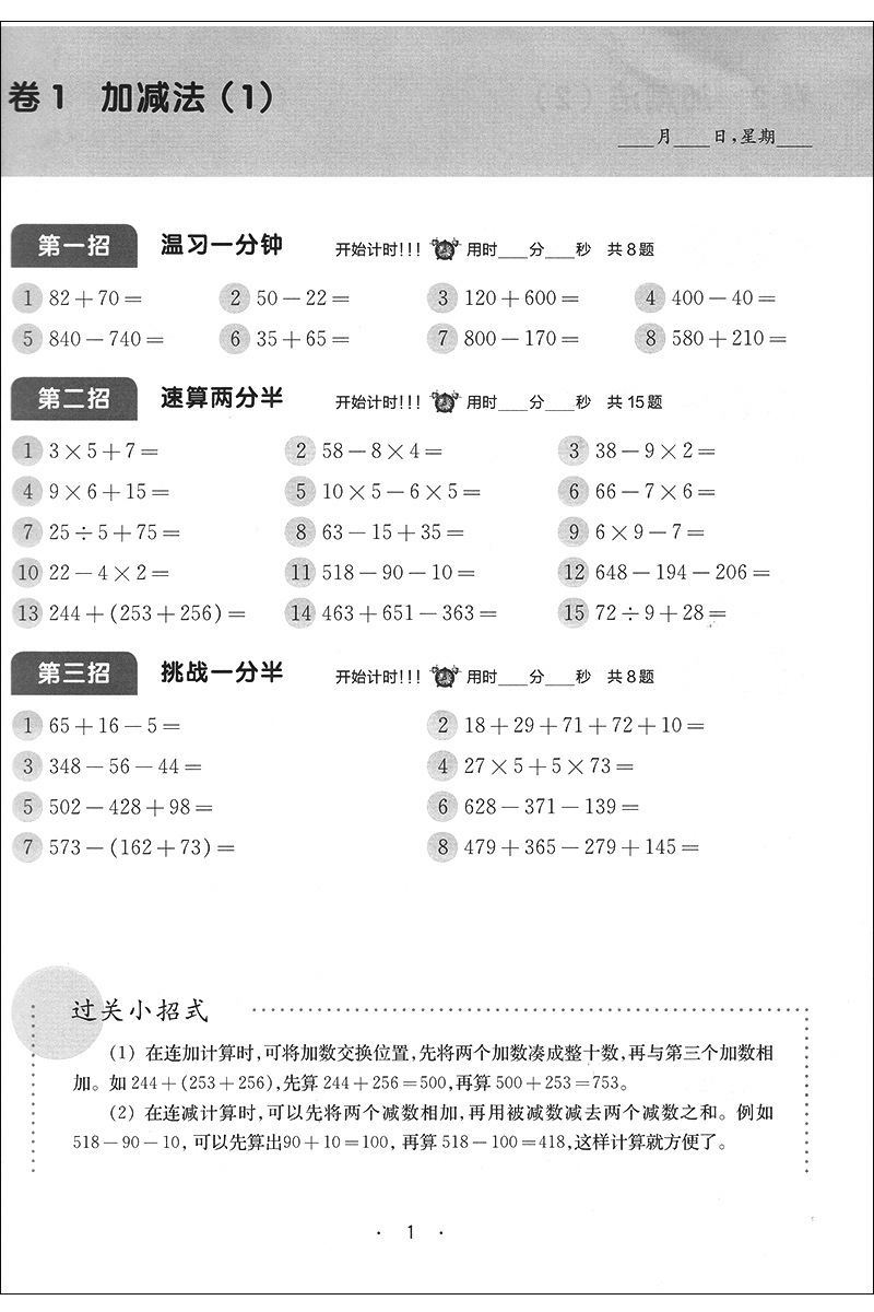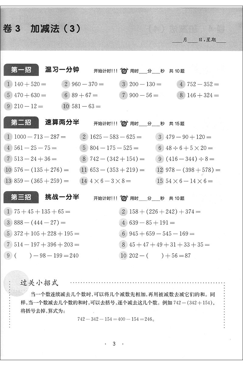 2022三招过关 每日五分钟速算 三年级(全一册) 3年级上下册上海版大字版小学口算心算速算天天练口算本加减乘除混合运算练习同步