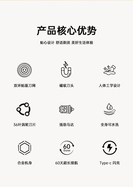 拒绝「拉扯感」→ 双环贴面刀网+磁吸刀头 拒绝「电量焦虑」→ Type-C闪充电 拒绝「胡茬残留」→ 36叶涡轮刀片+强劲马达 拒绝「LOW品质」→ 人体工学设计+合金机身 更舒适、更顺滑、防误触、经典配色、彰显品位 与其反复折腾,不如一次到位