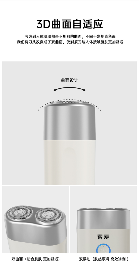 「360度浮动双刀头」 可以很轻松贴合面部轮廓,各种刁钻角度都能轻松拿捏 而且刮得又快又干净,超绝