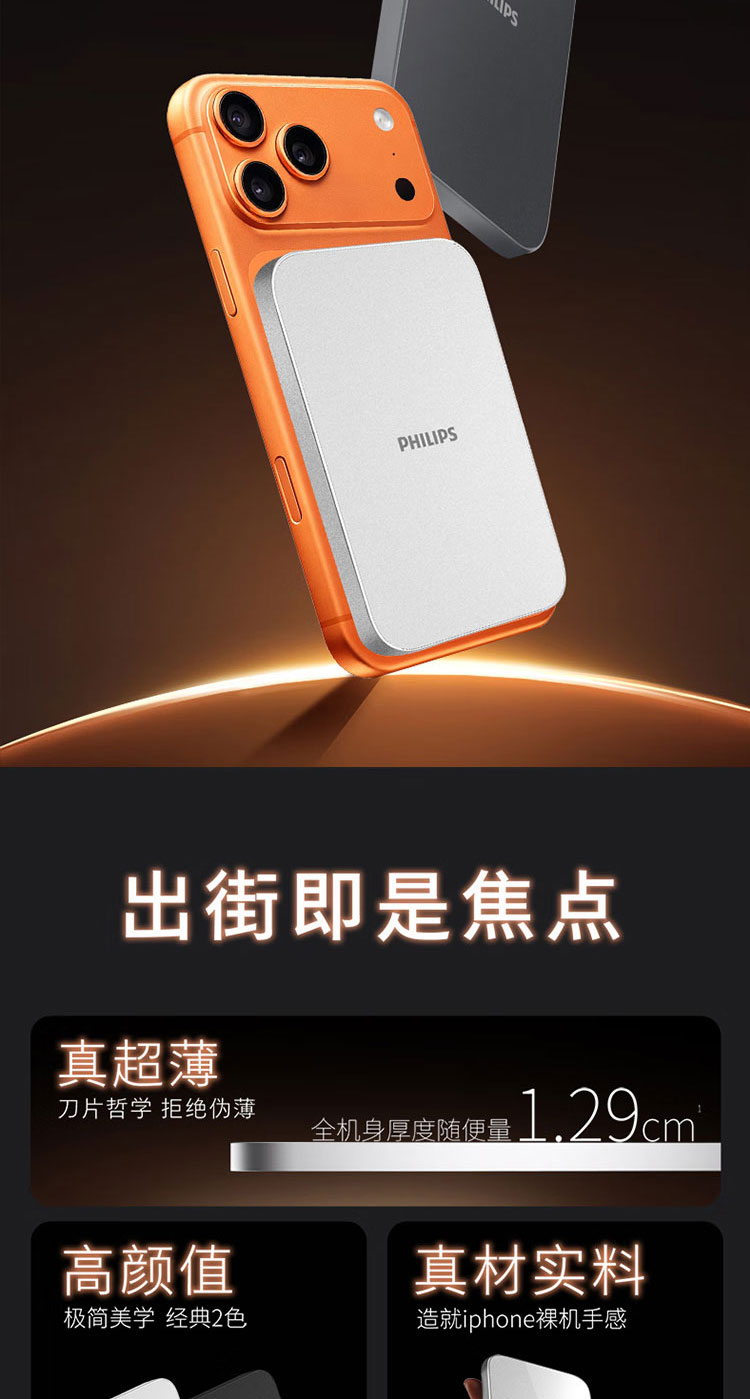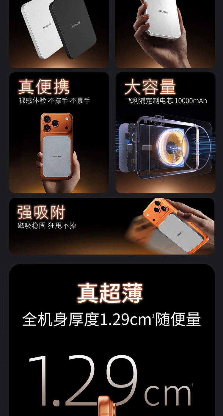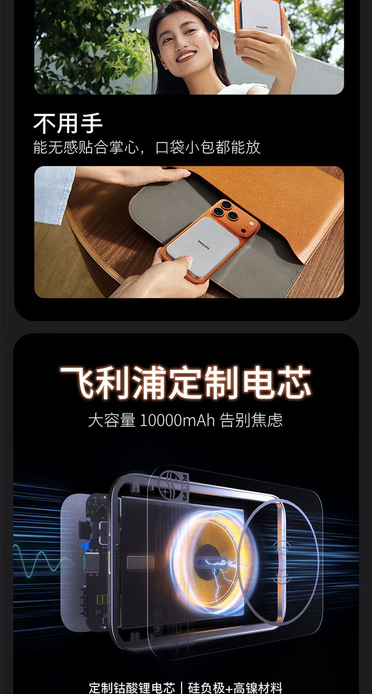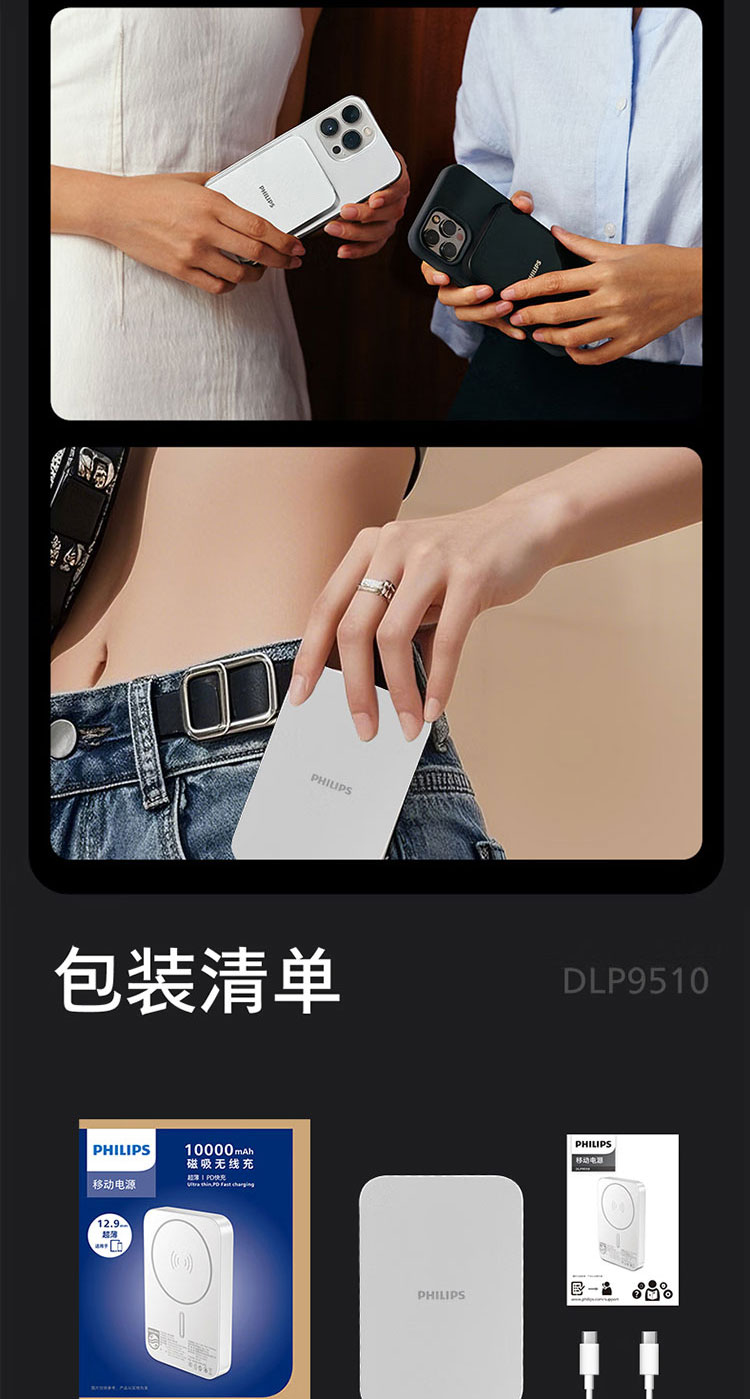 飞利浦【3C认证】超薄无线磁吸充电宝10000毫安大容量移动电源适用于苹果8-17可上飞机 DLP9510