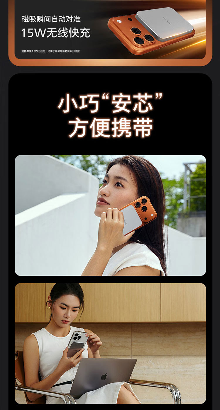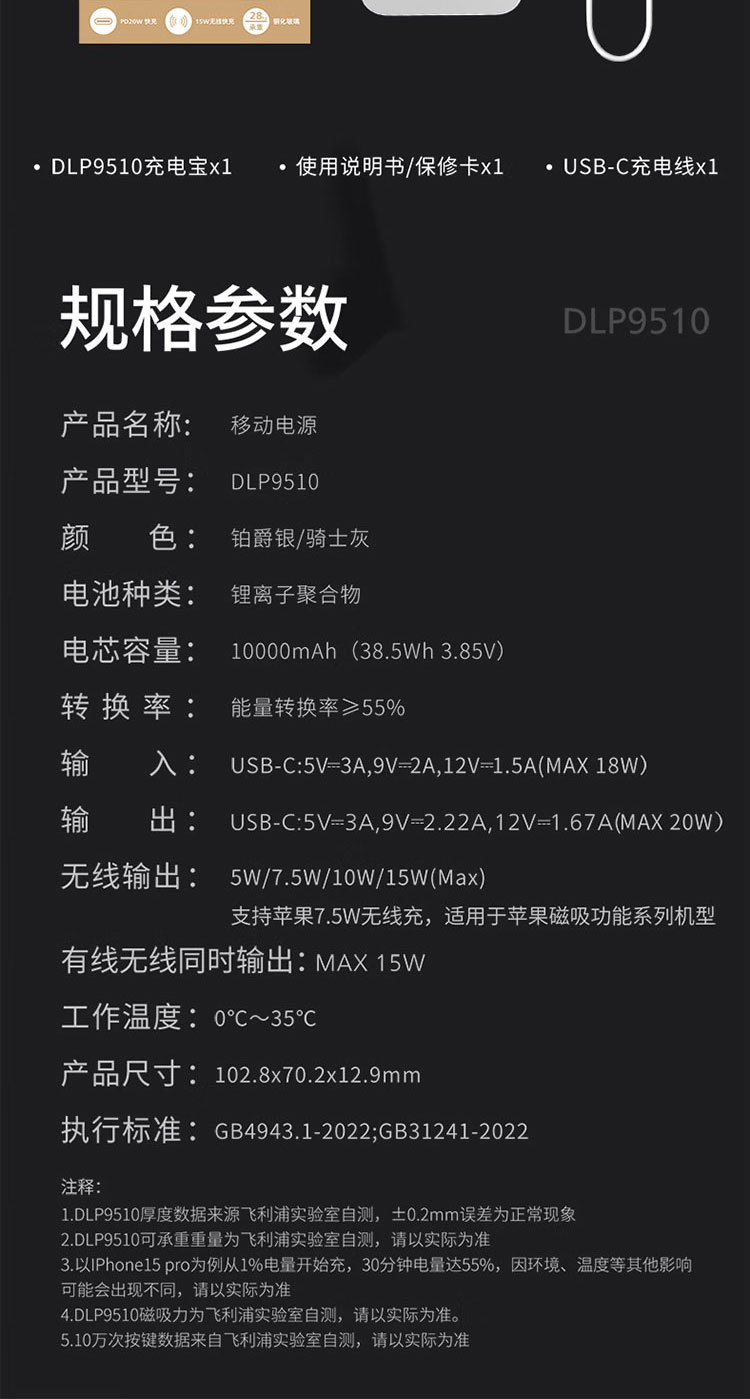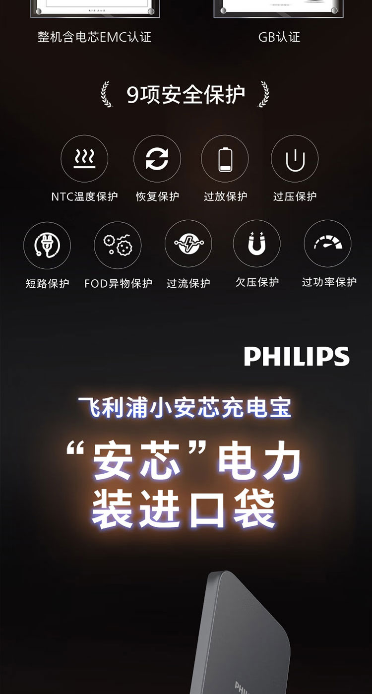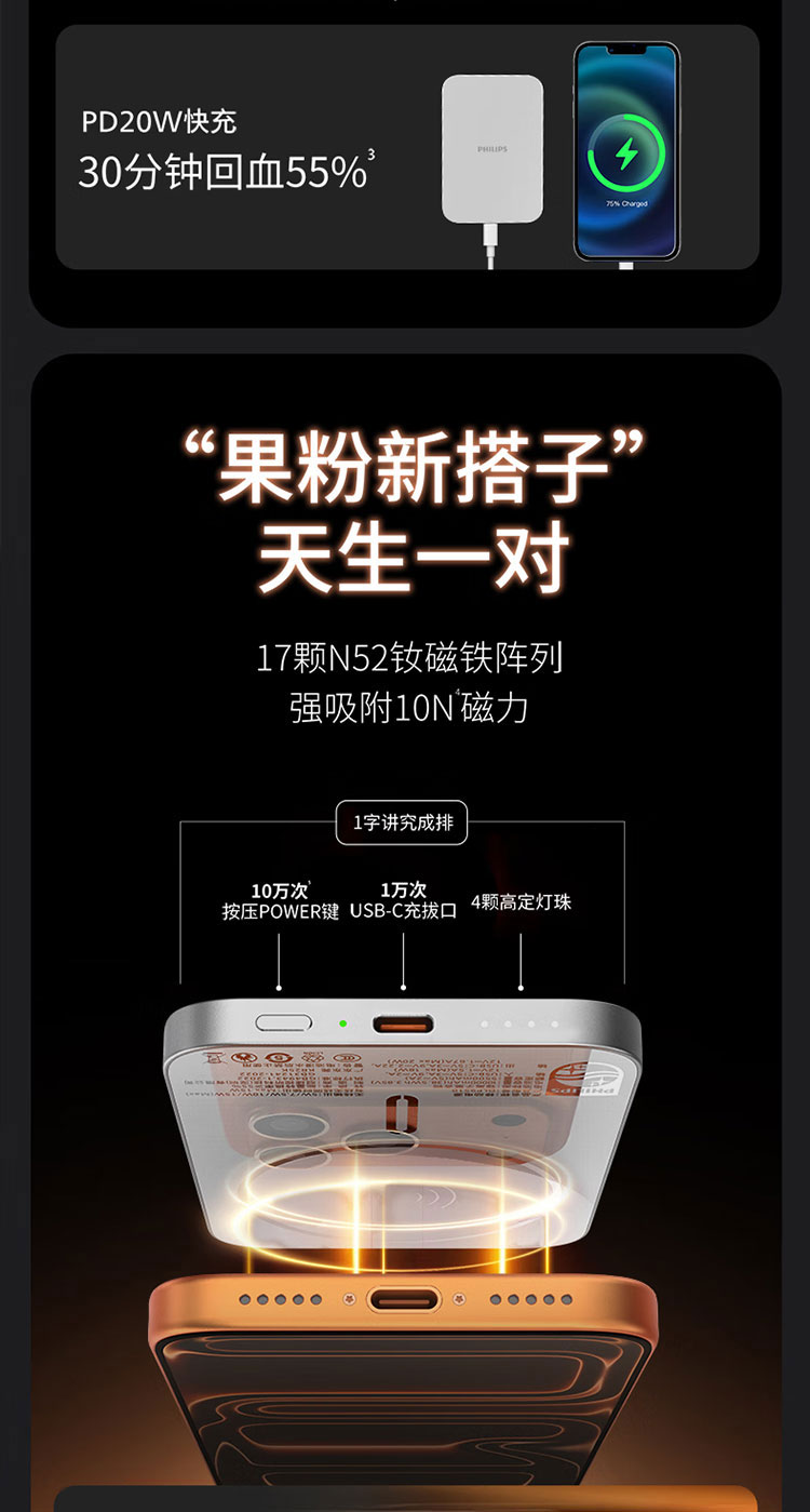 飞利浦【3C认证】超薄无线磁吸充电宝10000毫安大容量移动电源适用于苹果8-17可上飞机 DLP9510