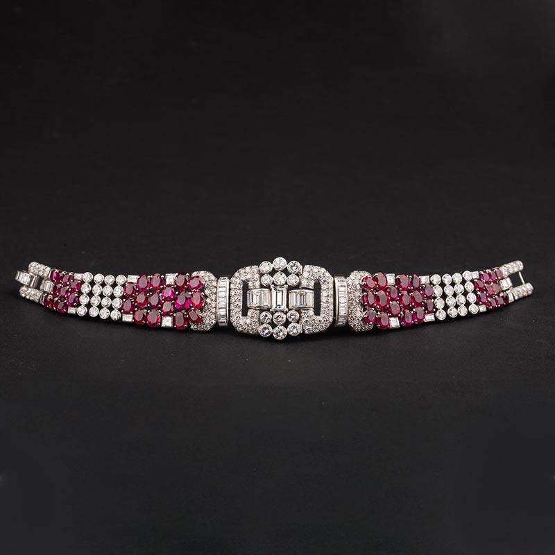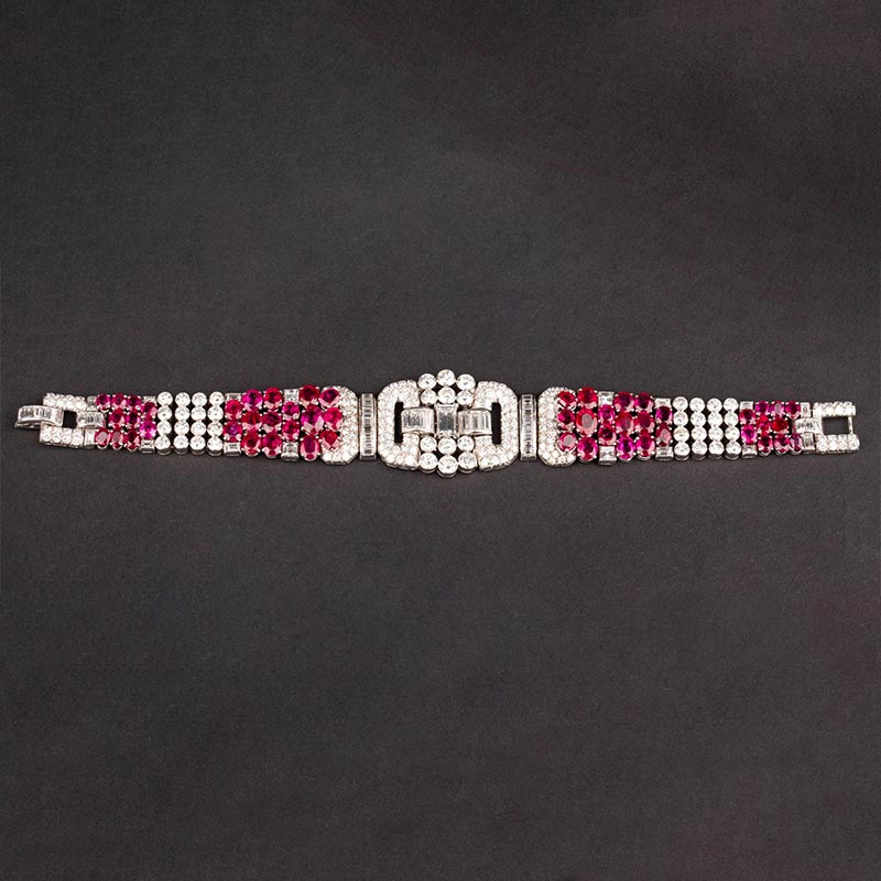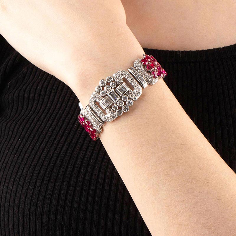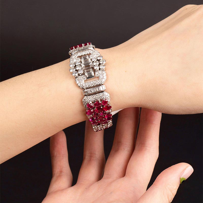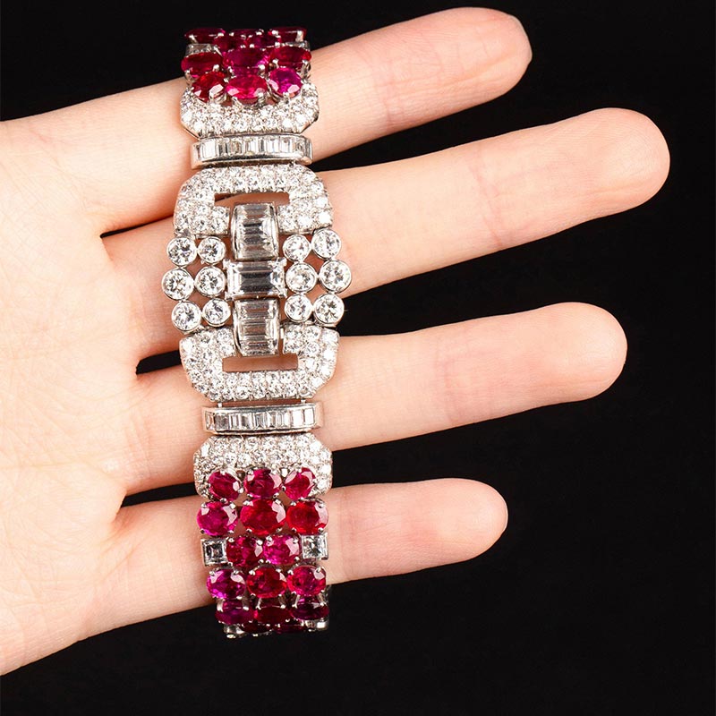 1930年代欧洲出品装饰艺术风格铂金镶嵌钻石及缅甸无烧红宝石手链