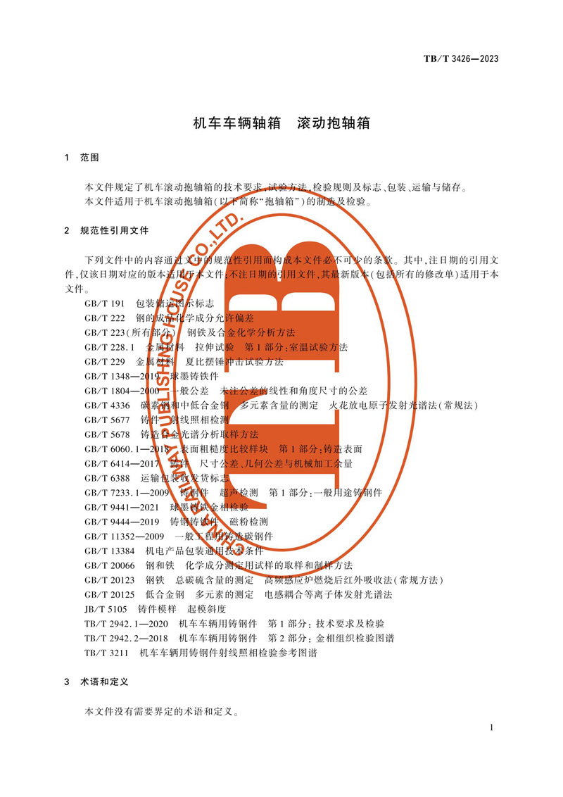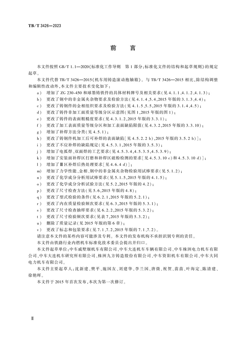 本标准为国家铁路局发布的铁道行业标准,为2023年第3批(共7项标准),铁标名称:《机车车辆轴箱 滚动抱轴箱》 TB/T 3426-2023,代替标准TB/T 3426—2015《机车用铸造滚动抱轴箱》。本文件规定了机车滚动抱轴箱的技术要求、试验方法、检验规则及标志、包装、运输与储存,本文件适用于机车滚动抱轴箱的制造及检验,本文件按照GB/T 1.1—2020《标准化工作导则 第1部分:标准化文件的结构和起草规则》的规定起草,由铁路行业内燃机车标准化技术委员会提出并归口。