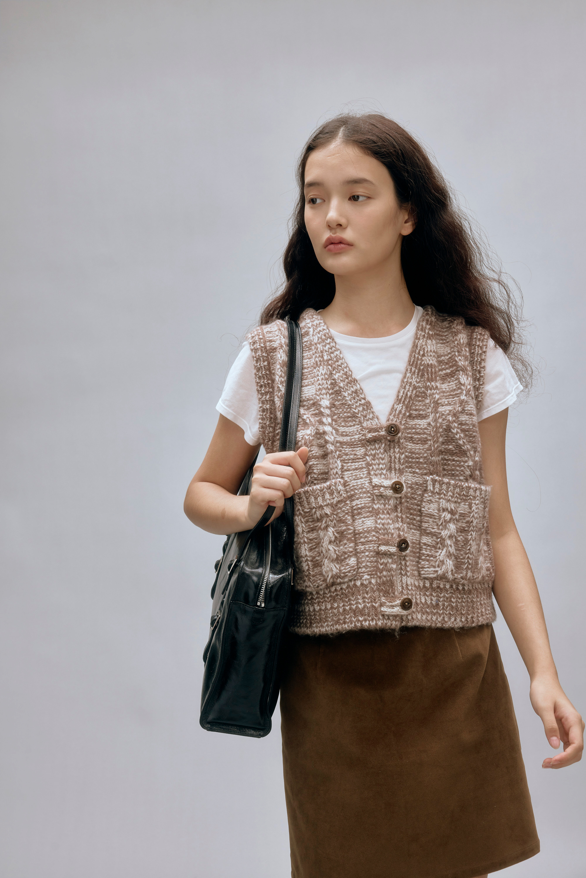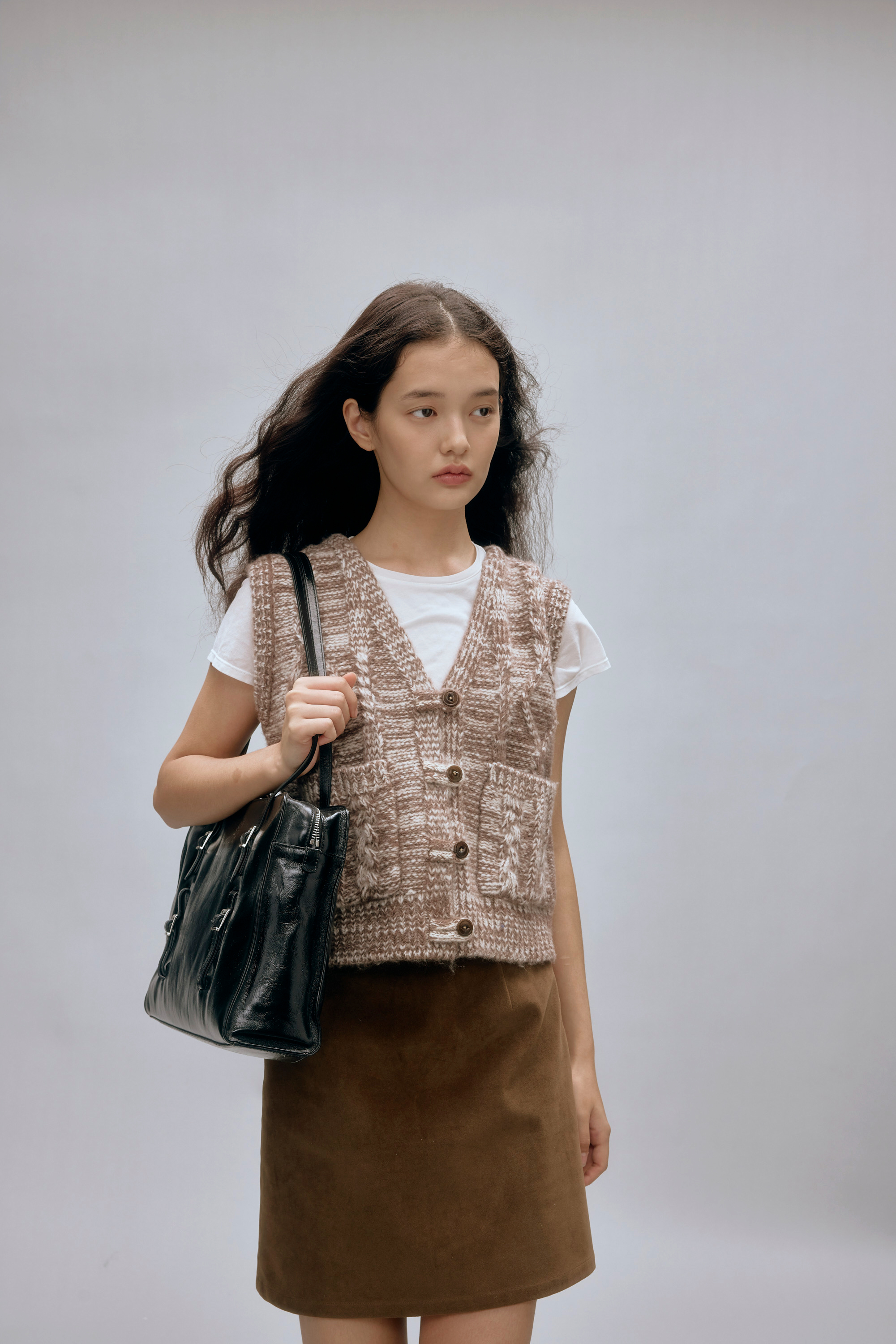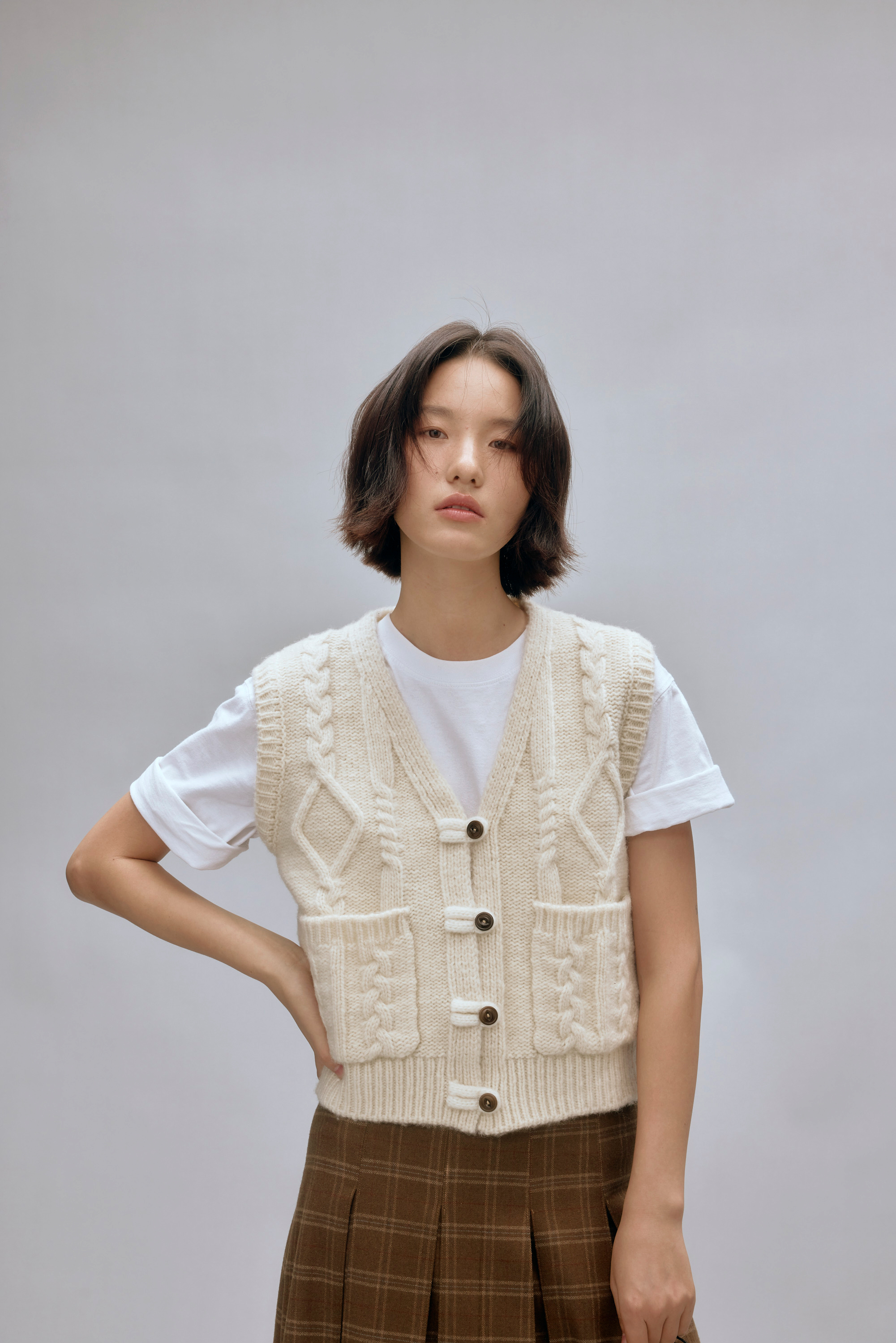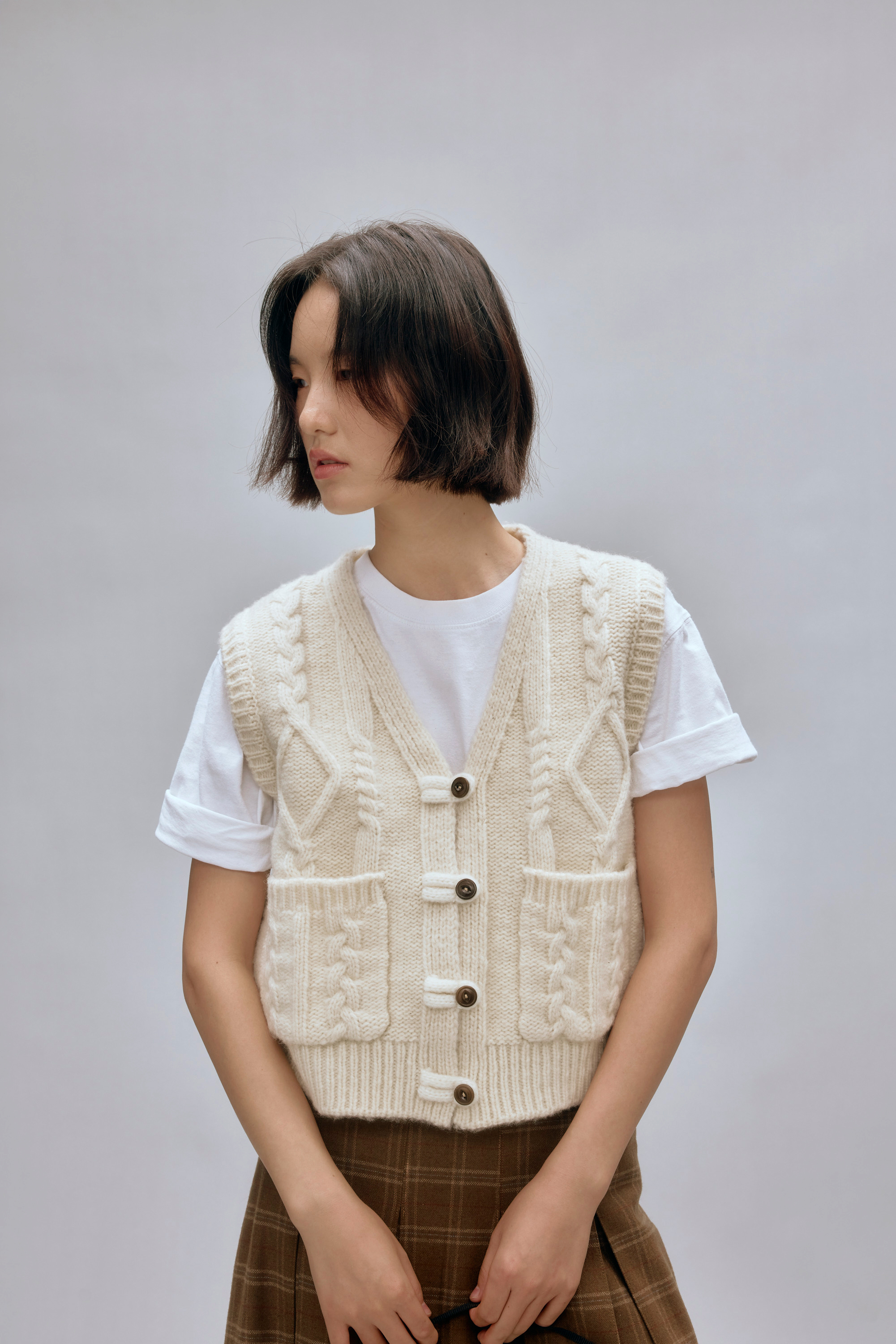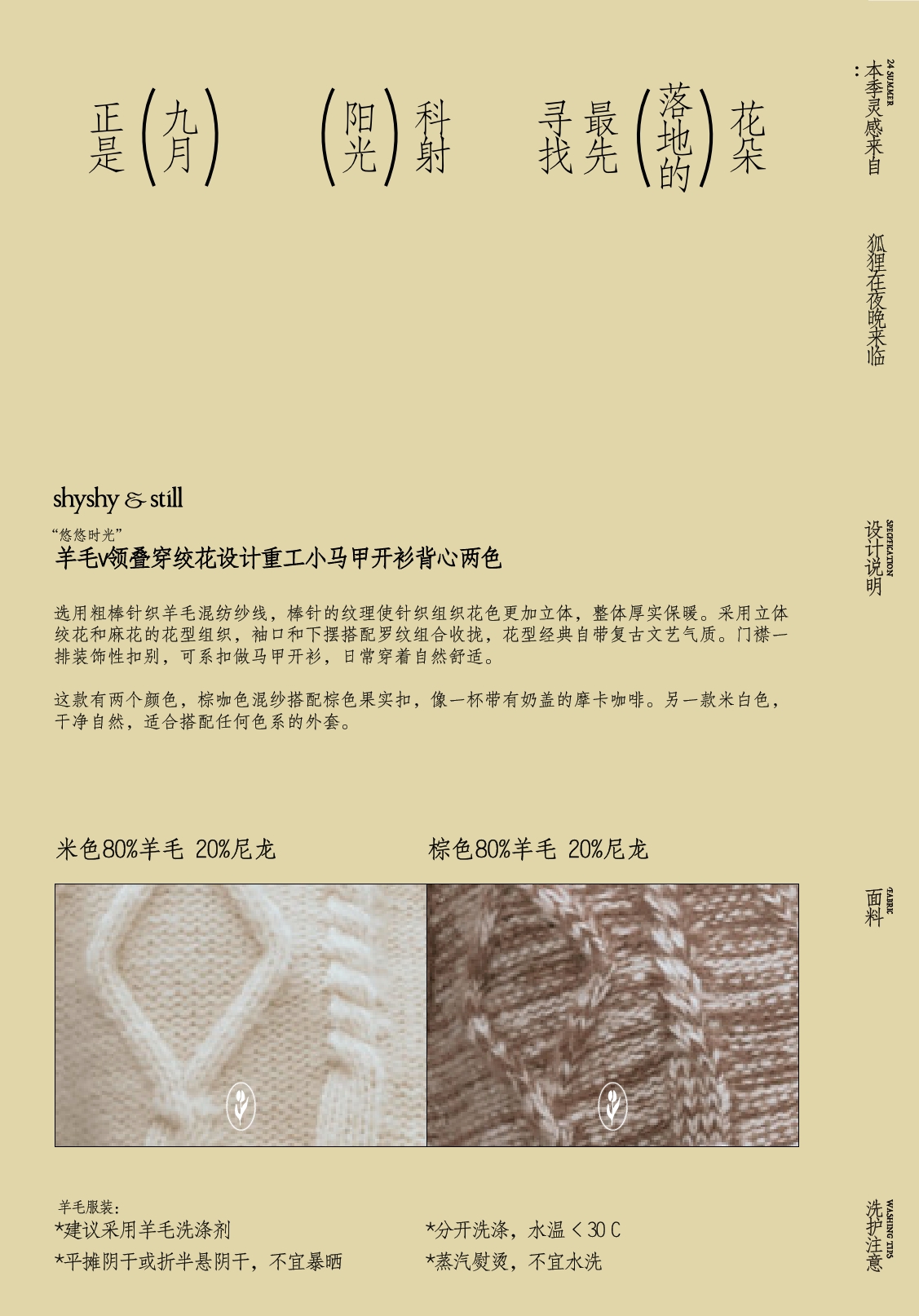 shyshystill/shy202408044/羊毛v领叠穿绞花设计重工小马甲开衫背心