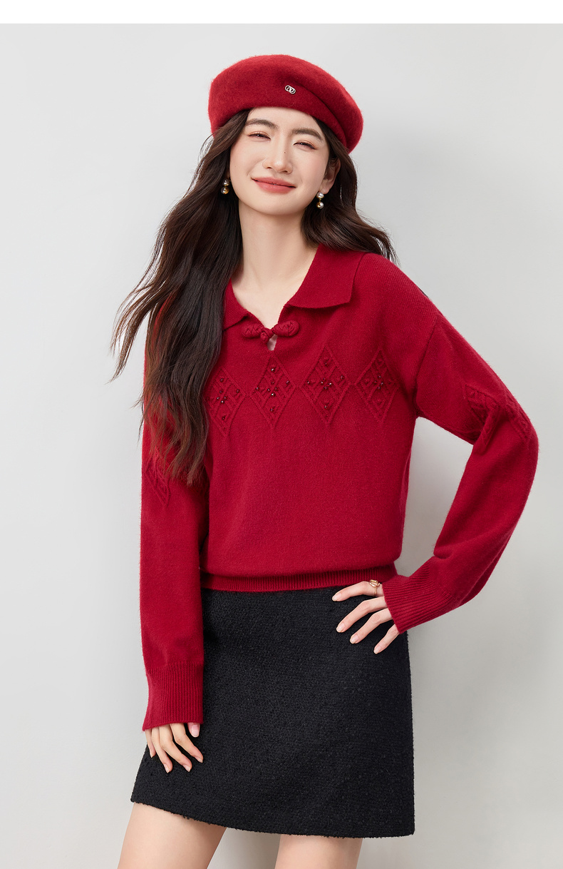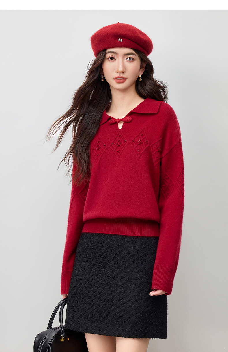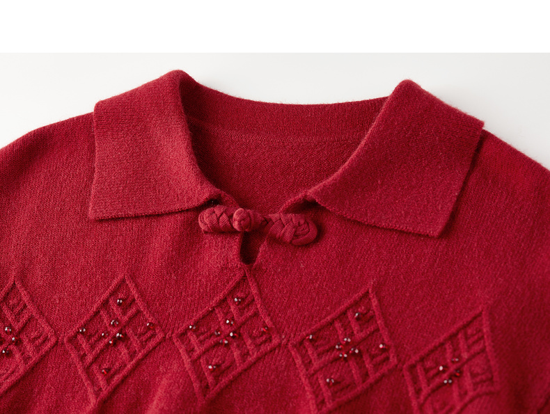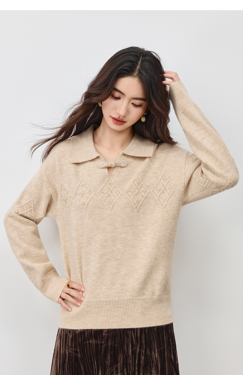 【内购】【钉珠菱格纹】优雅国风琵琶盘扣翻领宽松含绵羊毛弹力厚保暖毛衣-W54EH3950