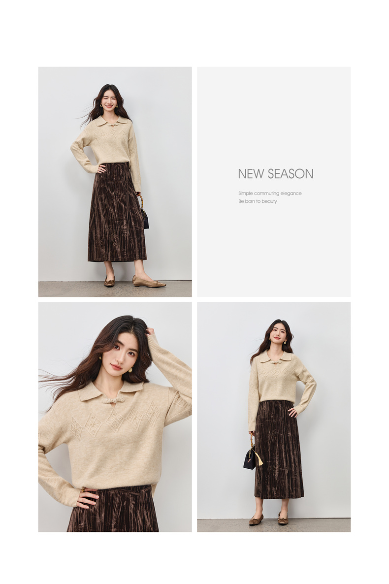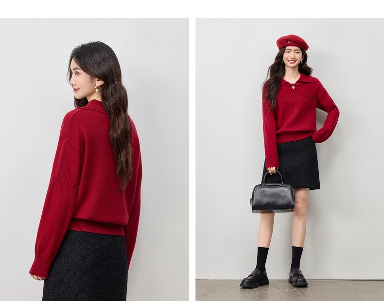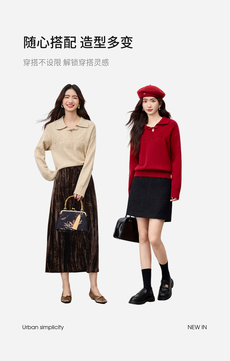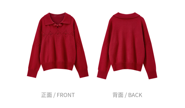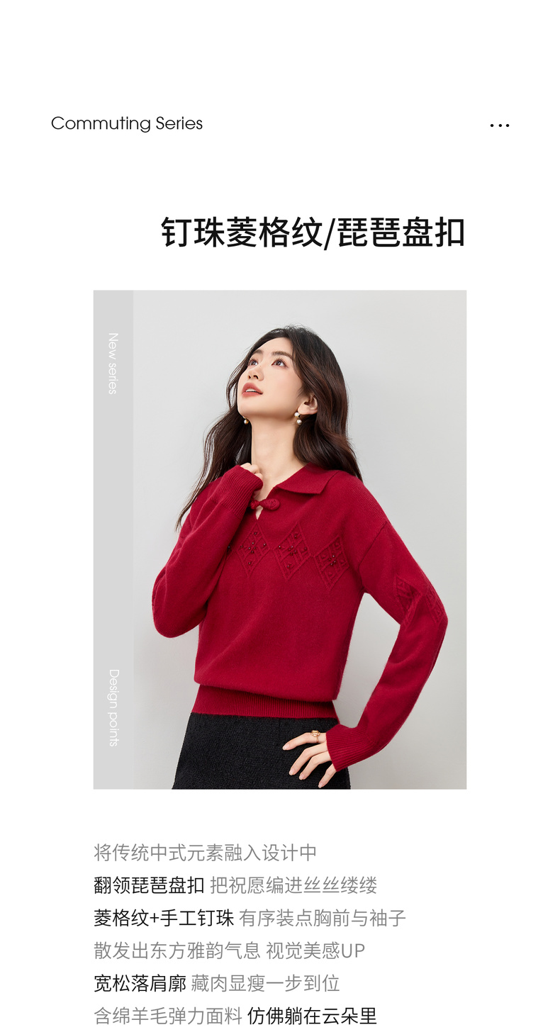 【内购】【钉珠菱格纹】优雅国风琵琶盘扣翻领宽松含绵羊毛弹力厚保暖毛衣-W54EH3950