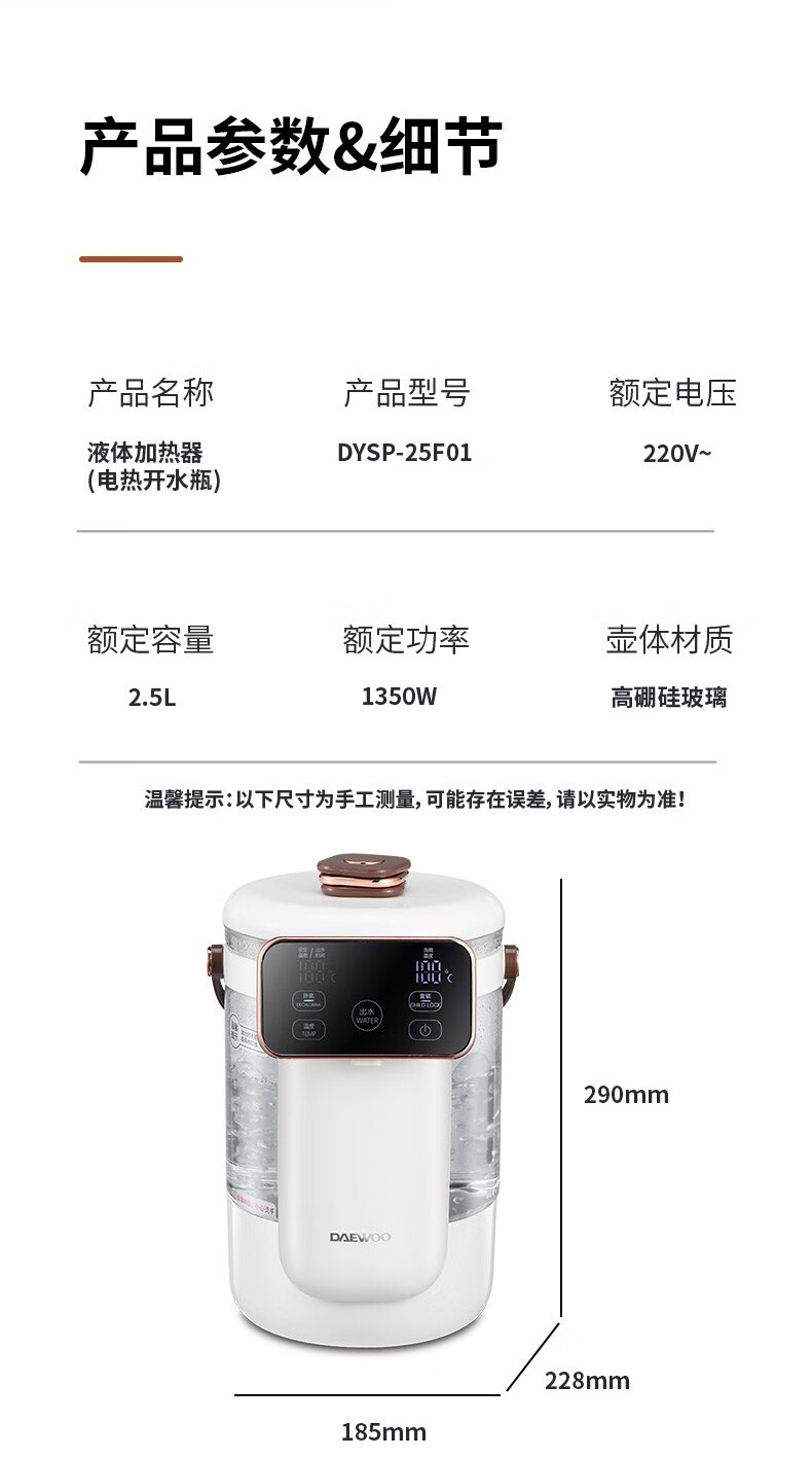 大宇(DAEWOO)电热水壶家用2.5L容量多段控温泡奶电热开水瓶DYSP-25F01 DYSP-25F01 2.5L