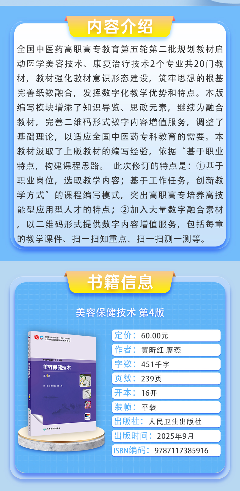 美容保健技术 第4四版 十四五规划教材 全国中医药高职高专教育教材 黄昕红 廖燕 主编 供医学美容技术专业用 人民卫生出版社