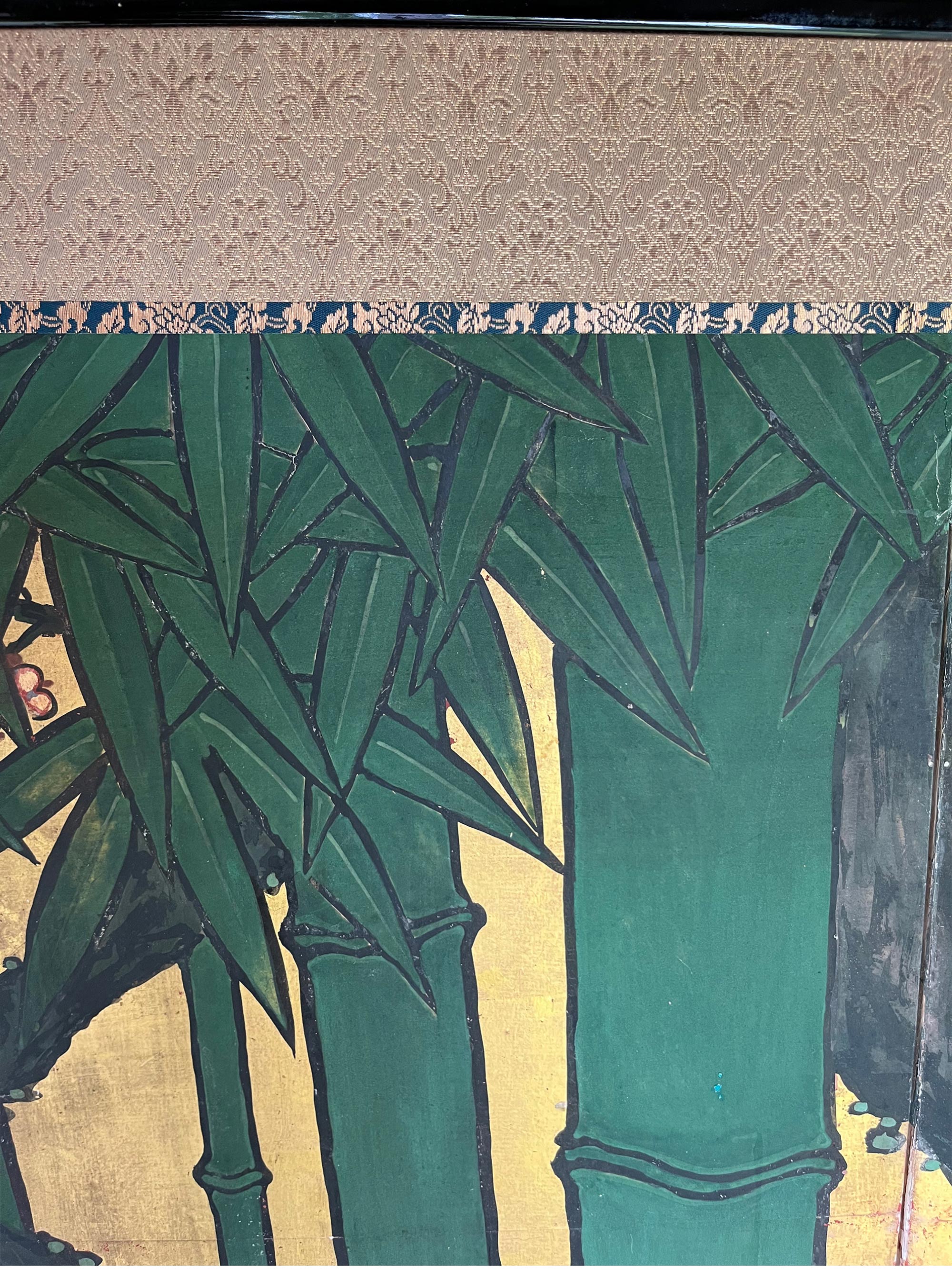 独角鹿西洋古董18世纪日本江户时期出品狩野派风格「竹岸群鹤」主题金地纸本设色六曲古董屏风