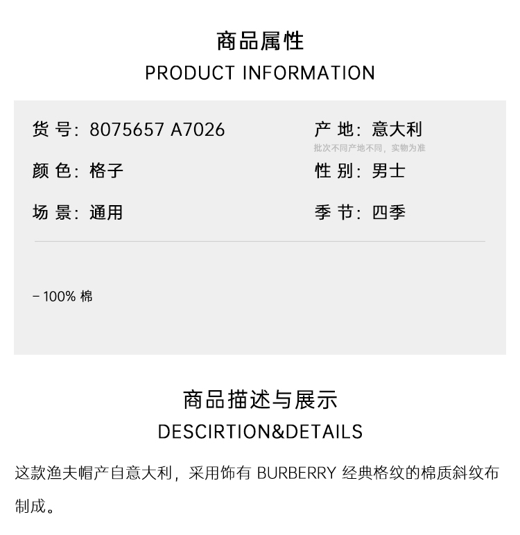 【二】BURBERRY 巴宝莉 男女通用格纹棉质渔夫帽 格子 8075657 A7026