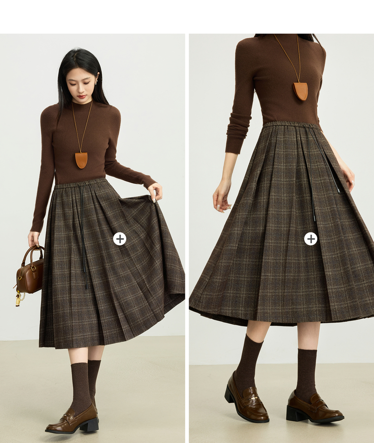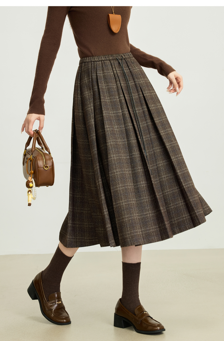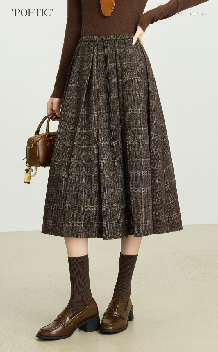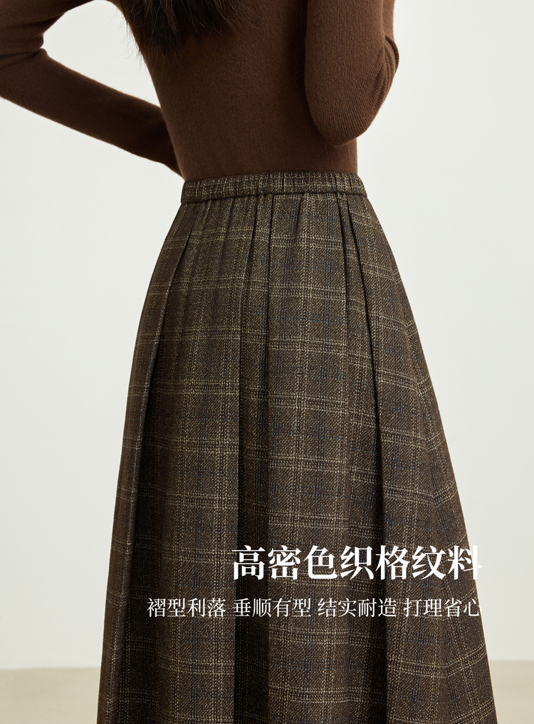 【10/29新品】熙世界复古格纹百褶半身裙女秋冬2025年新款高腰毛呢伞裙中长裙子