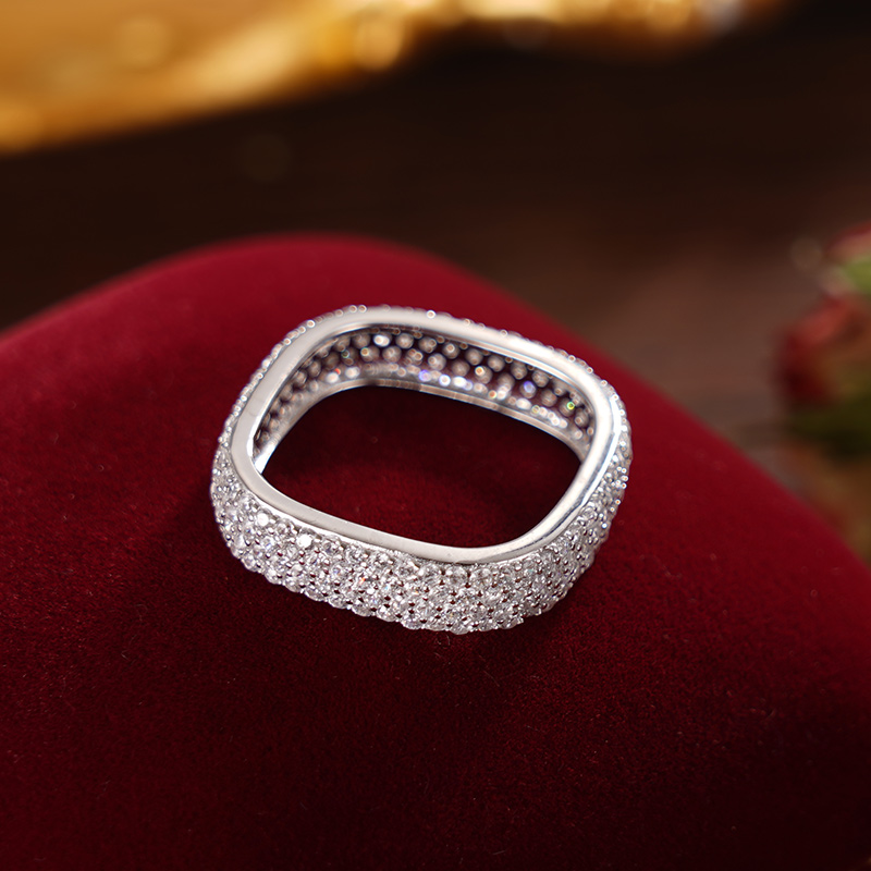 【寓意】:小众方形戒指,通体微镶锆石,如雪点缀指尖,灵动婉转,华贵优雅。寓意美丽年年,好运连绵。