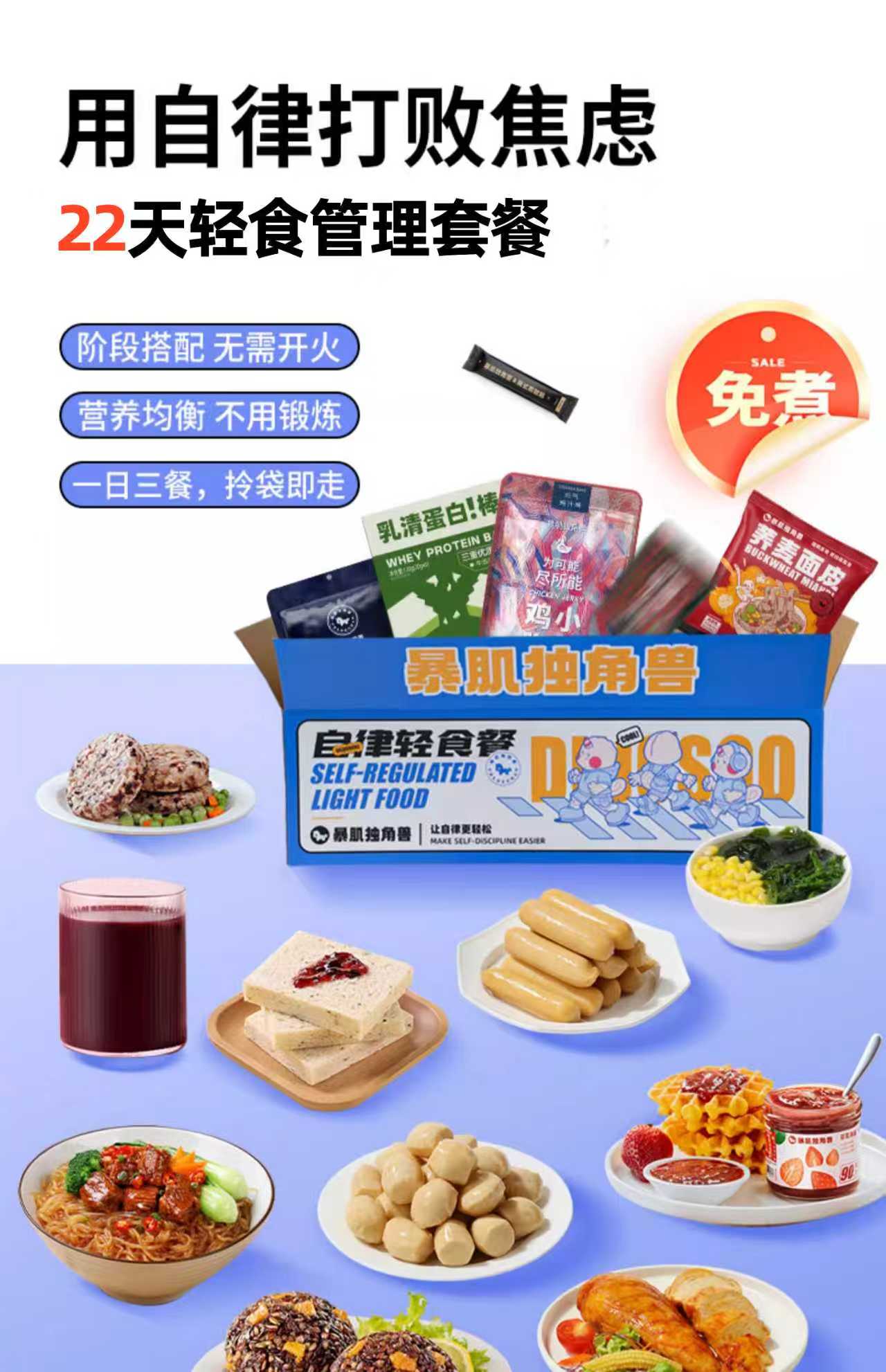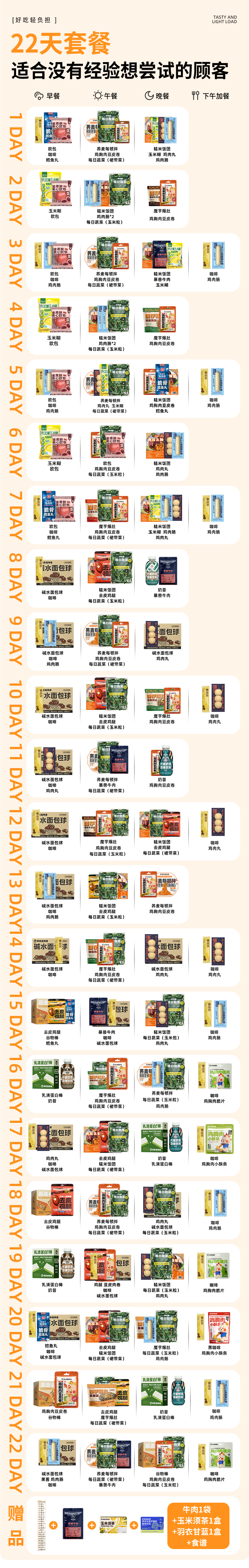 【22天全餐·10斤挑战】下单既赠4件大礼包:14顿加餐+高蛋白牛肉1袋+羽衣甘蓝1盒+玉米须茶1盒]身材管理轻食全餐、助力轻装上阵~