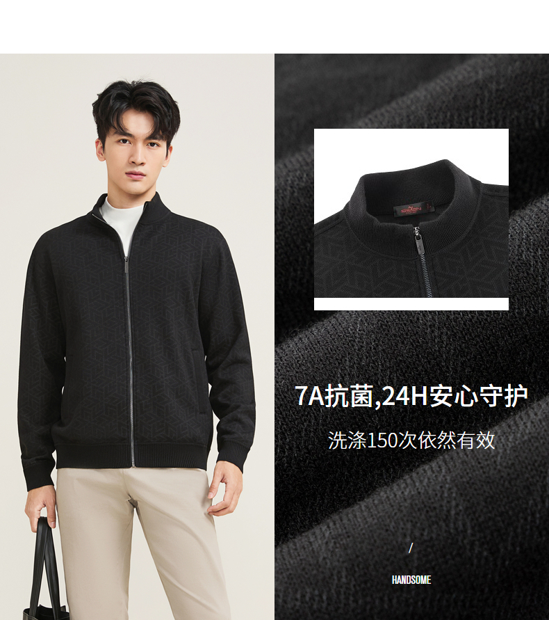 【7A抗菌/加绒/含羊毛】柒牌男士开襟毛衫时尚休闲立领针织衫毛衣