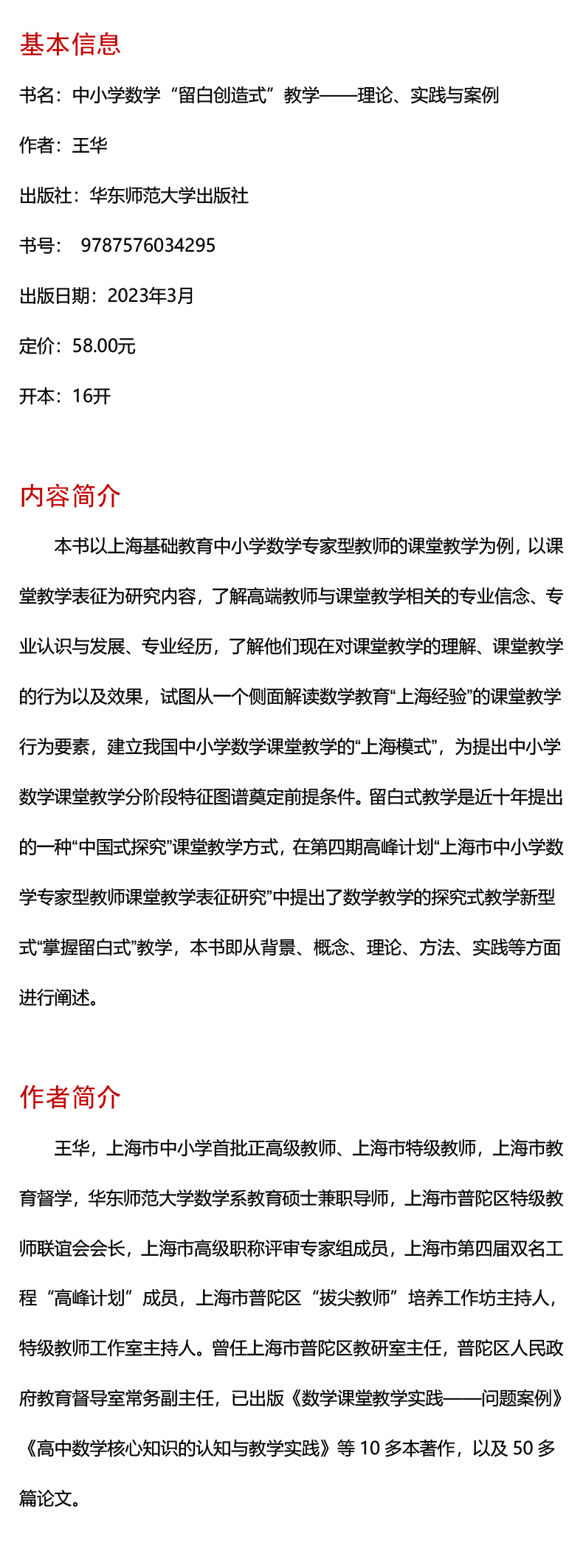 本书以上海基础教育中小学数学专家型教师的课堂教学为例,以课堂教学表征为研究内容,了解高端教师与课堂教学相关的专业信念、专业认识与发展、专业经历,了解他们现在对课堂教学的理解、课堂教学的行为以及效果,试图从一个侧面解读数学教育“上海经验”的课堂教学行为要素,建立我国中小学数学课堂教学的“上海模式”,为提出中小学数学课堂教学分阶段特征图谱奠定前提条件。留白式教学是近十年提出的一种“中国式探究”课堂教学方式,在第四期高峰计划“上海市中小学数学专家型教师课堂教学表征研究”中提出了数学教学的探究式教学新型式“掌握留白式”教学,本书即从背景、概念、理论、方法、实践等方面进行阐述。