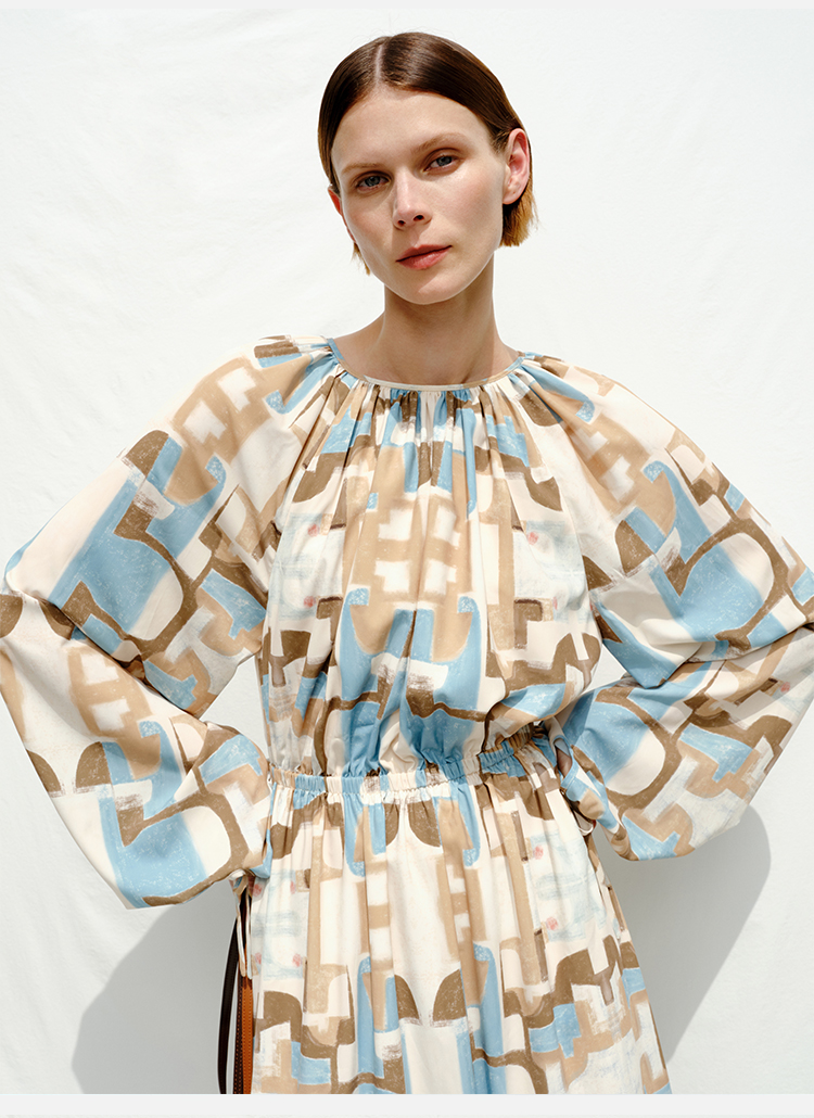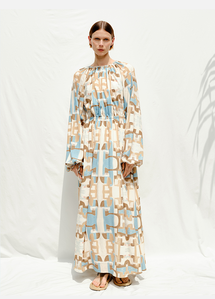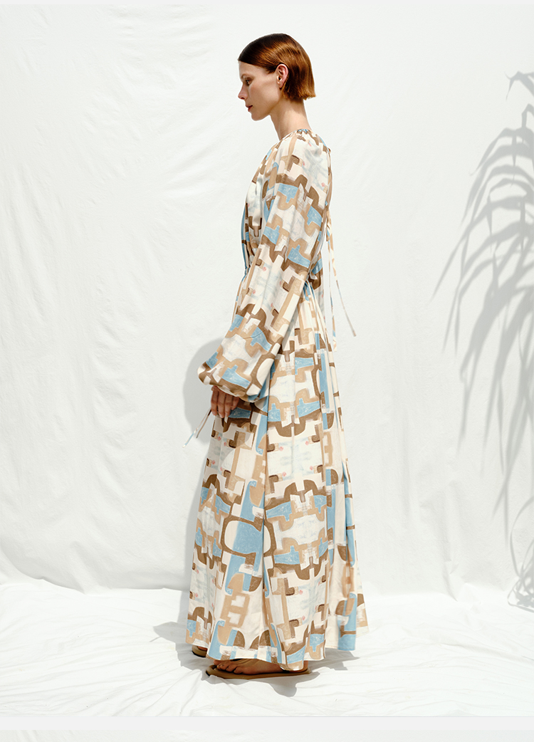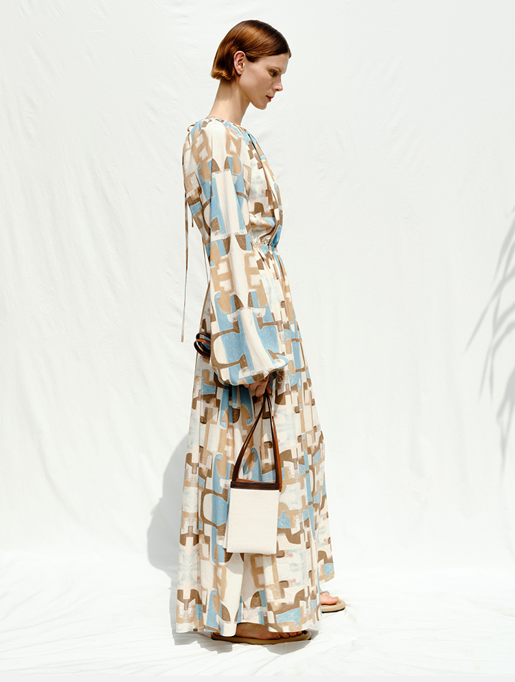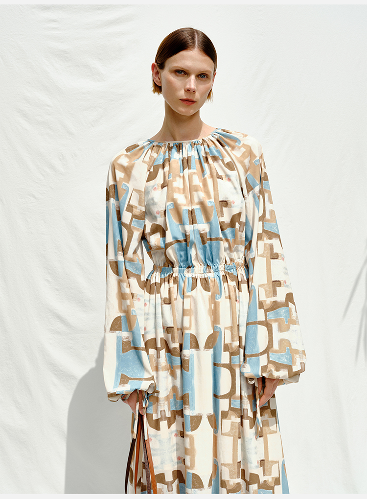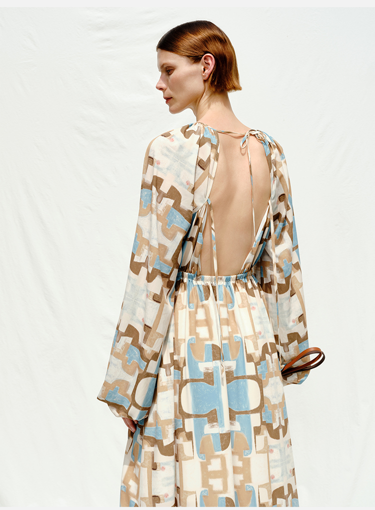 HIDEMI 抽象油画印花缎面露背系带设计感灯笼袖连衣裙