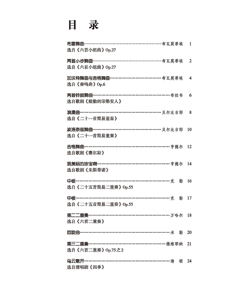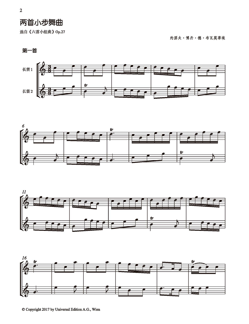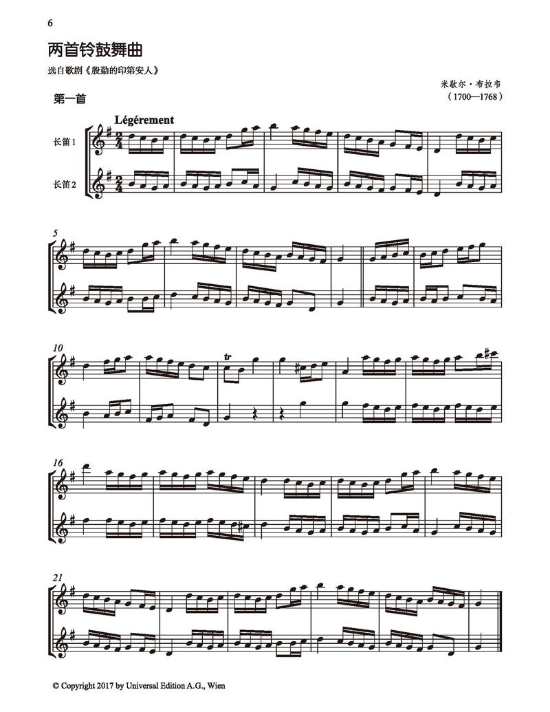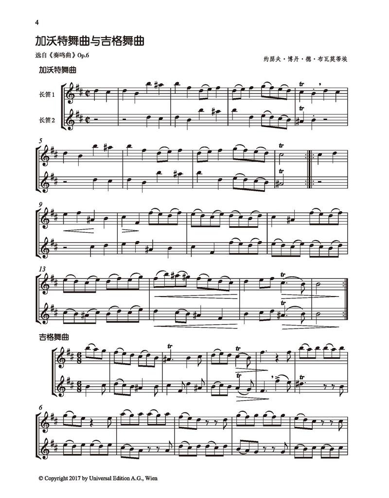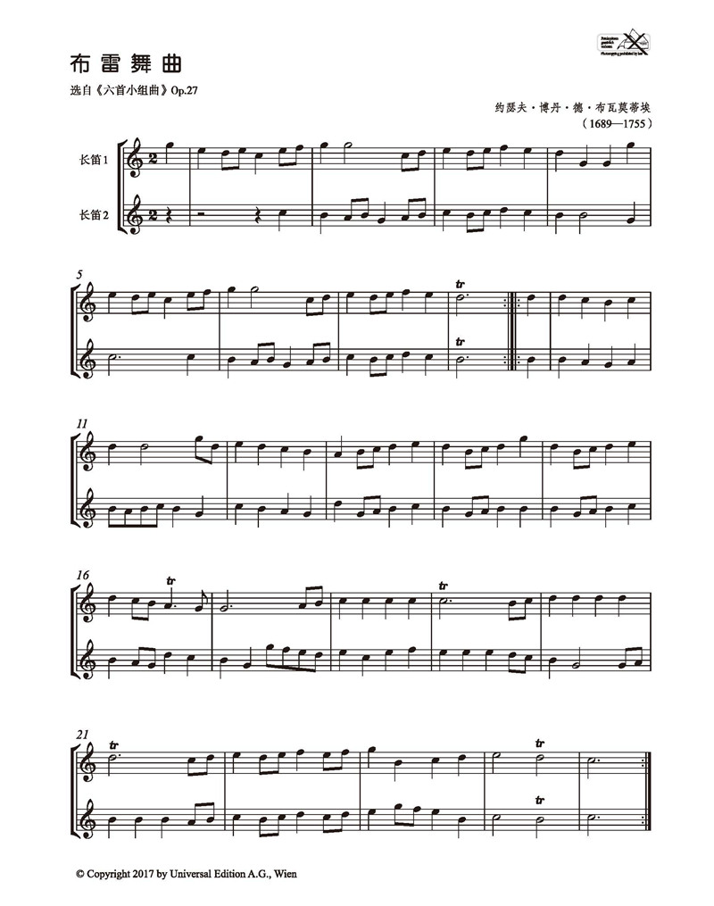 引进自奥地利百年名社环球音乐出版有限公司,他们编有大量长笛初级曲集,也将许多世界名曲改编为长笛合奏作品。本系列共包含六本曲谱,其中两本带有钢琴伴奏的长笛改编曲,两本长笛三重奏和四重奏曲集,此次出版的为两本二重奏世界名曲集,本系列不但包含独奏作品,还包括两种合奏形式,是市场上为数不多多种演奏形式的长笛曲集,不失为音乐会选曲的最佳曲库。