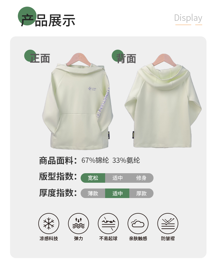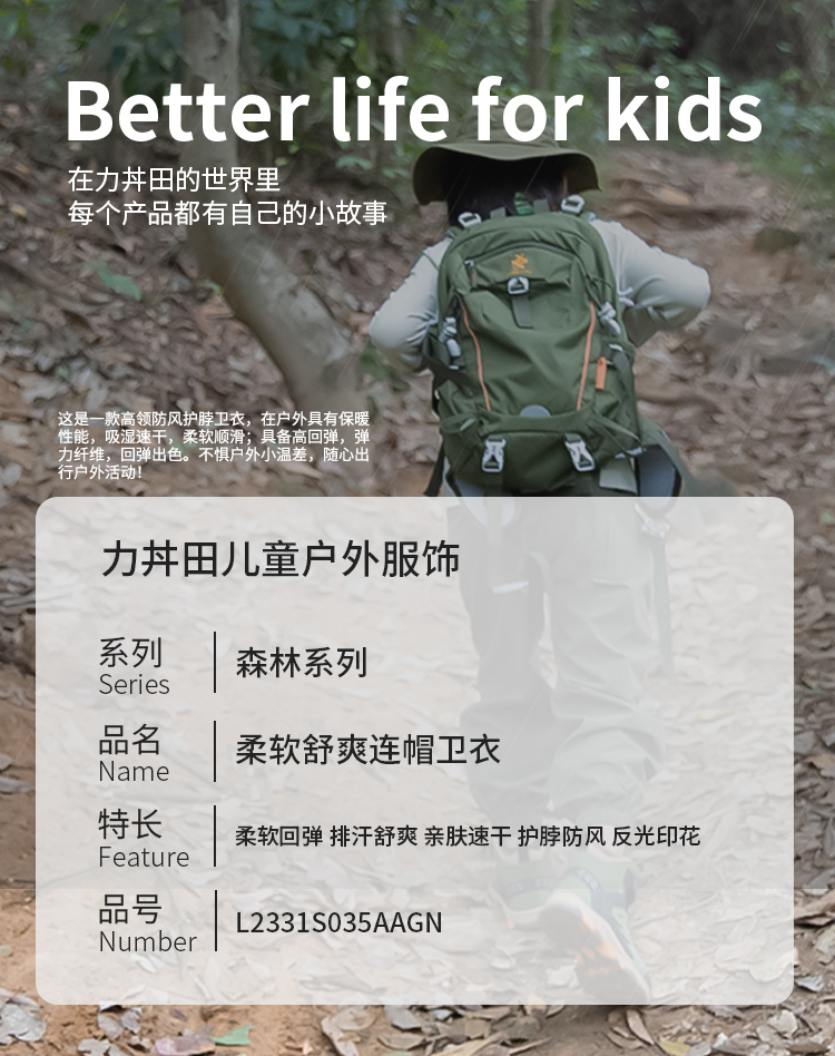 力丼田儿童户外森林系列 连帽运动卫衣 冰感吸湿排汗柔软舒适 L2331S035CAGN