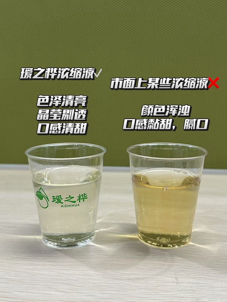 浓缩汁色泽微黄,但也是清亮透明的,透光度非常好,不会颜色太深或有浑浊。