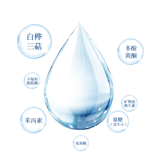 60+营养素,含有白桦酯醇和白桦酯酸等桦树汁特异性活性成分,以及17中氨基酸;8种微量矿物元素;8中不饱和脂肪酸;多种黄铜多酚、维生素等易于人体吸收的营养物质。