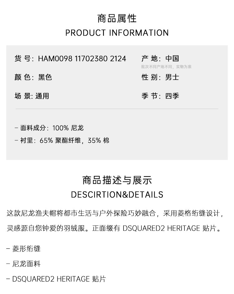 DSQUARED2 男士字母徽标贴片绗缝渔夫帽 黑色 HAM0098 11702380 2124