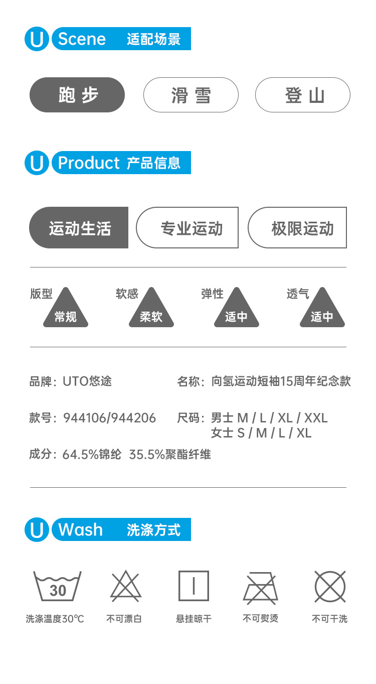 UTO悠途向氢男女运动短袖15周年纪念款薄款吸汗弹力快干休闲短袖