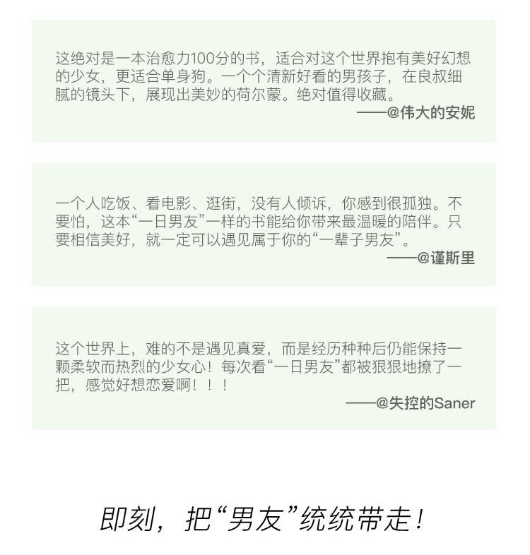 绝对是一本治愈力100分的书,适合对这个世界抱有美好幻想的少女,更适合单身狗。一个个清新好看的男孩子,在良叔细腻的镜头下,展现出美妙的荷尔蒙。绝对值得收藏。